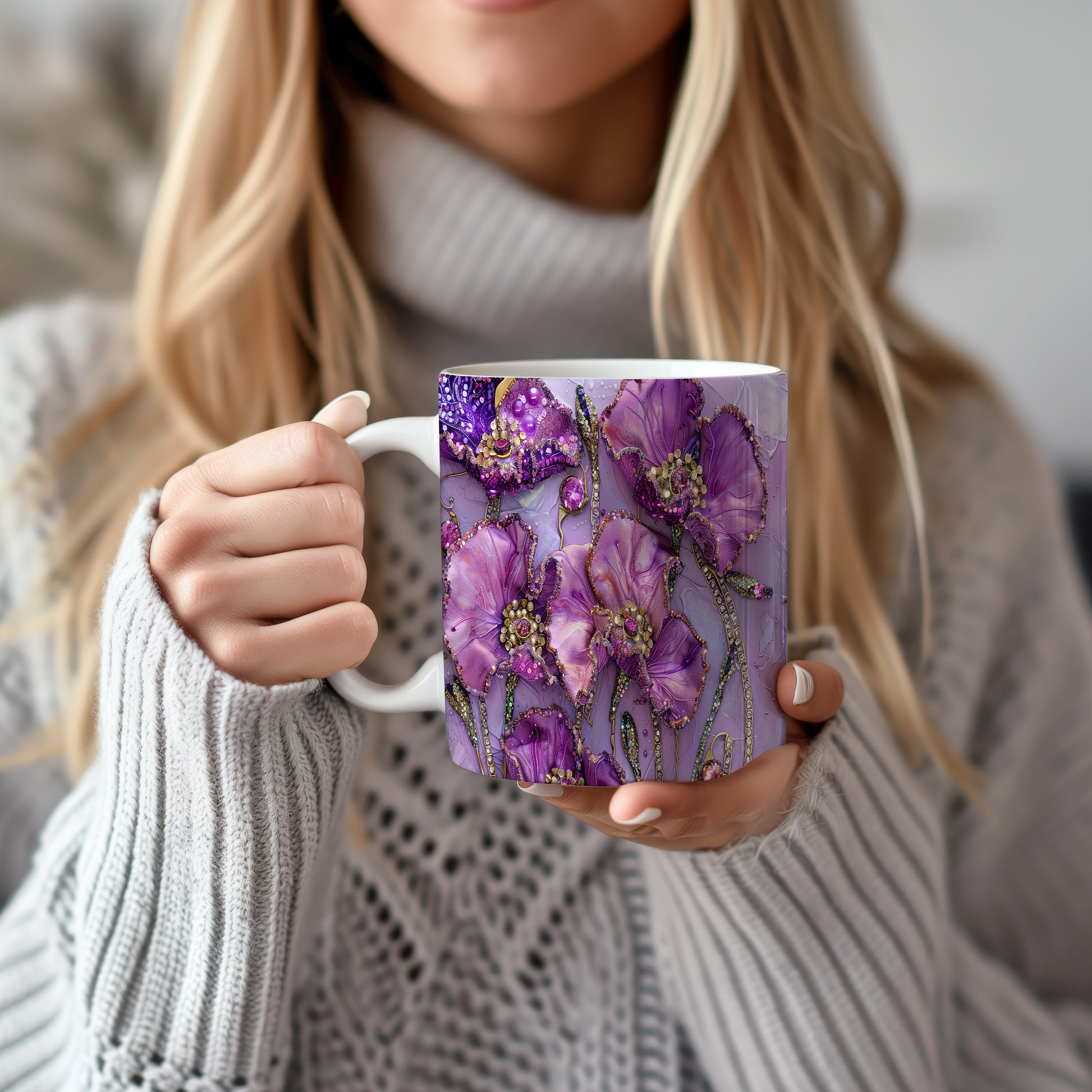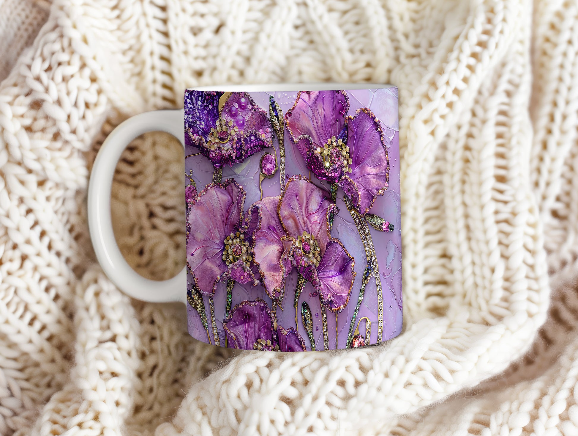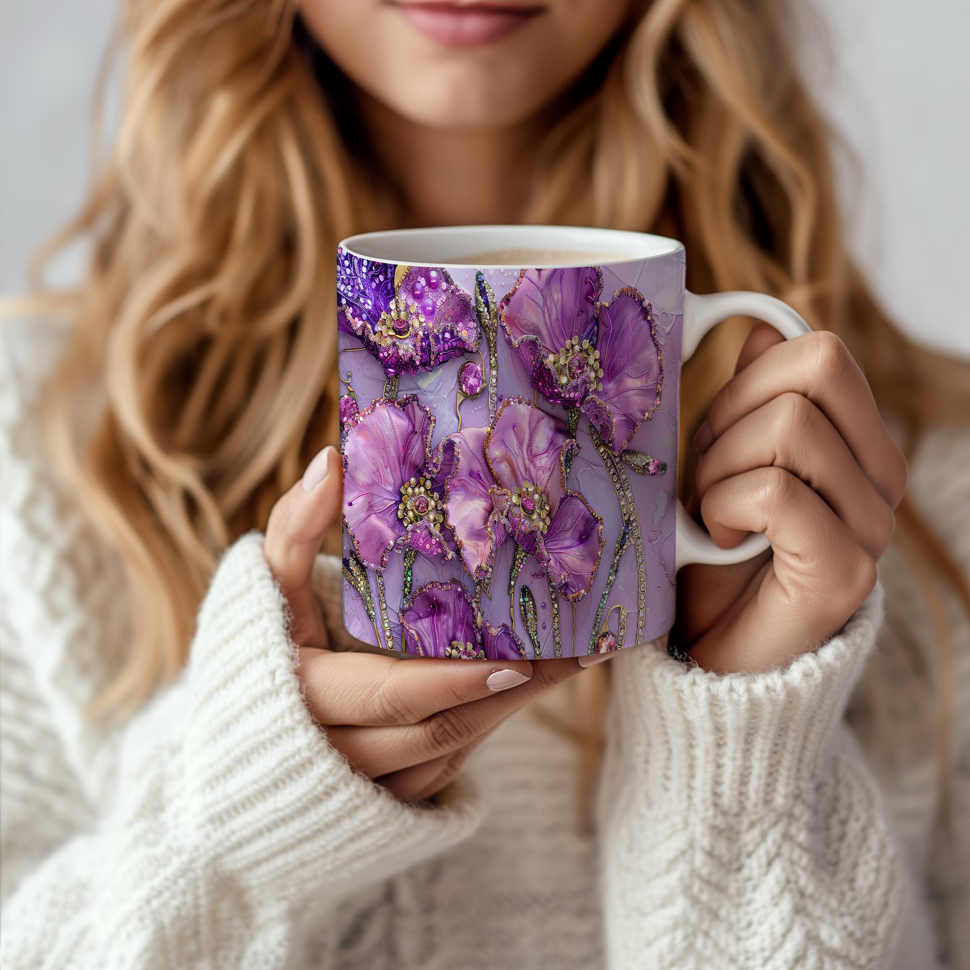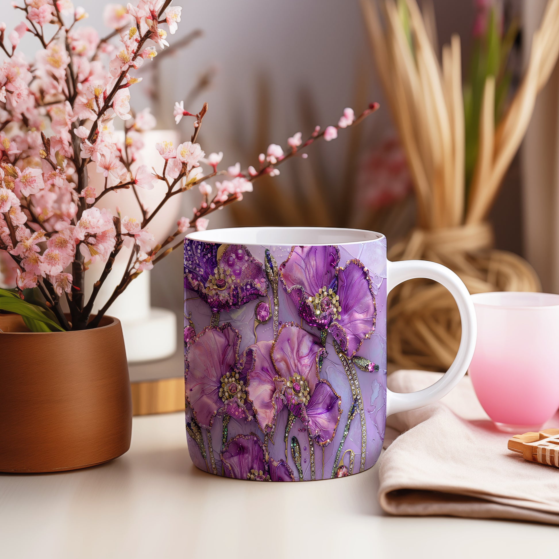 Hrnek s elegantními fialovými květinami a zlatými detaily