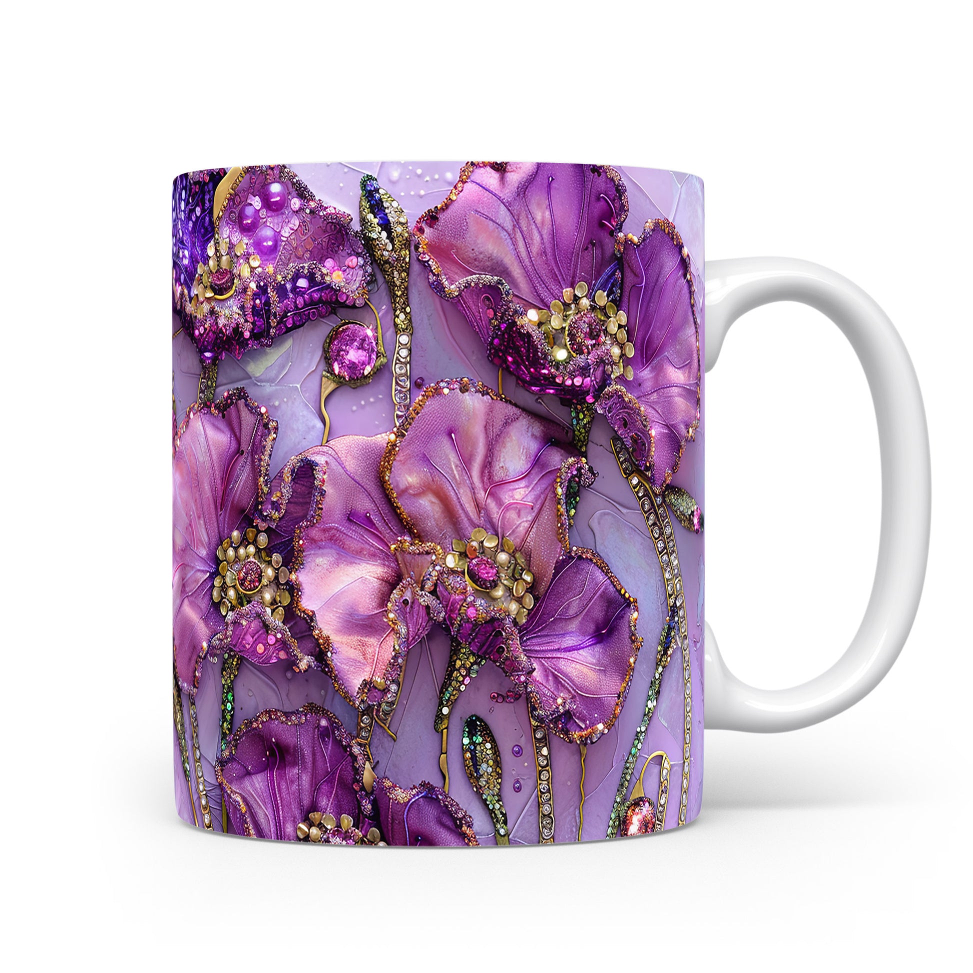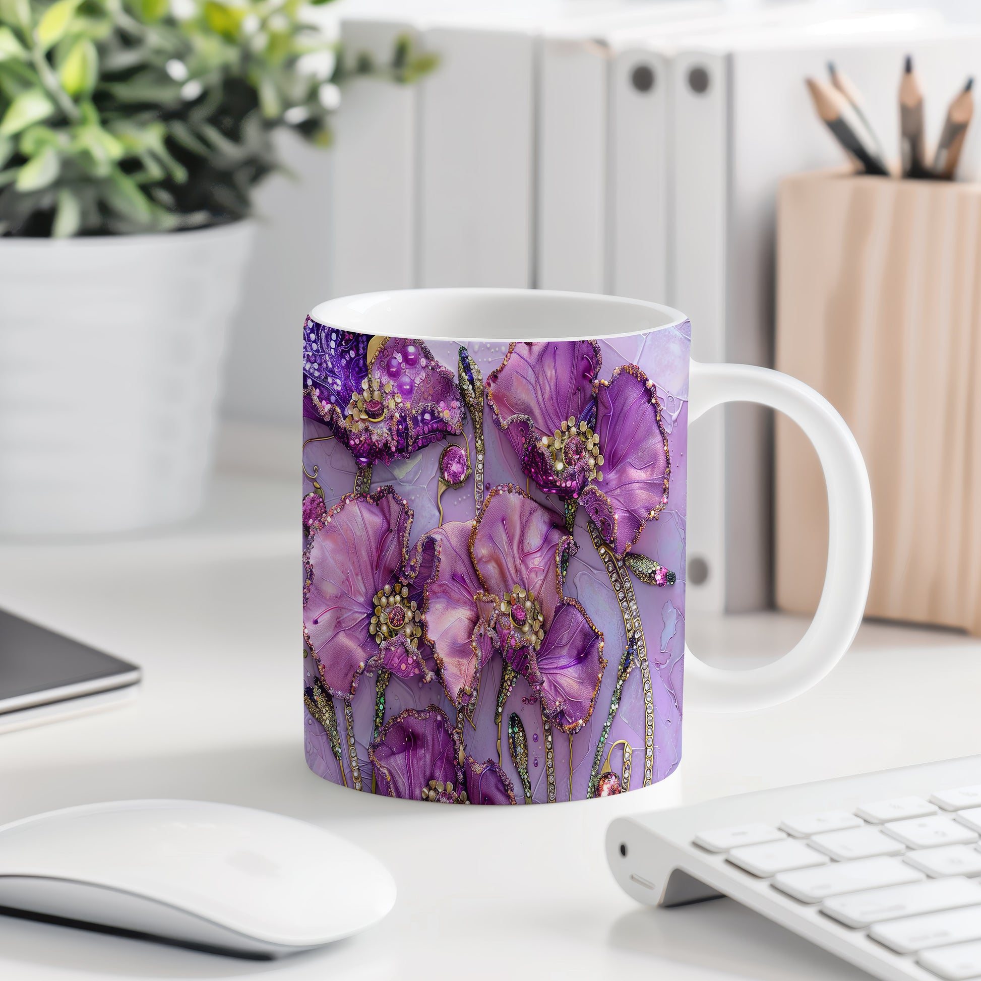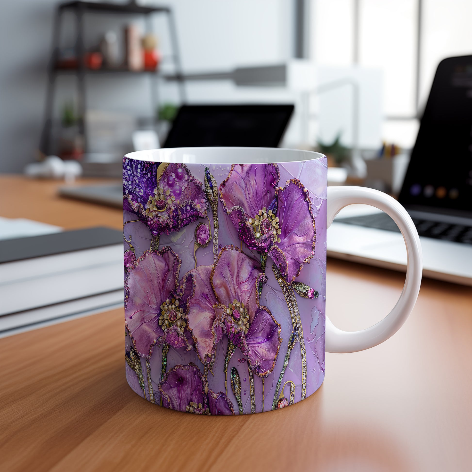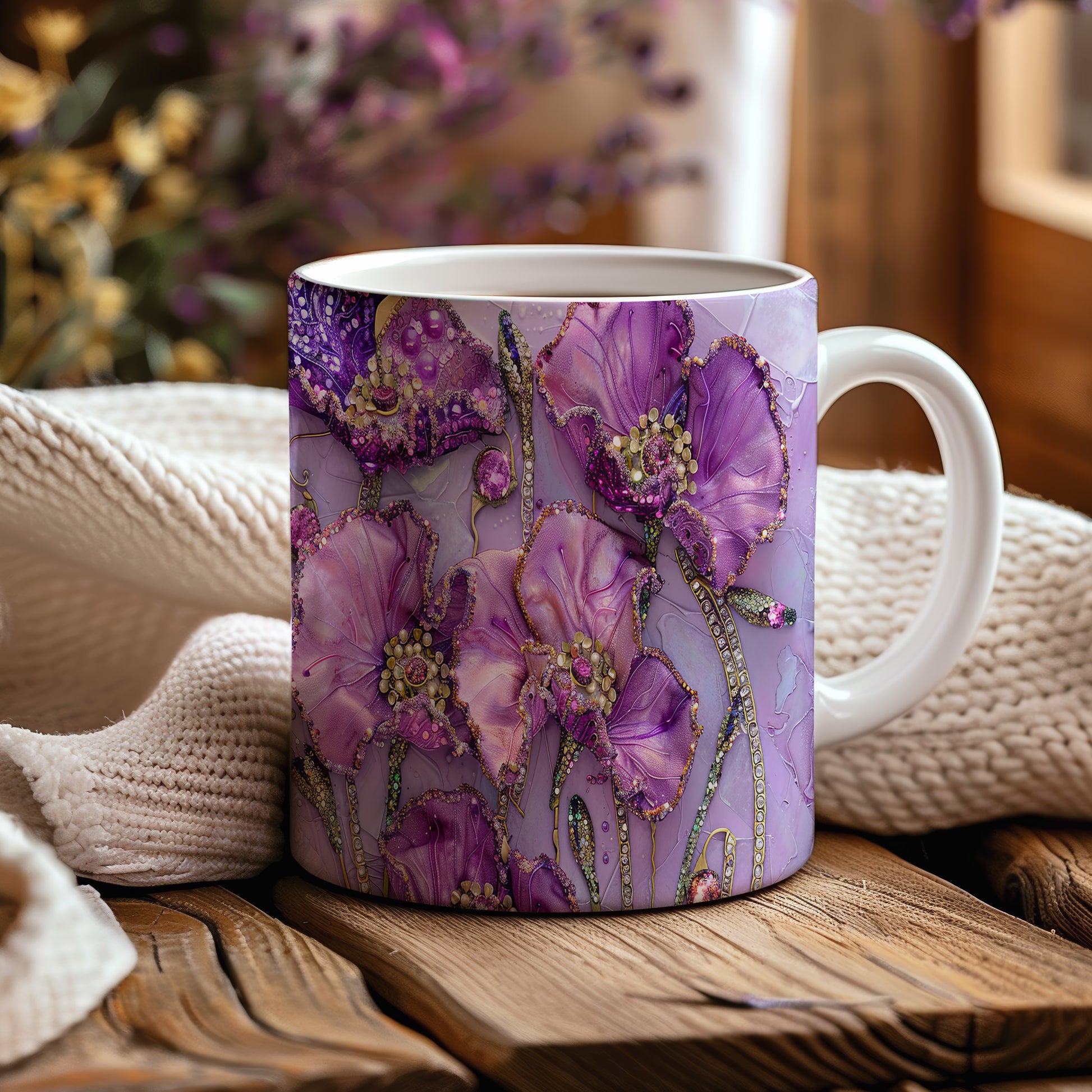 Hrnek s elegantními fialovými květinami a zlatými detaily