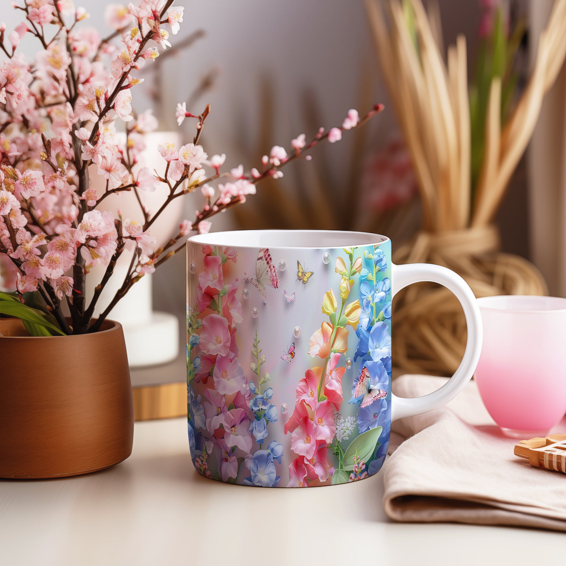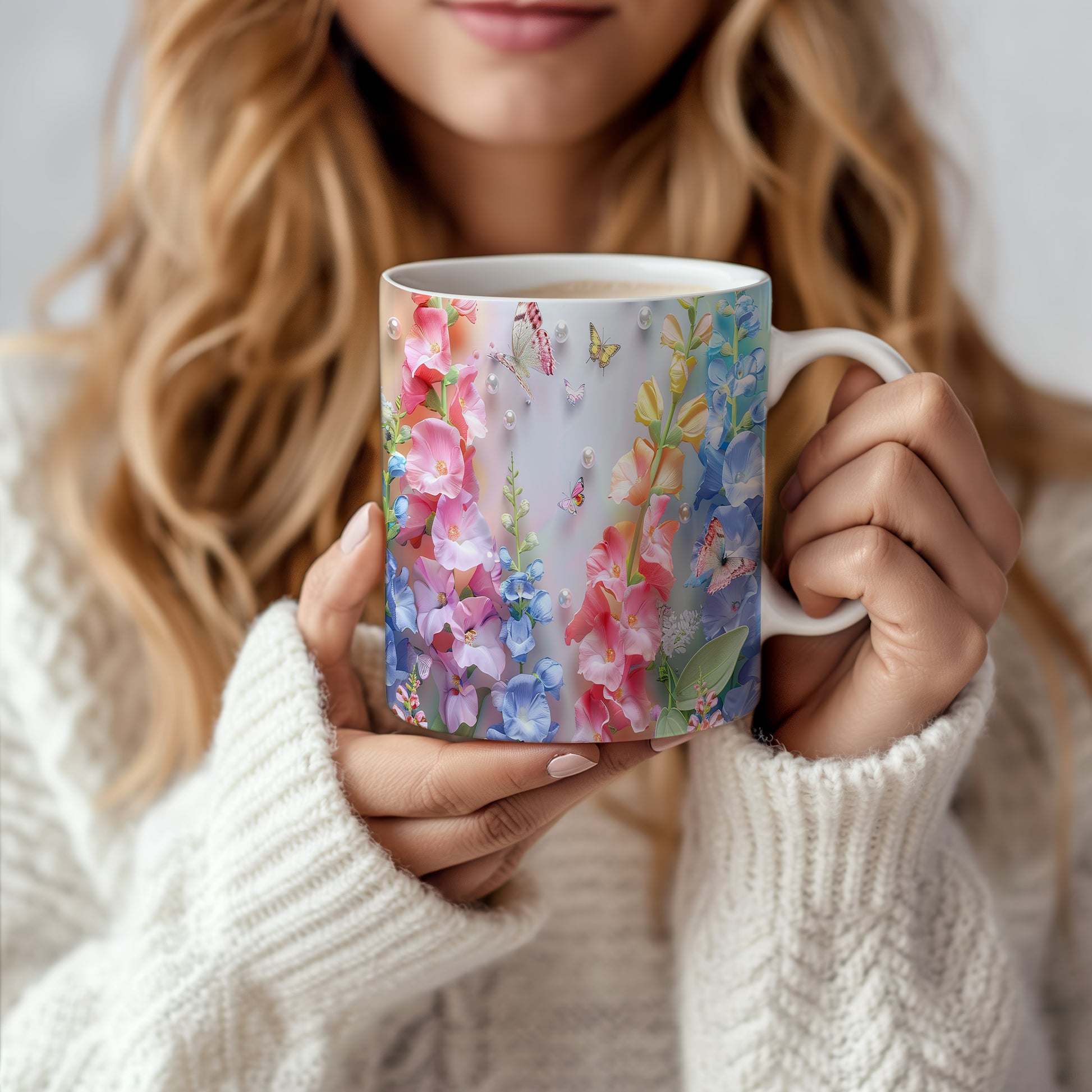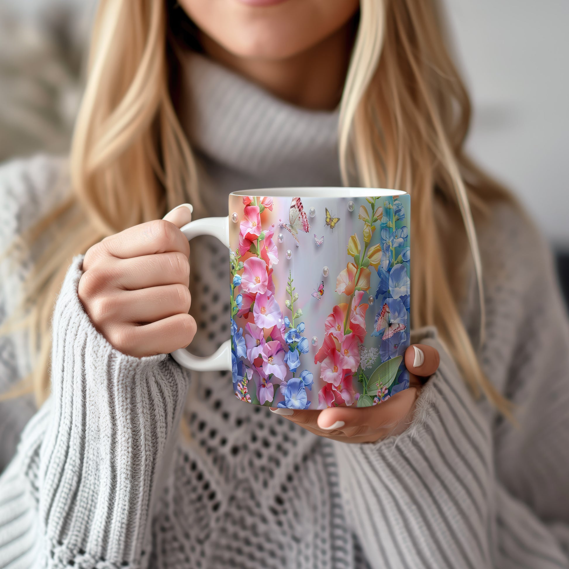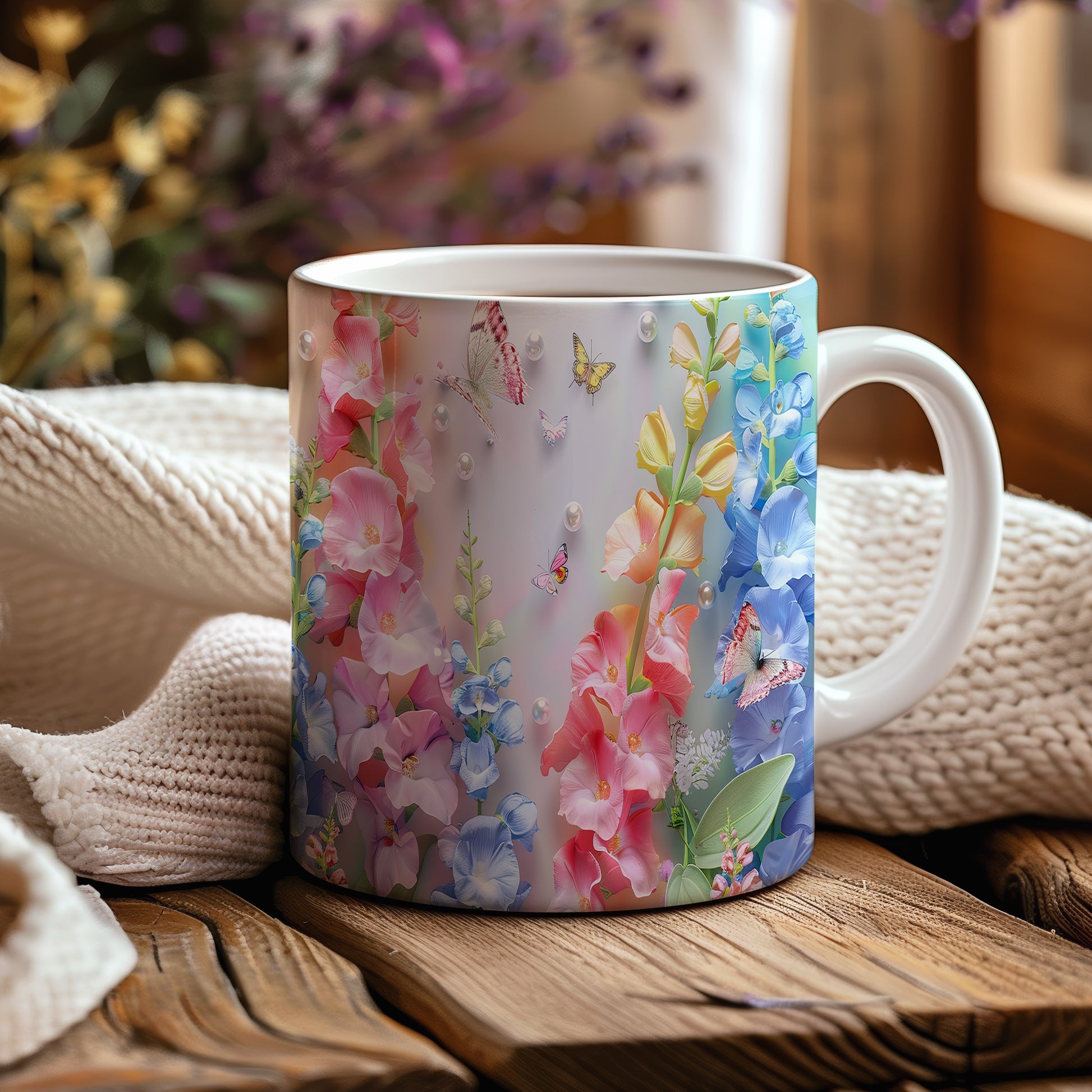 Hrnek s elegantními květinami a jemnými motýly v pastelových tónech