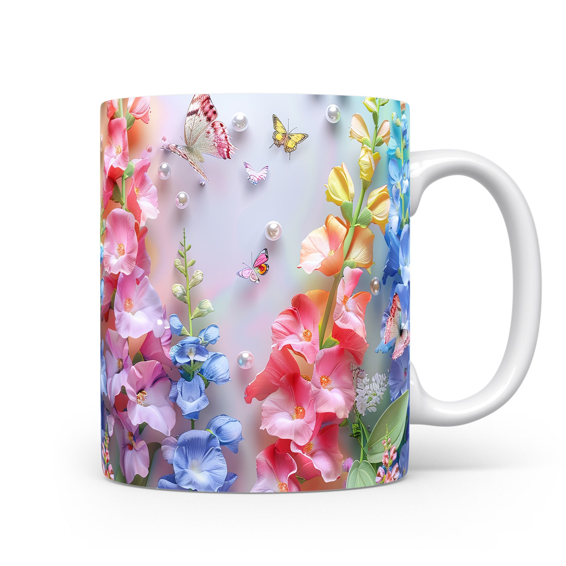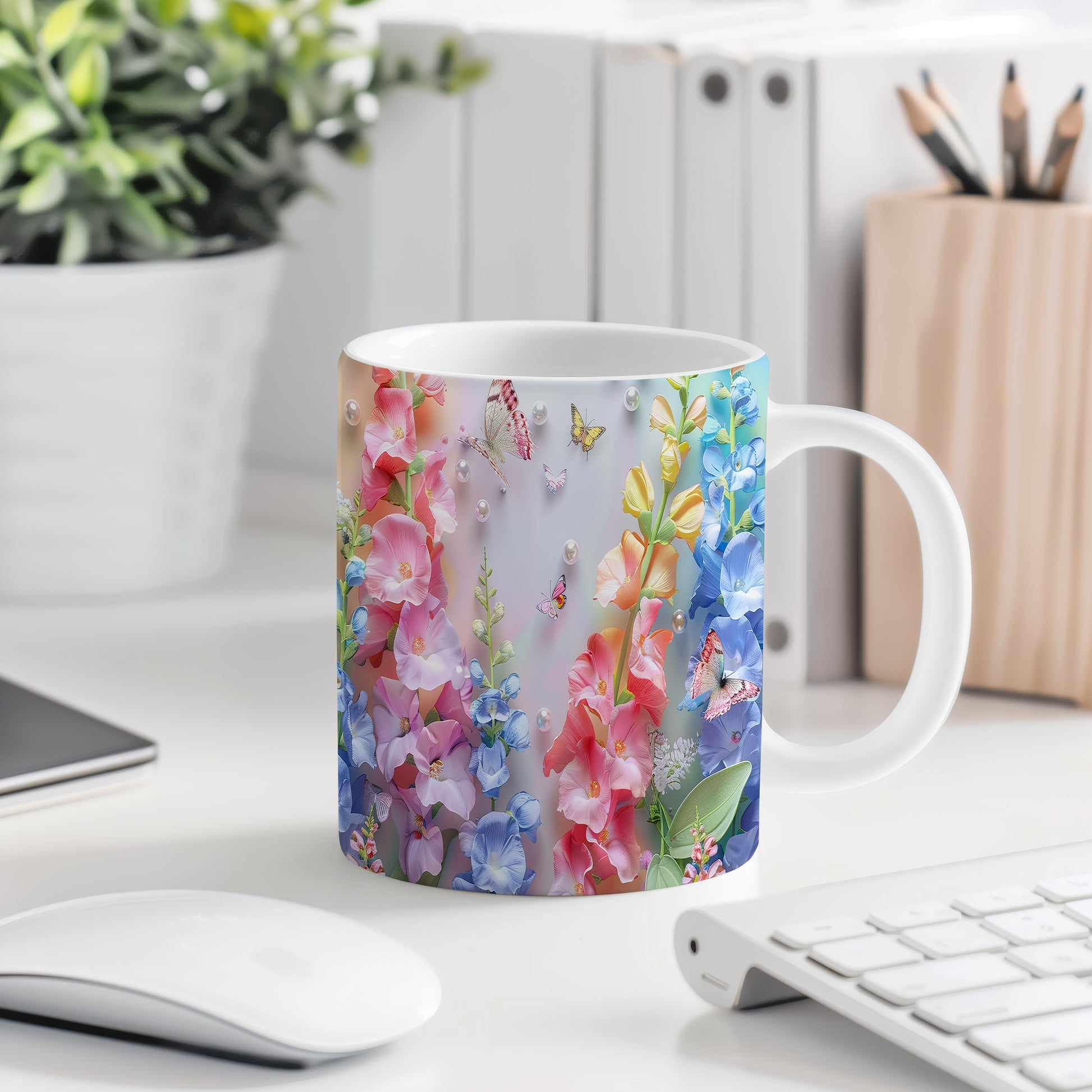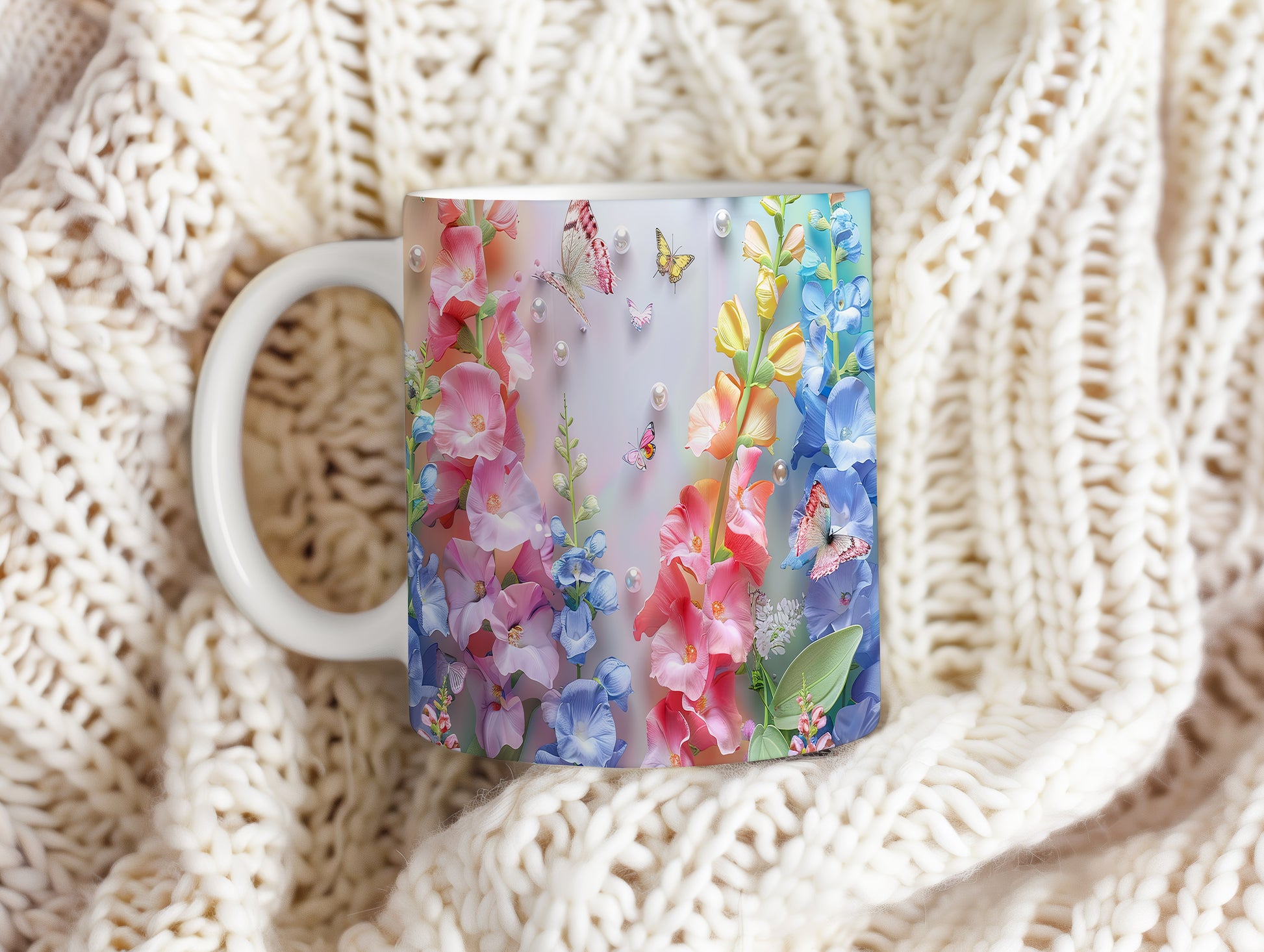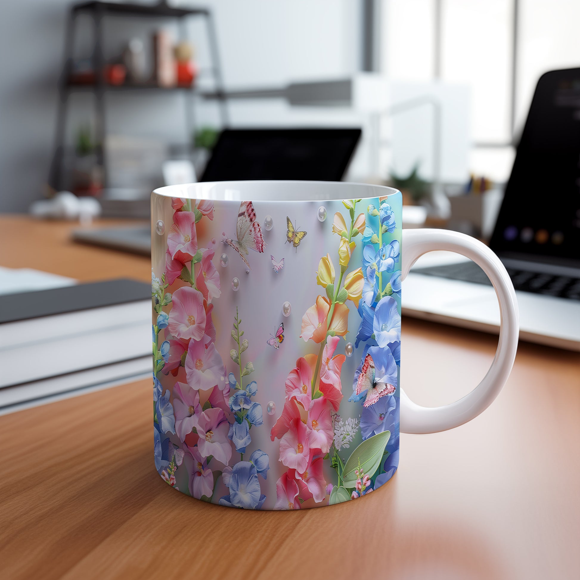 Hrnek s elegantními květinami a jemnými motýly v pastelových tónech