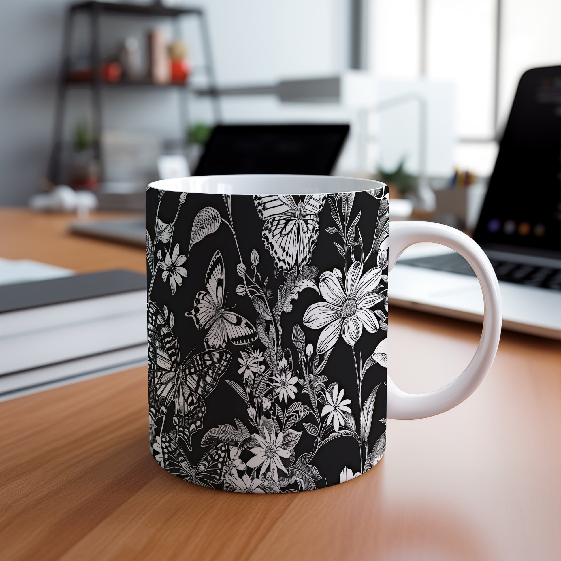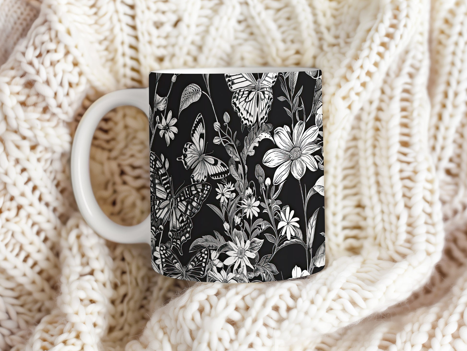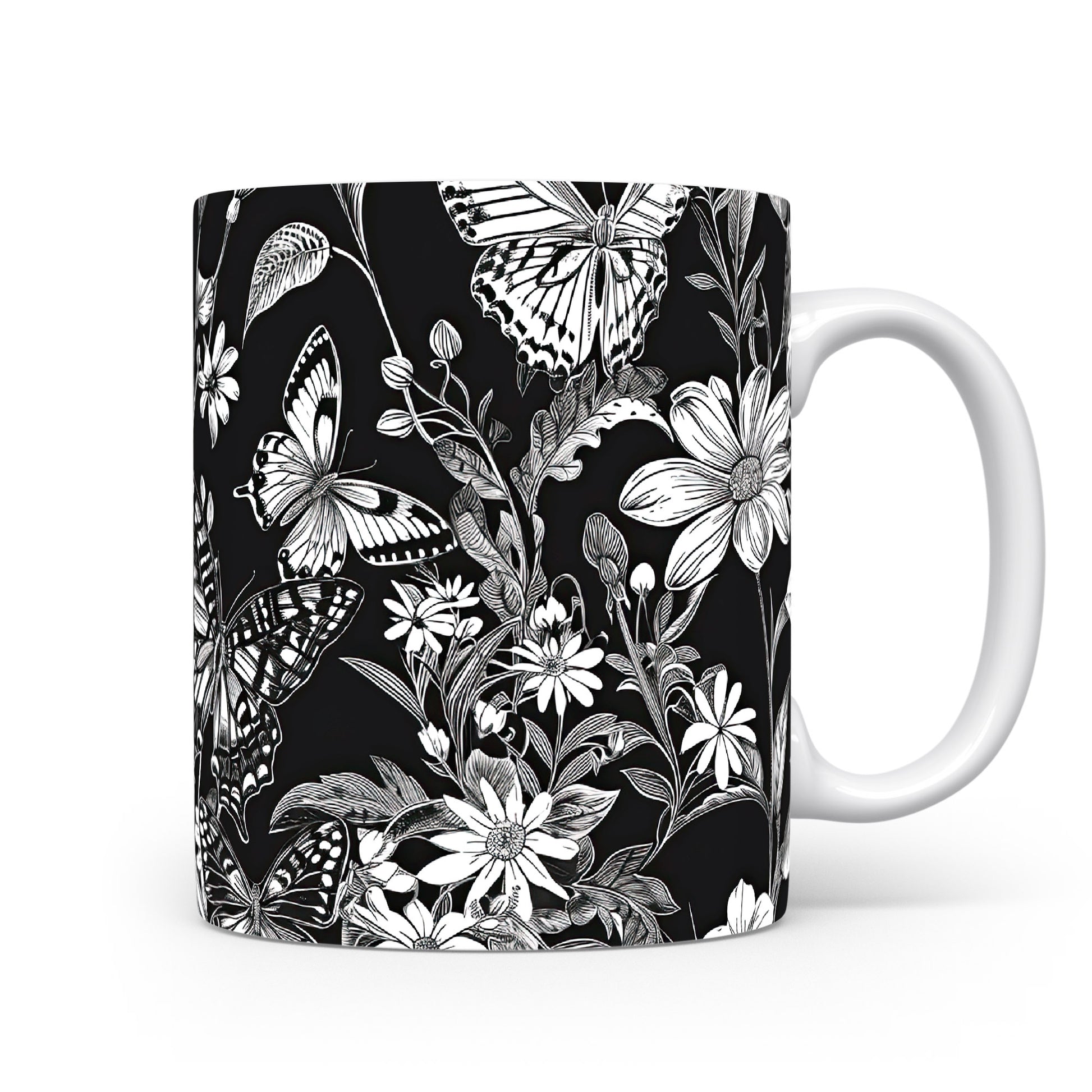 Hrnek s elegantními květinami a motýly na černém pozadí