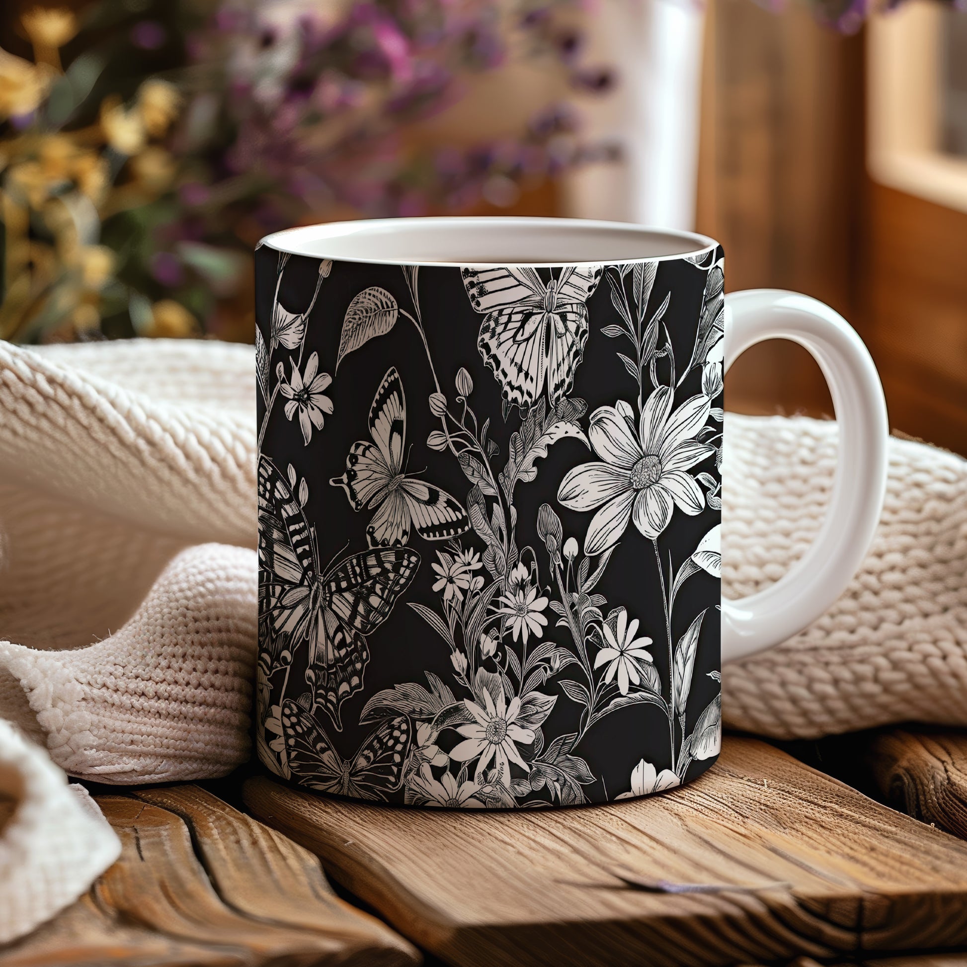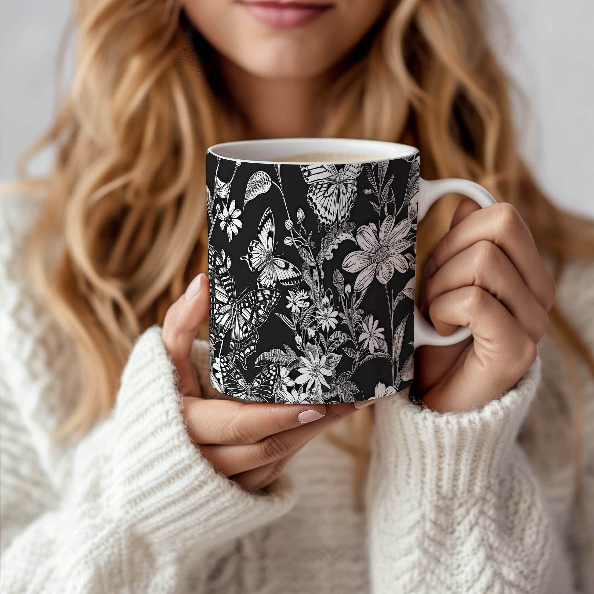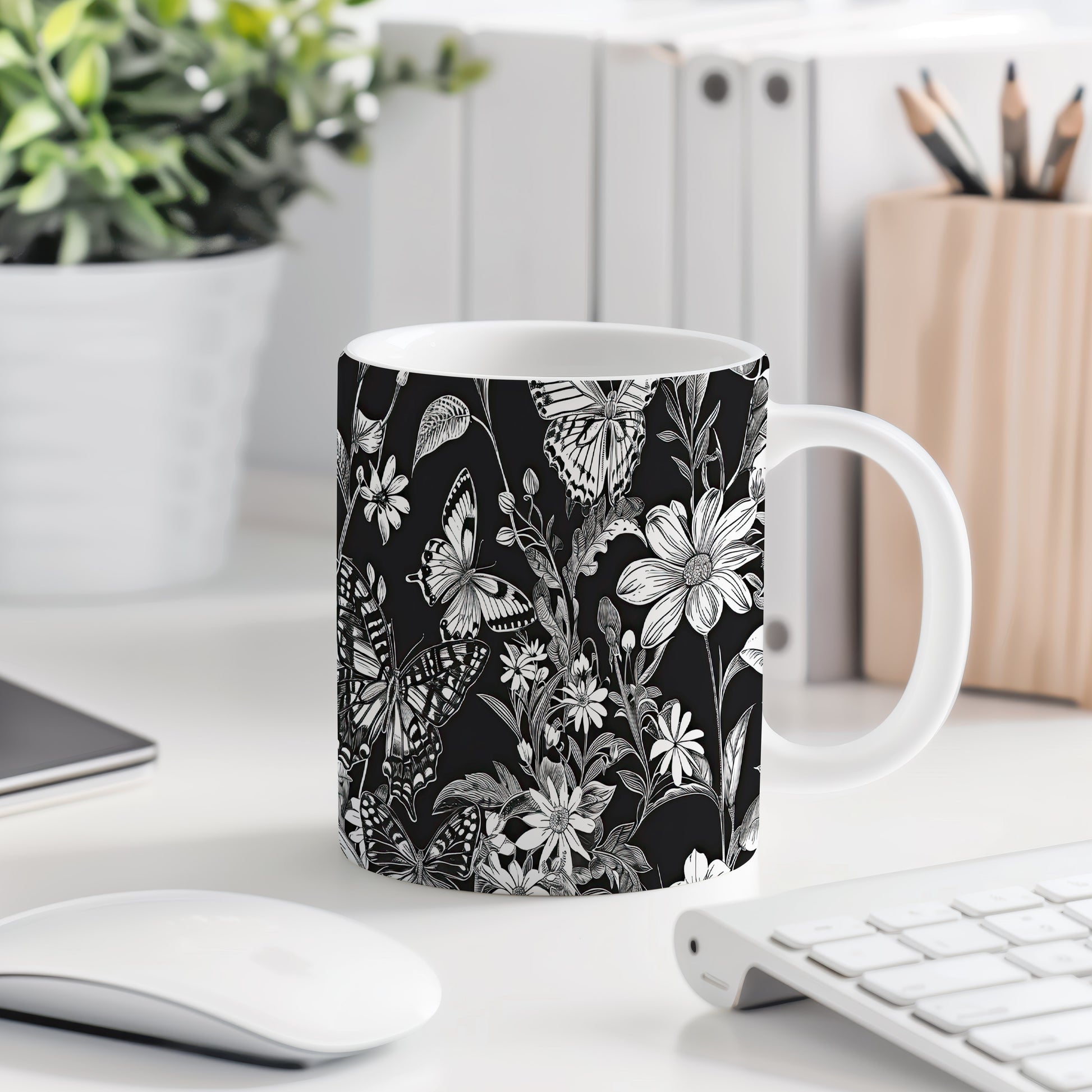 Hrnek s elegantními květinami a motýly na černém pozadí