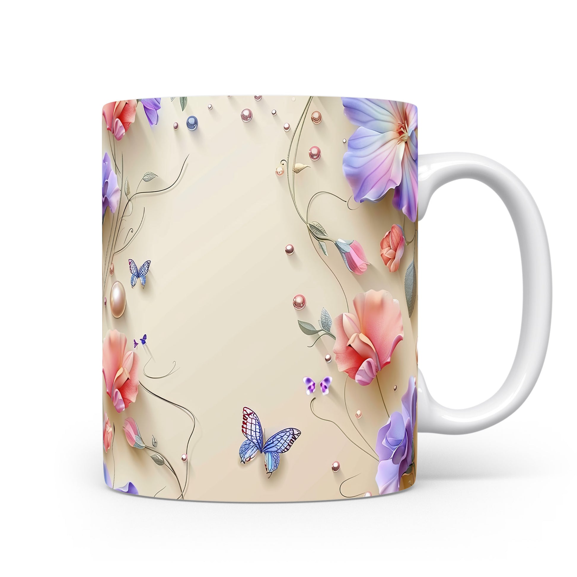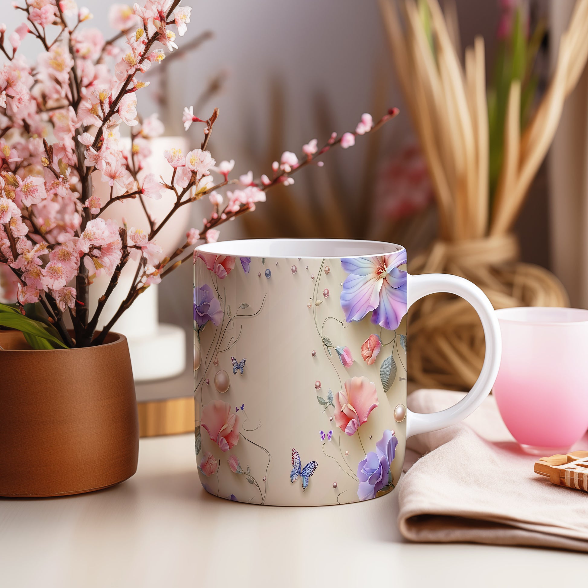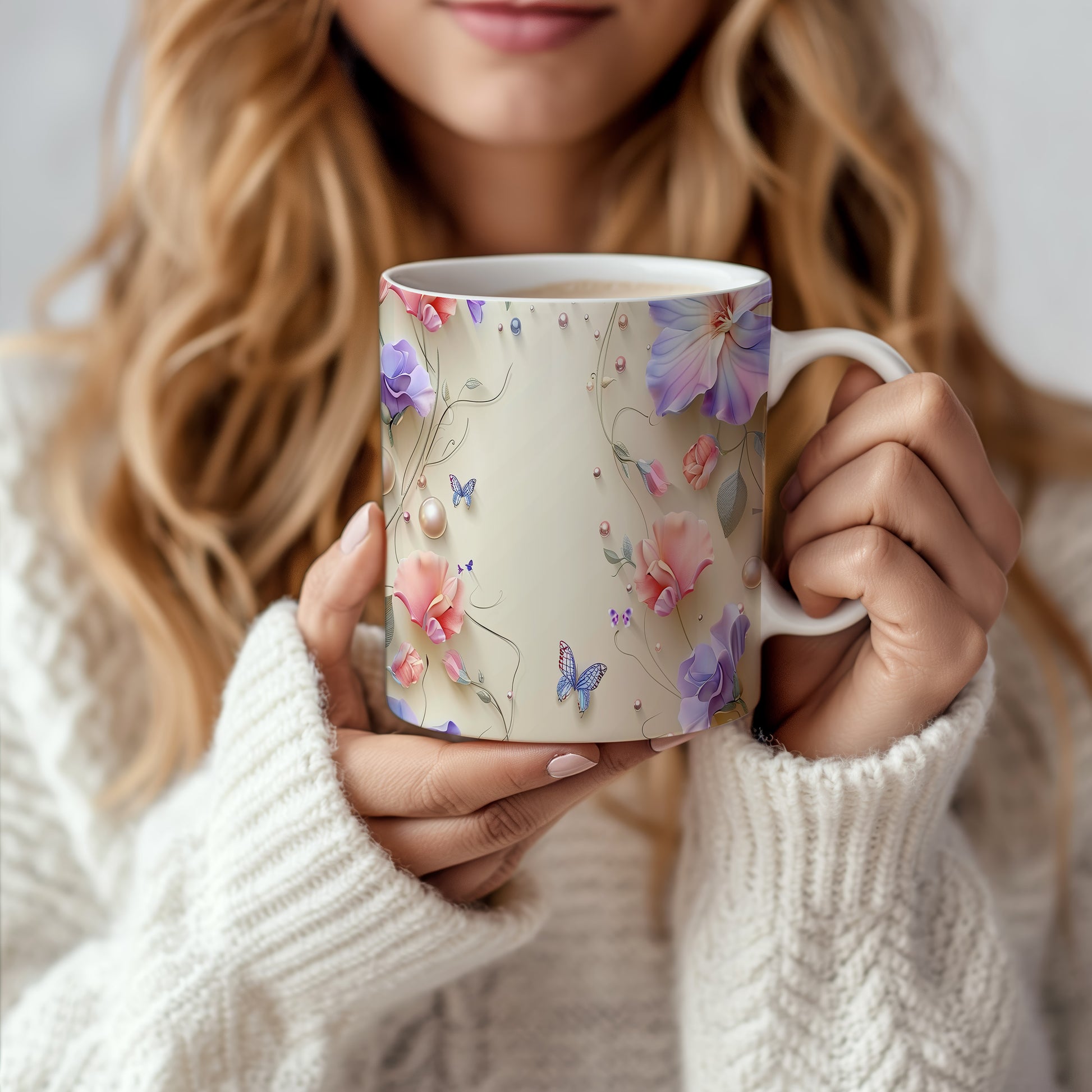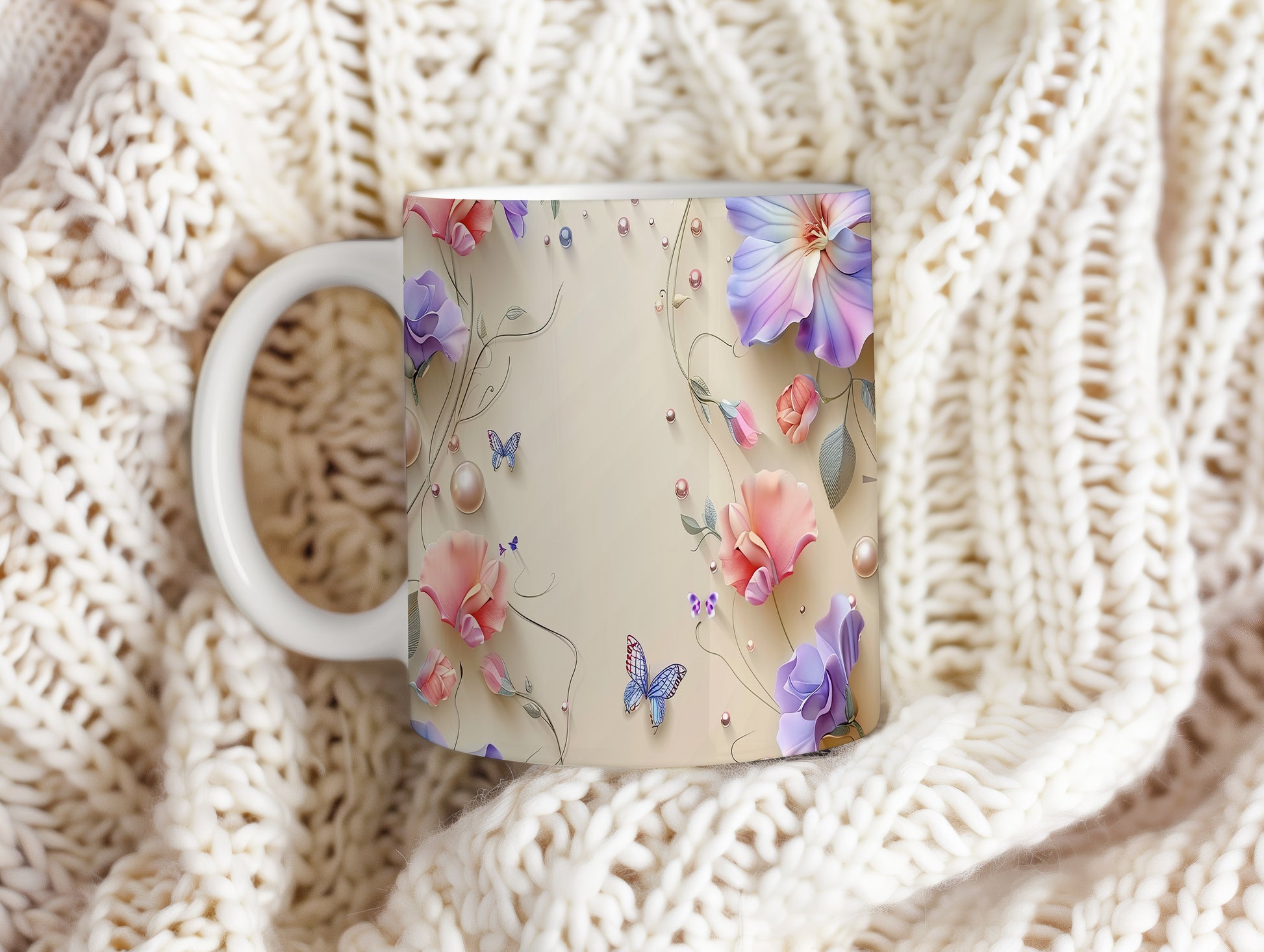 Hrnek s elegantními květinami a motýly v pastelových tónech