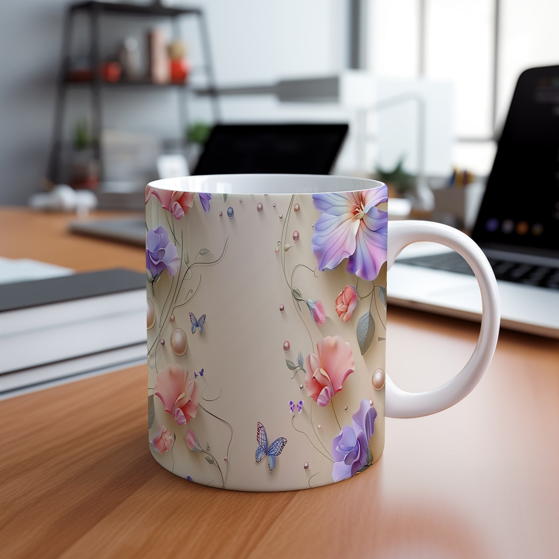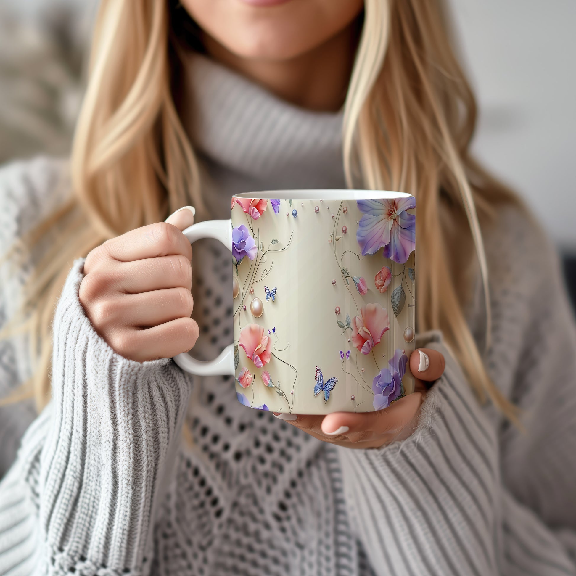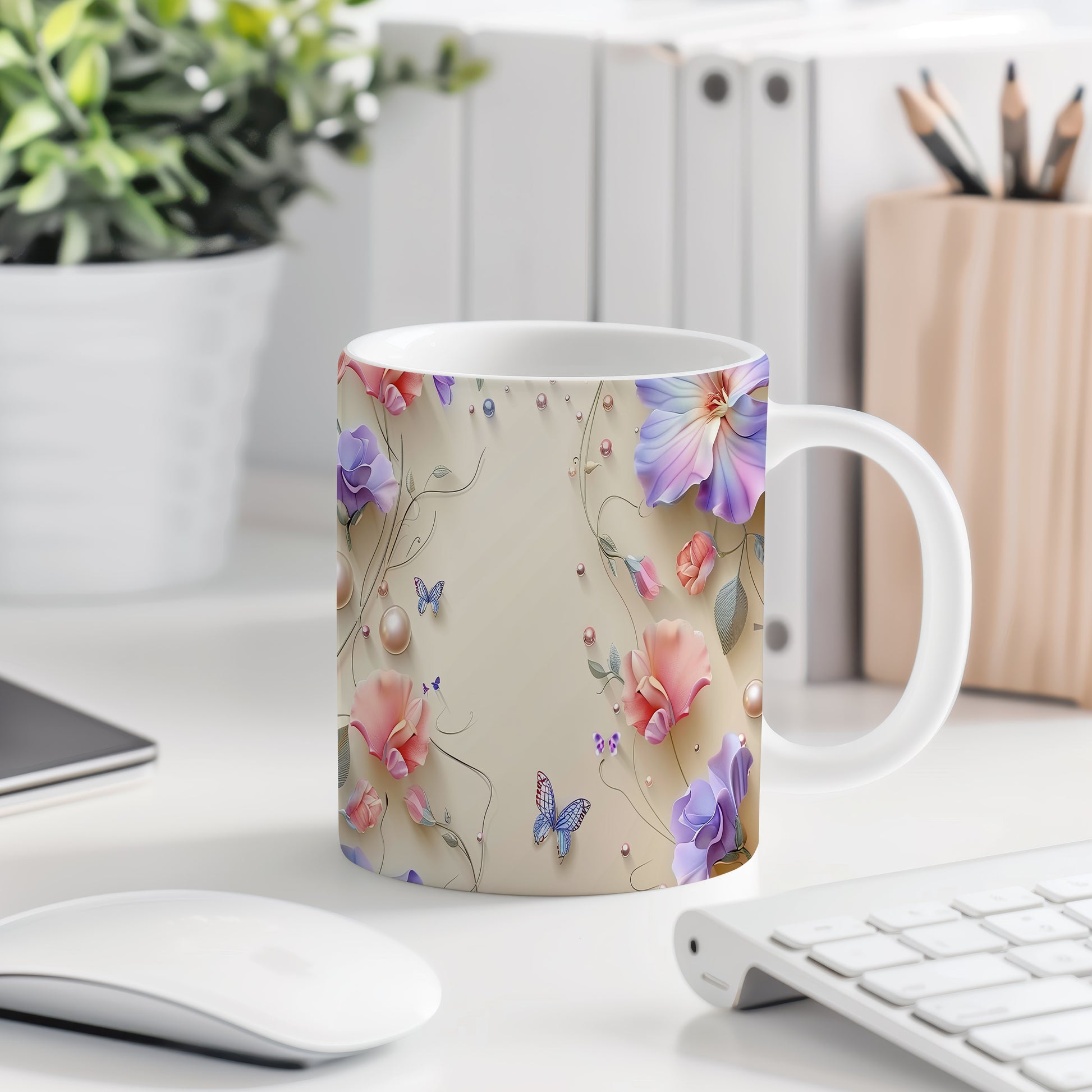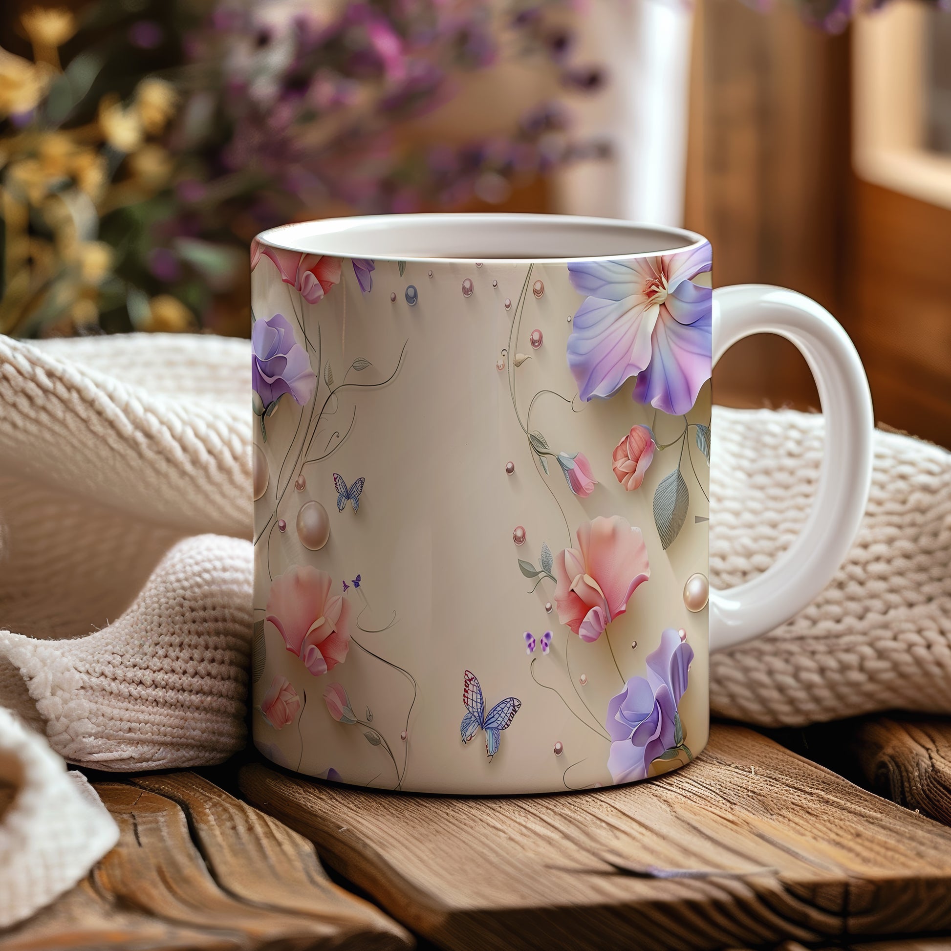 Hrnek s elegantními květinami a motýly v pastelových tónech