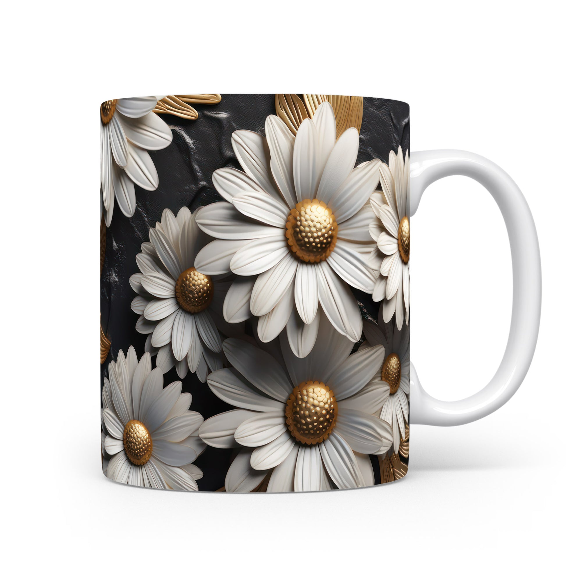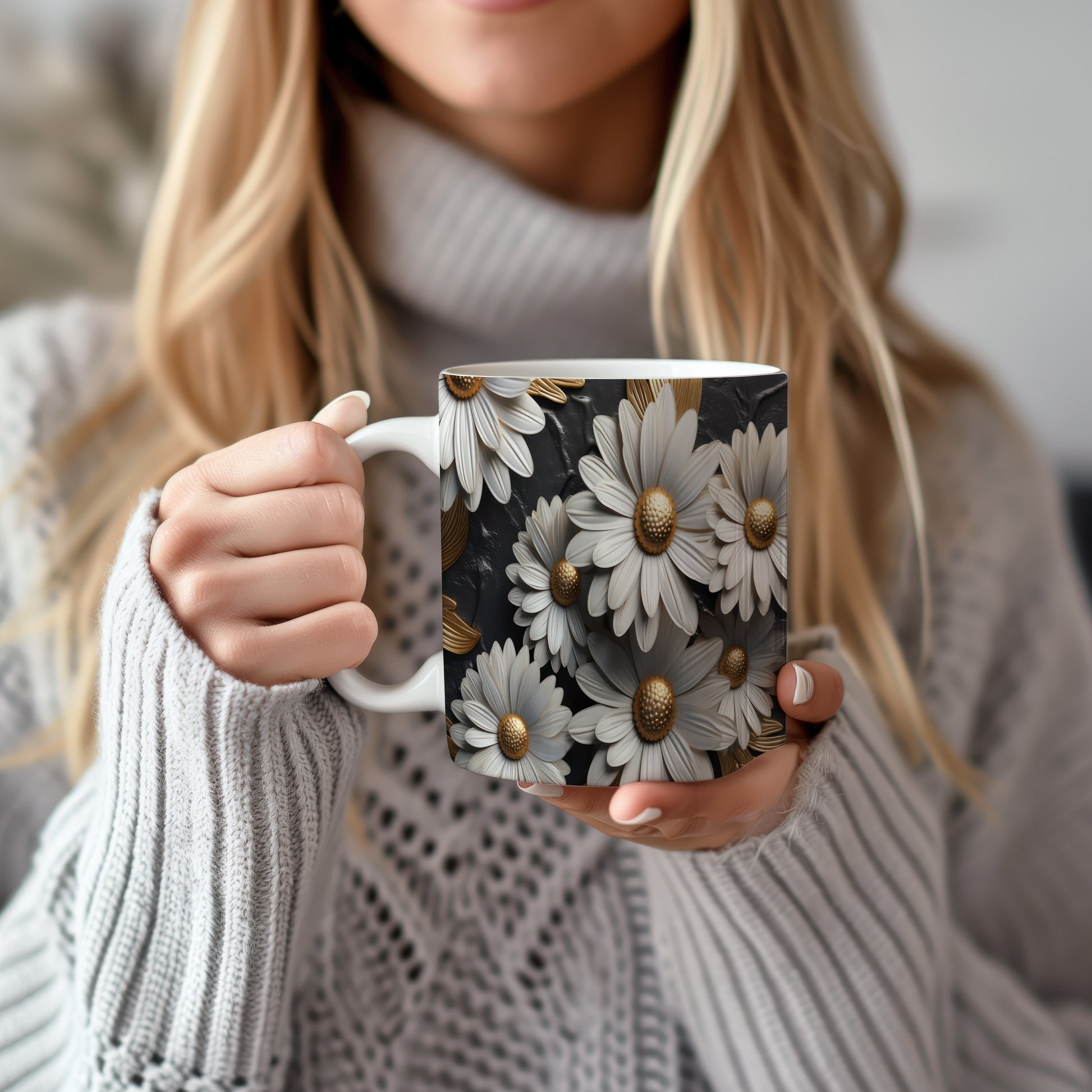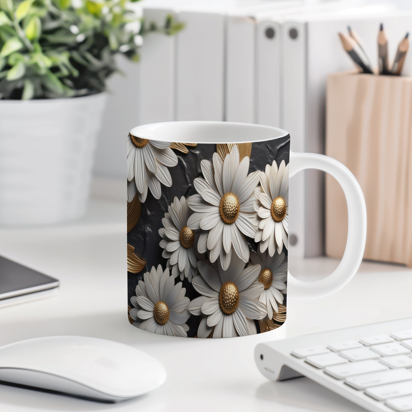 Hrnek s elegantními květinami v bílých a zlatých tónech