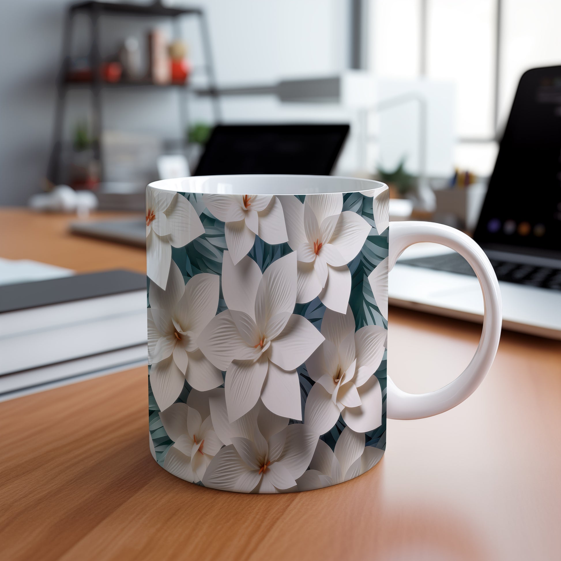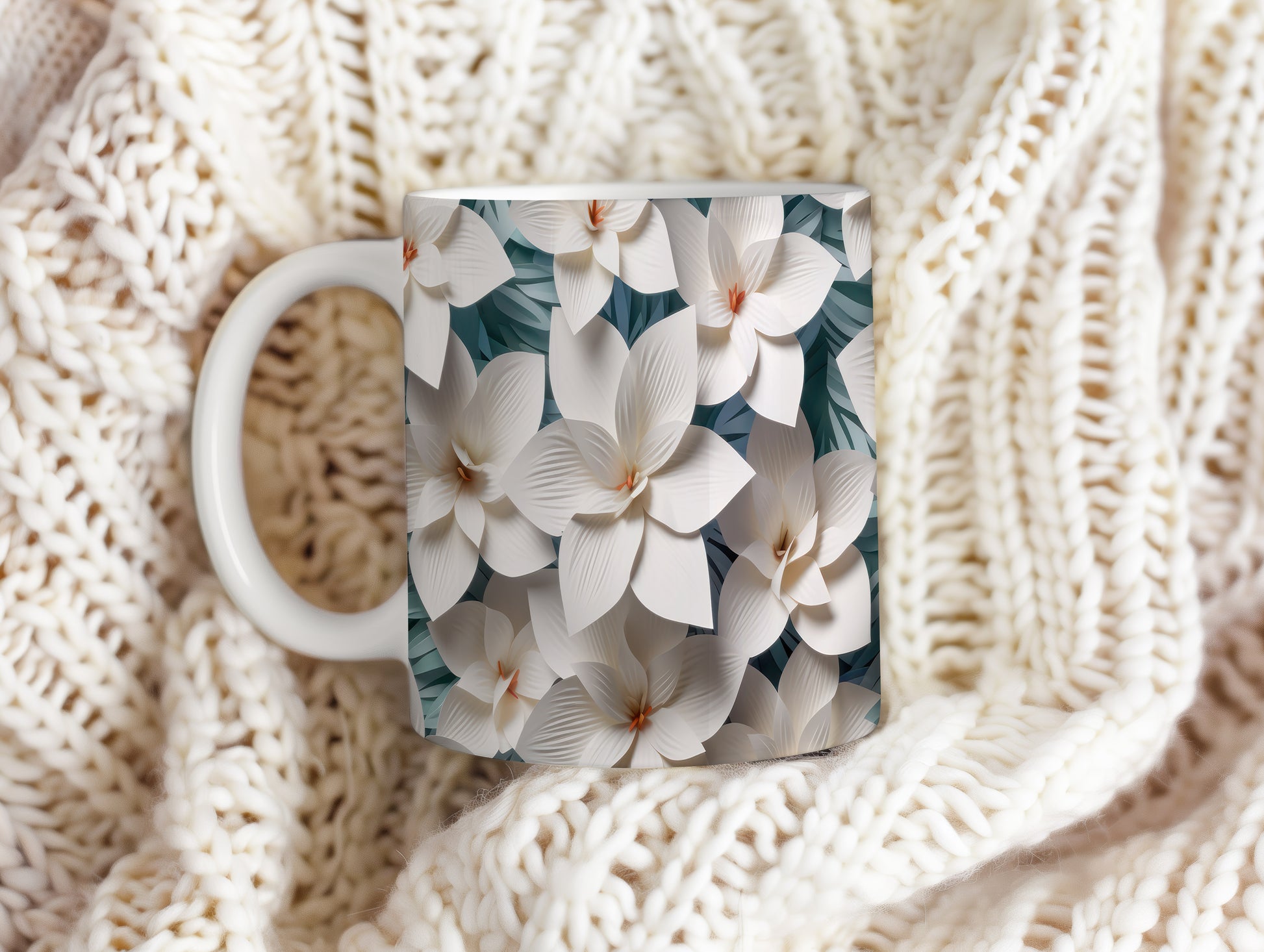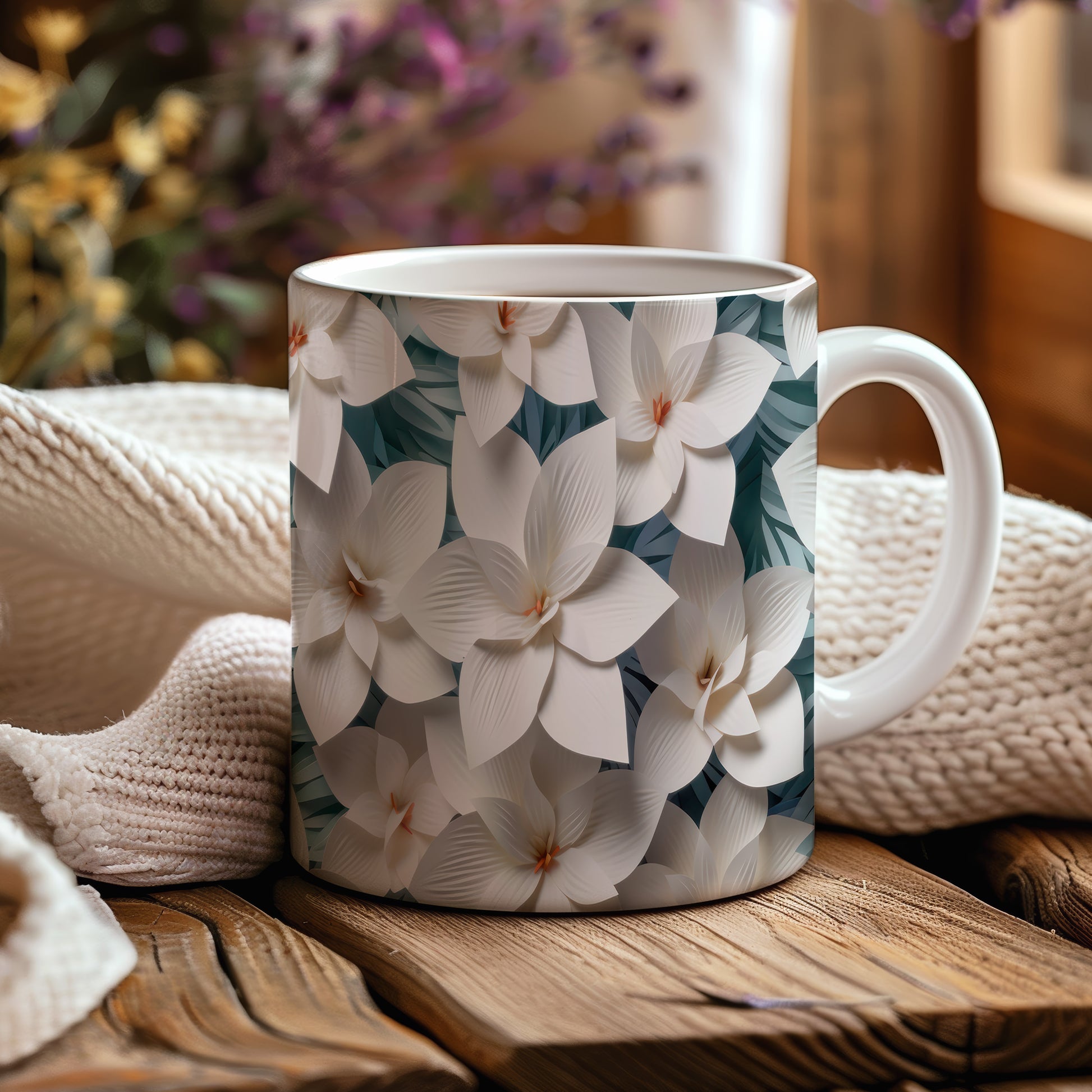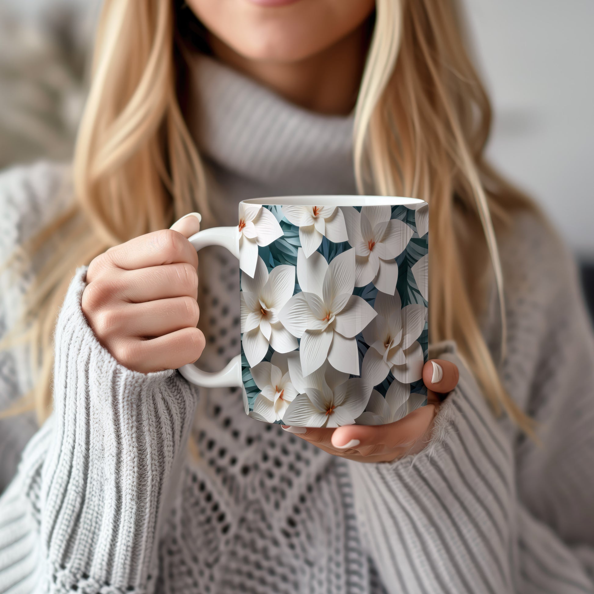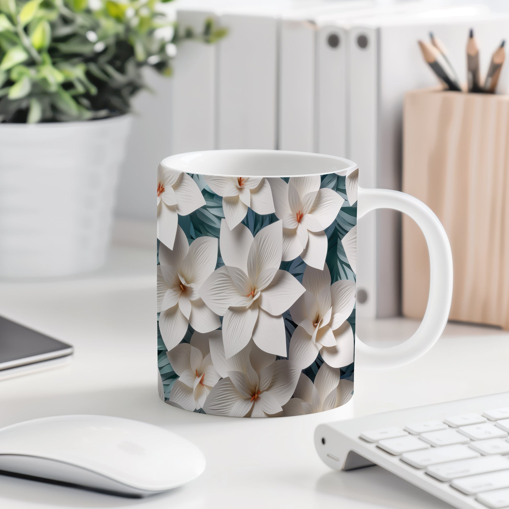 Hrnek s elegantními květinami v bílých tónech