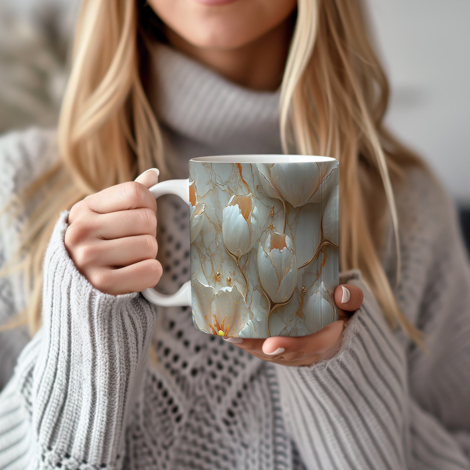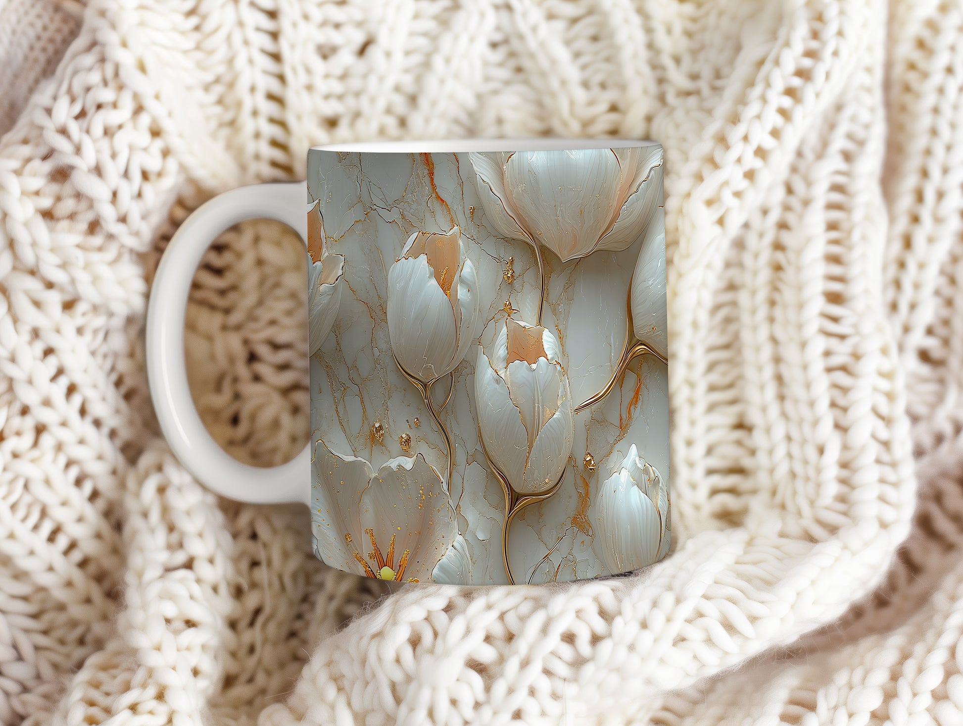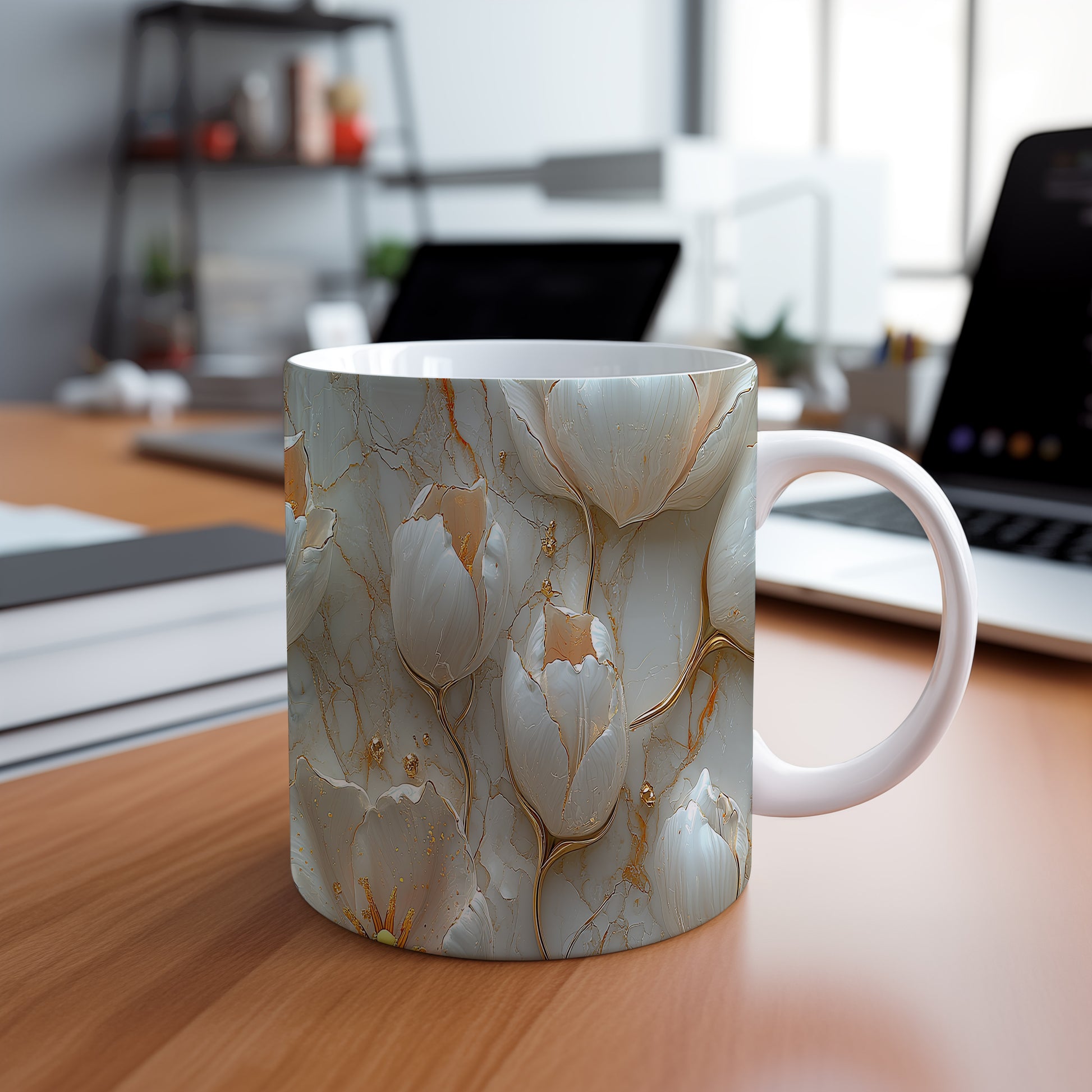 Hrnek s elegantními květinami v bílých tónech – digitální ilustrace