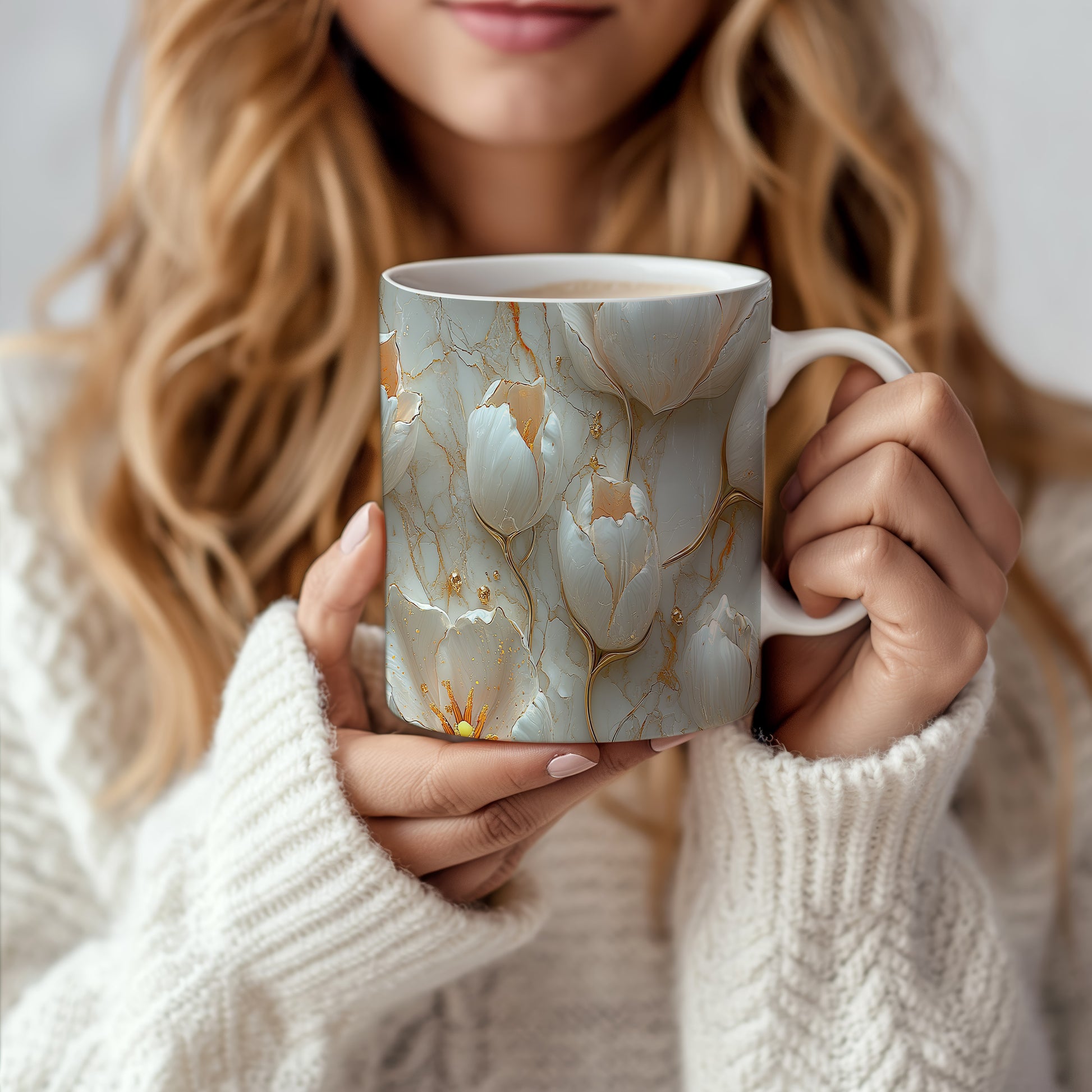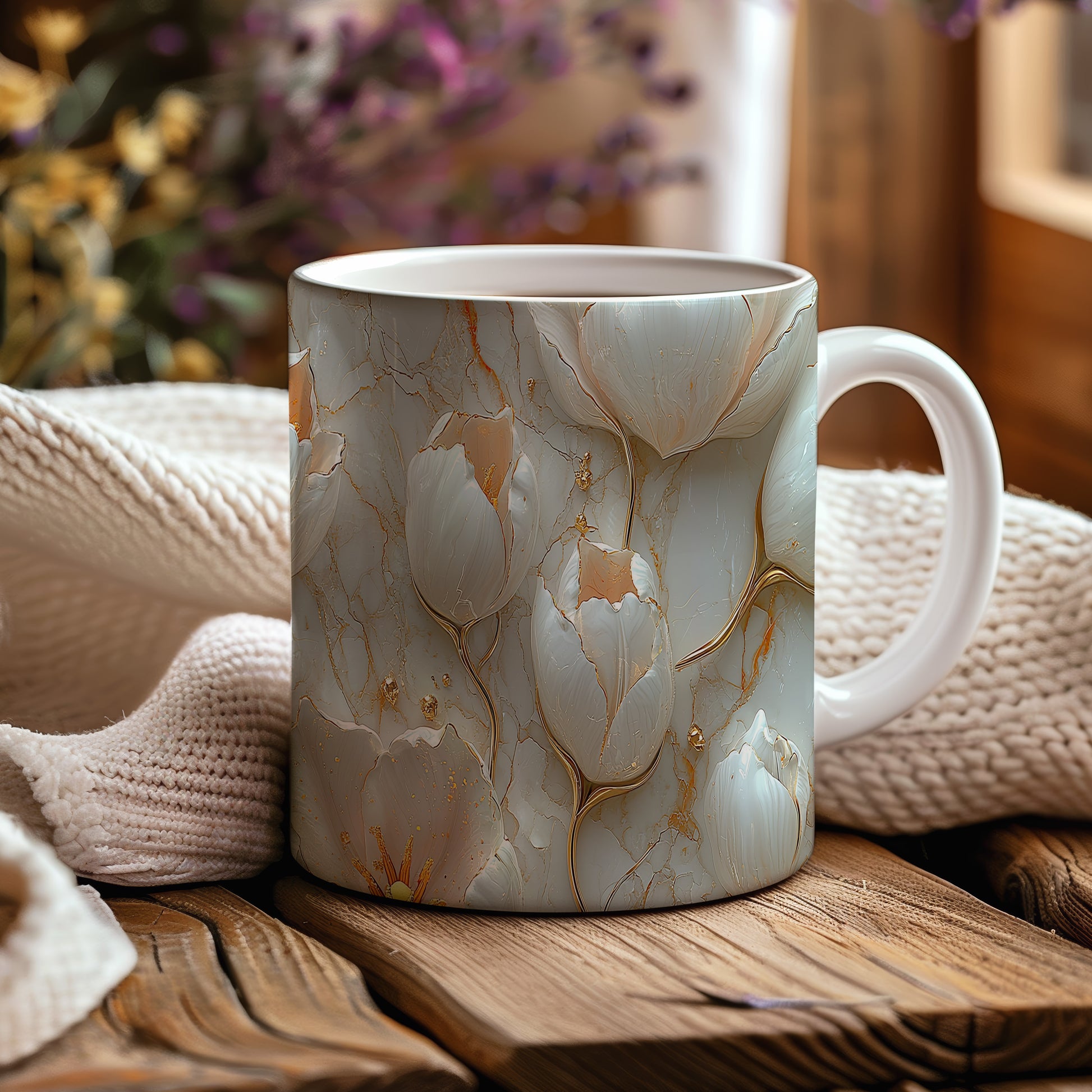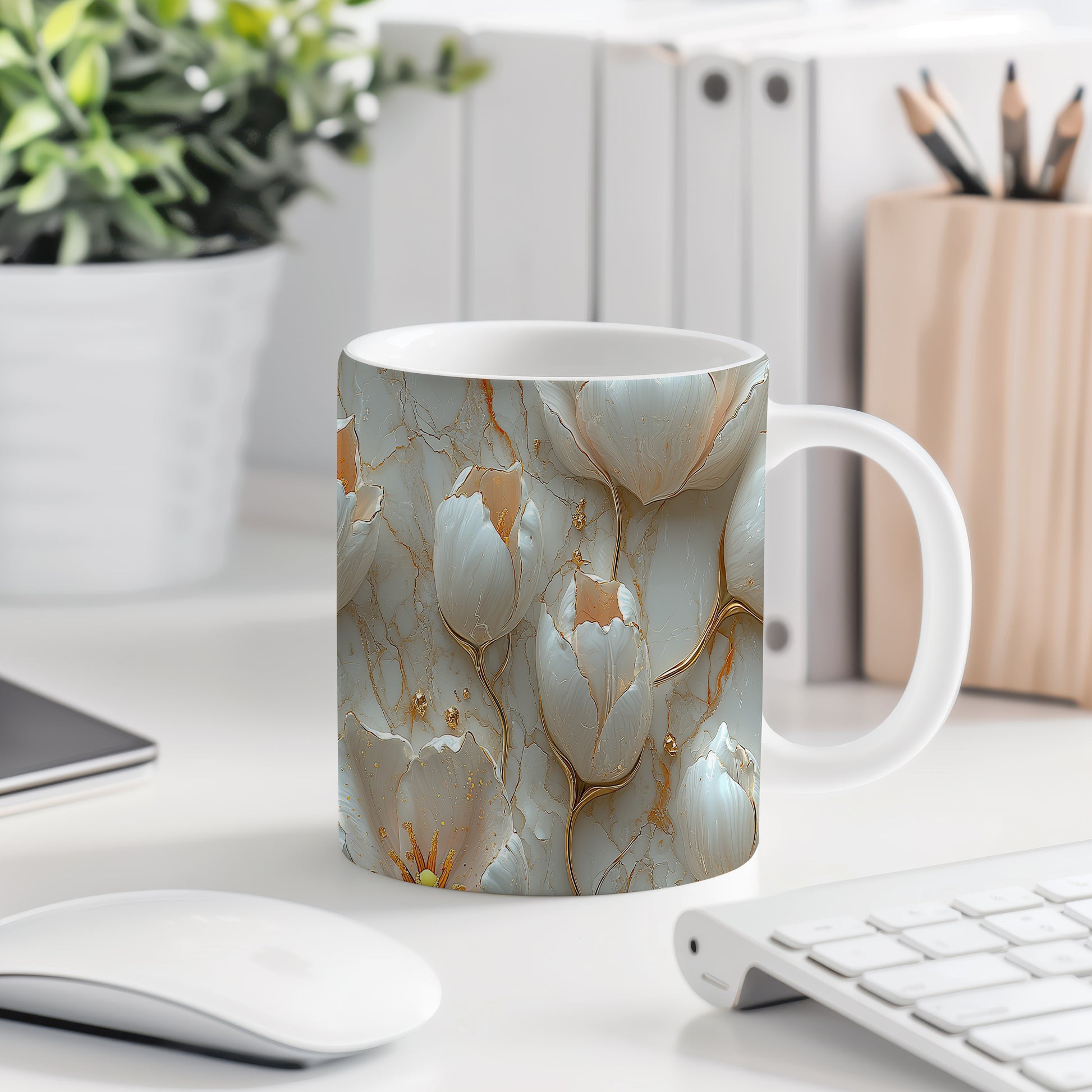 Hrnek s elegantními květinami v bílých tónech – digitální ilustrace
