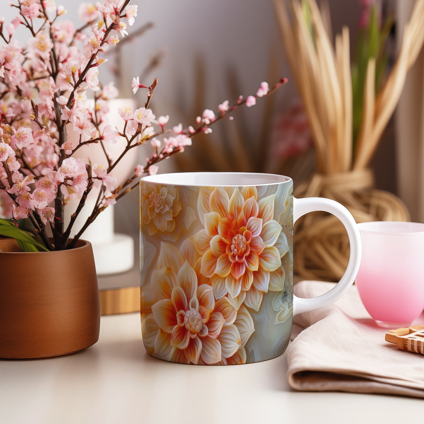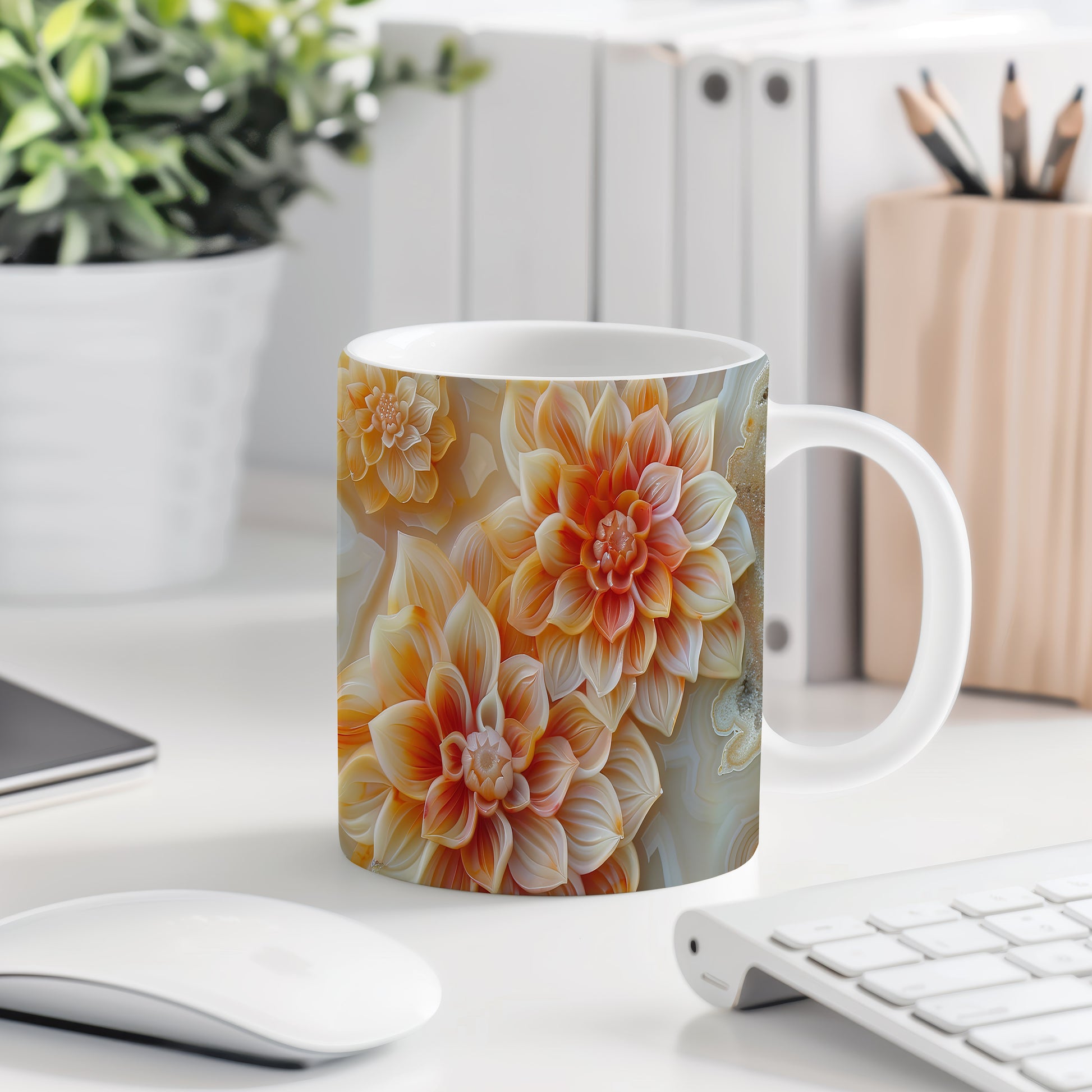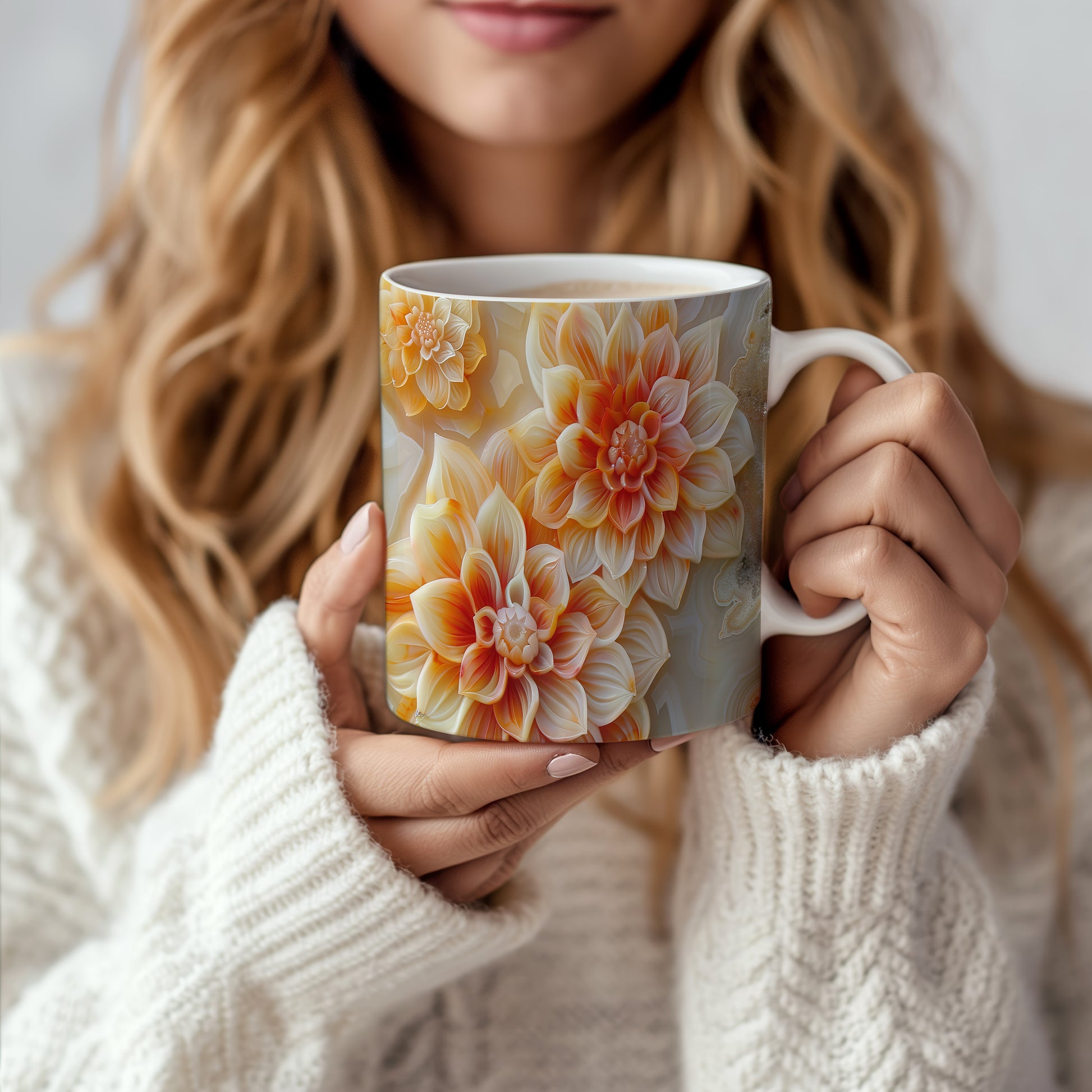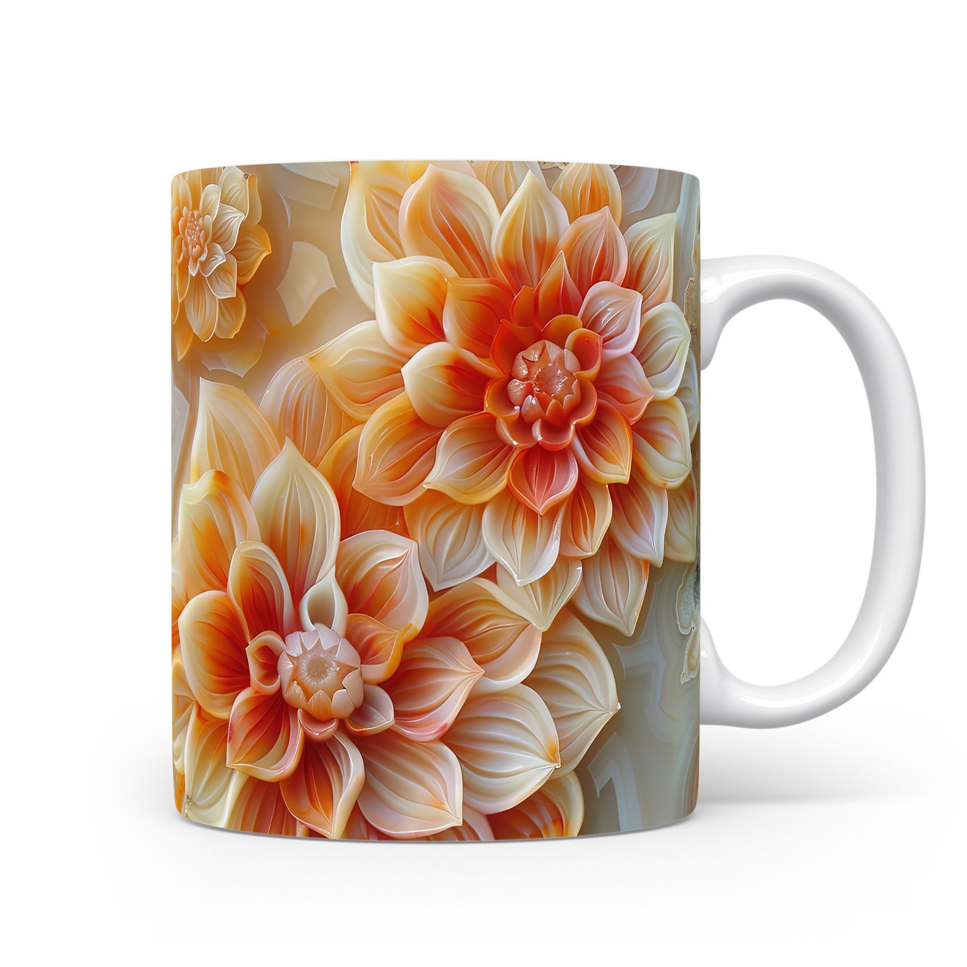 Hrnek s elegantními květinami v jemných tónech oranžové a bílé