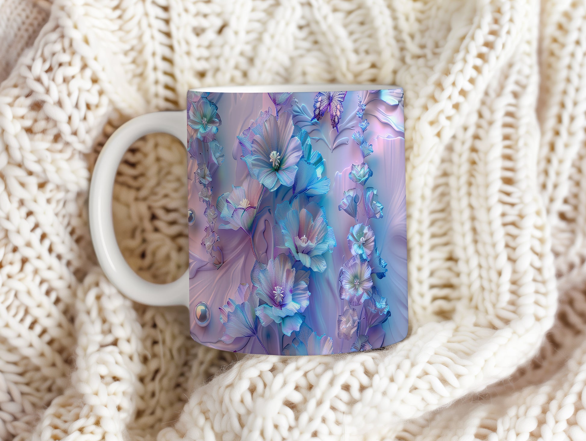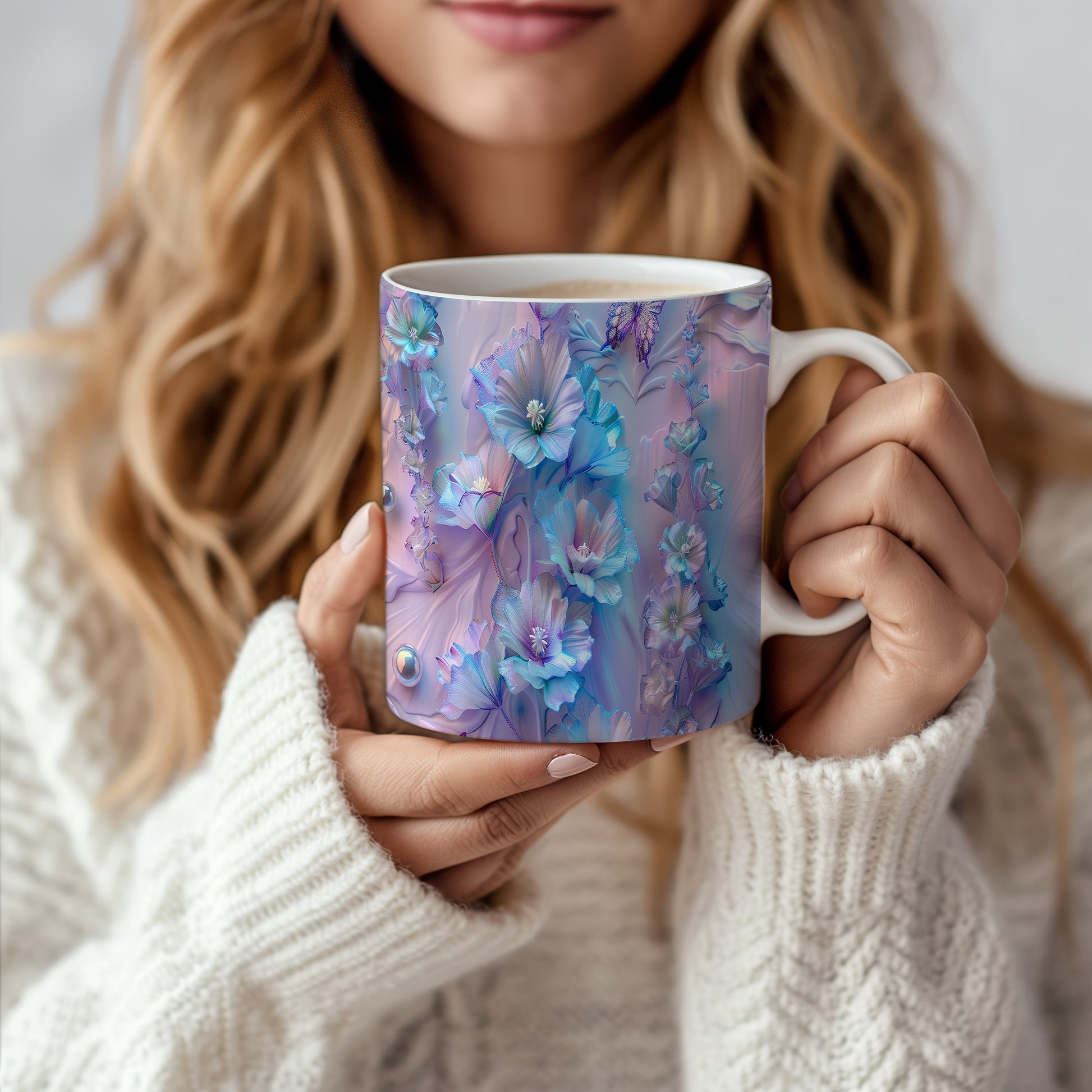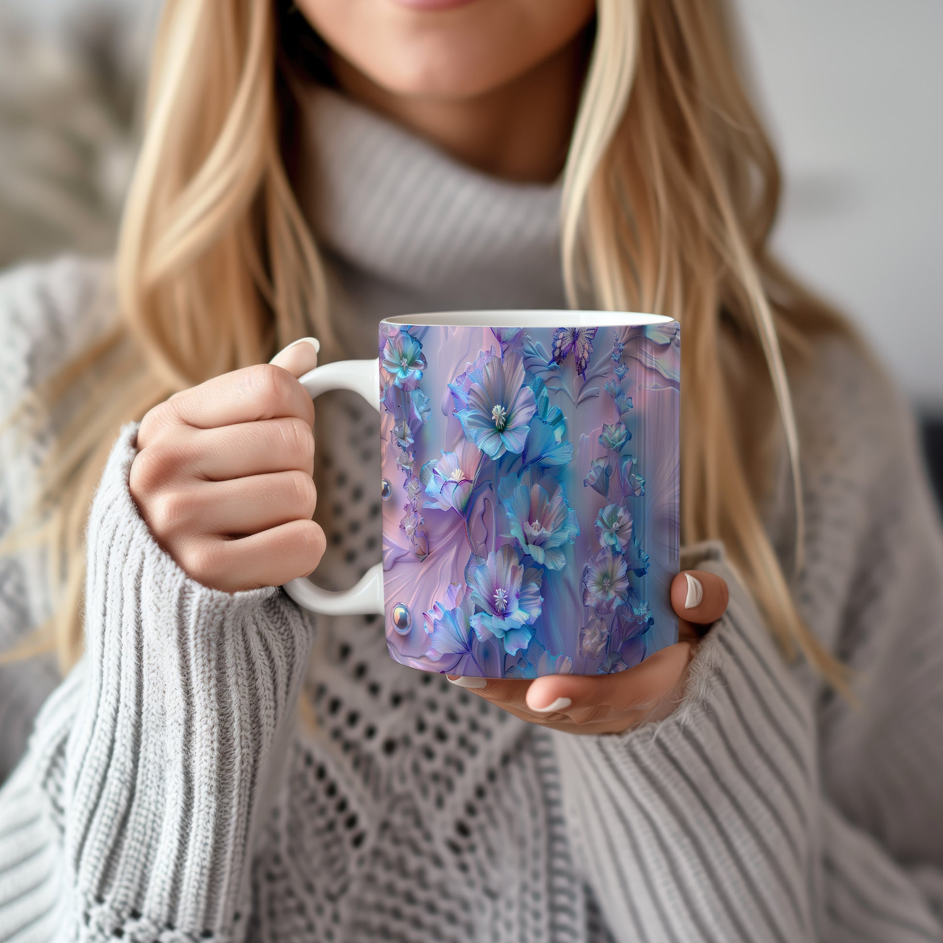 Hrnek s elegantními květinami v modrých a fialových tónech