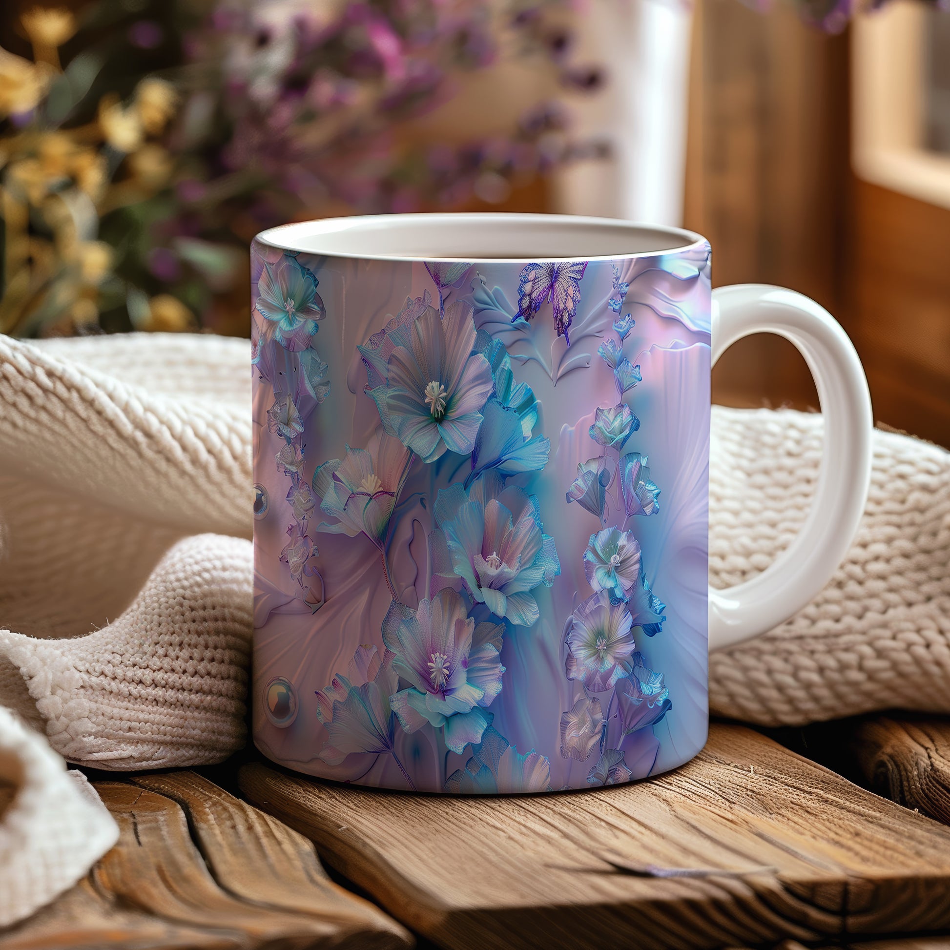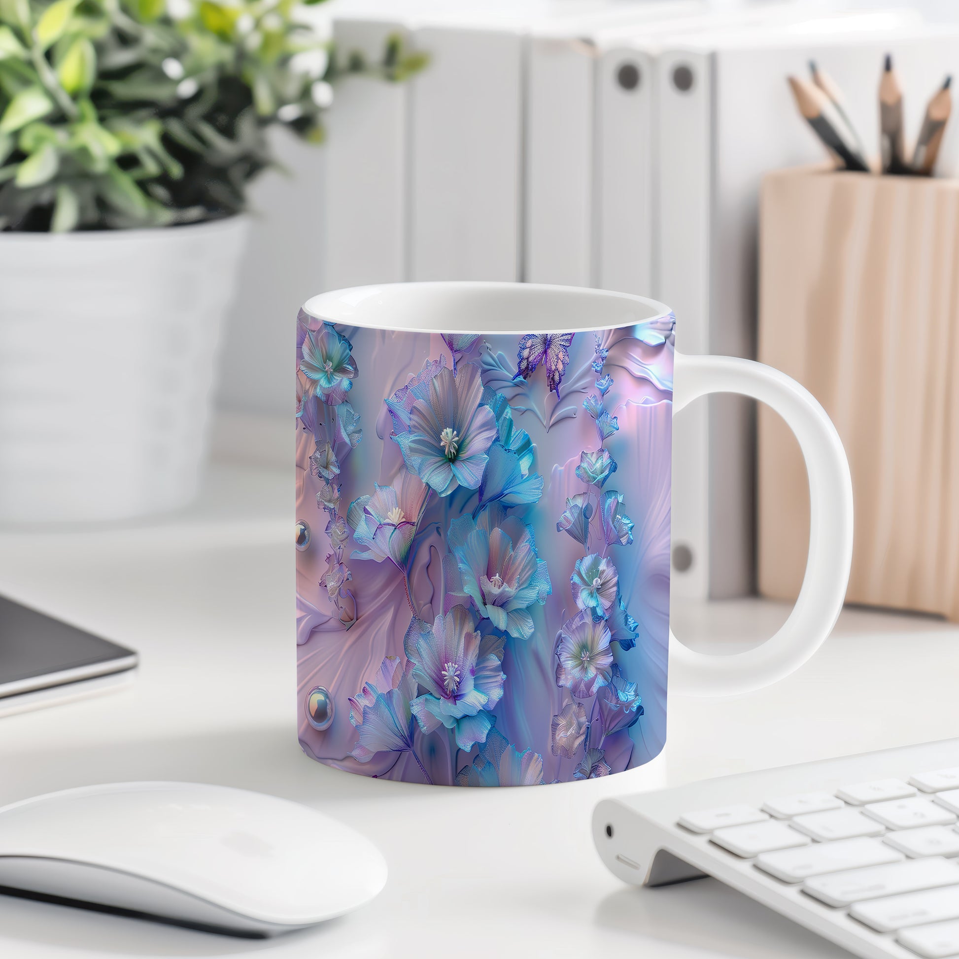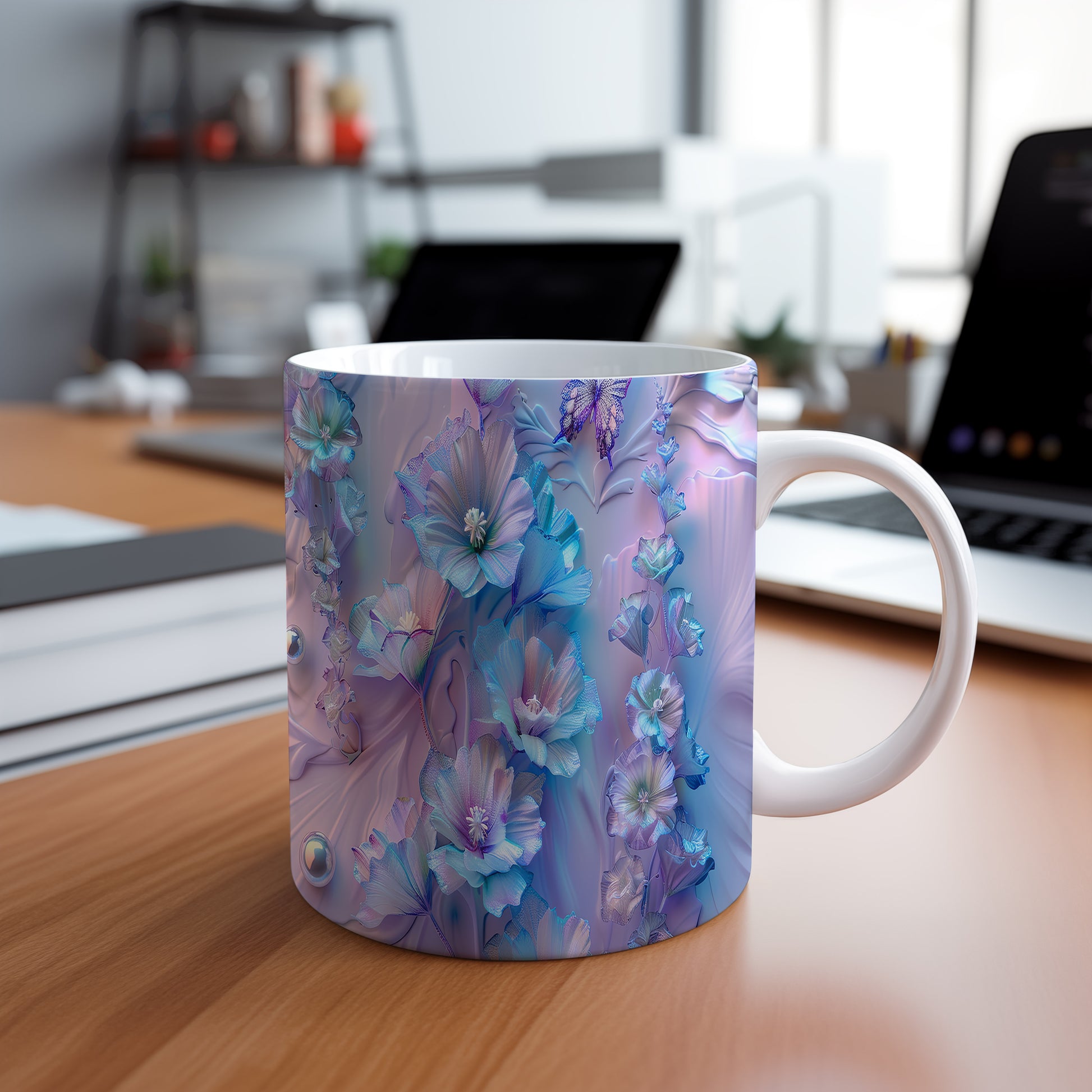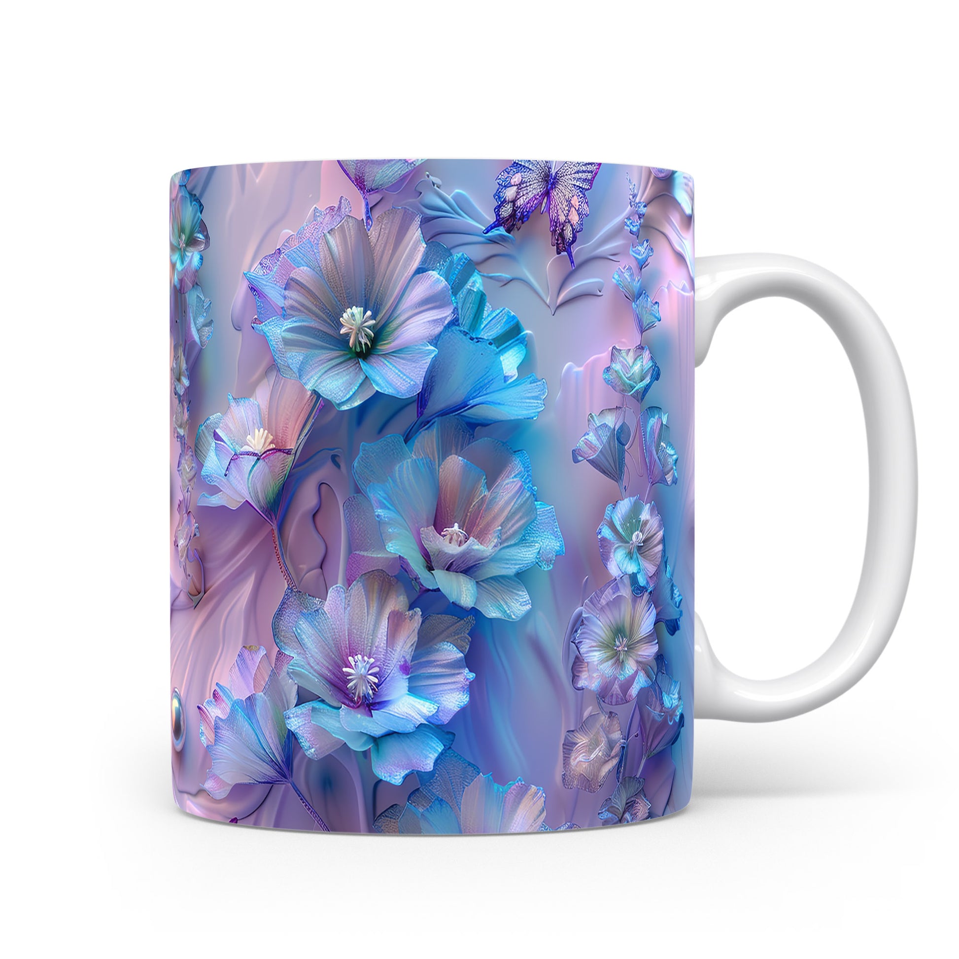 Hrnek s elegantními květinami v modrých a fialových tónech