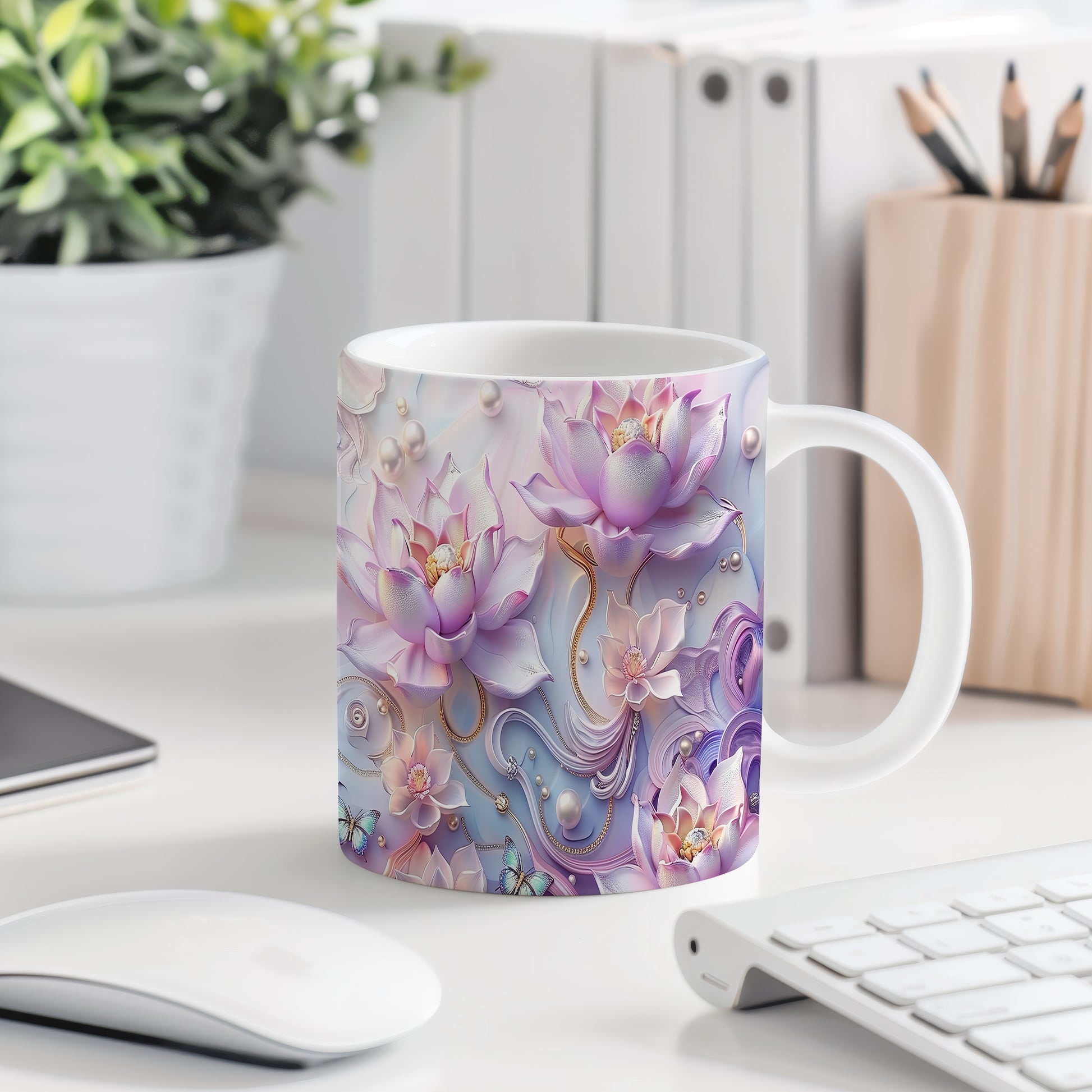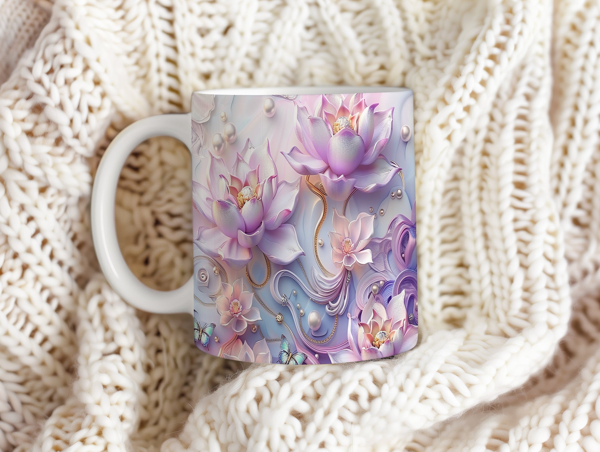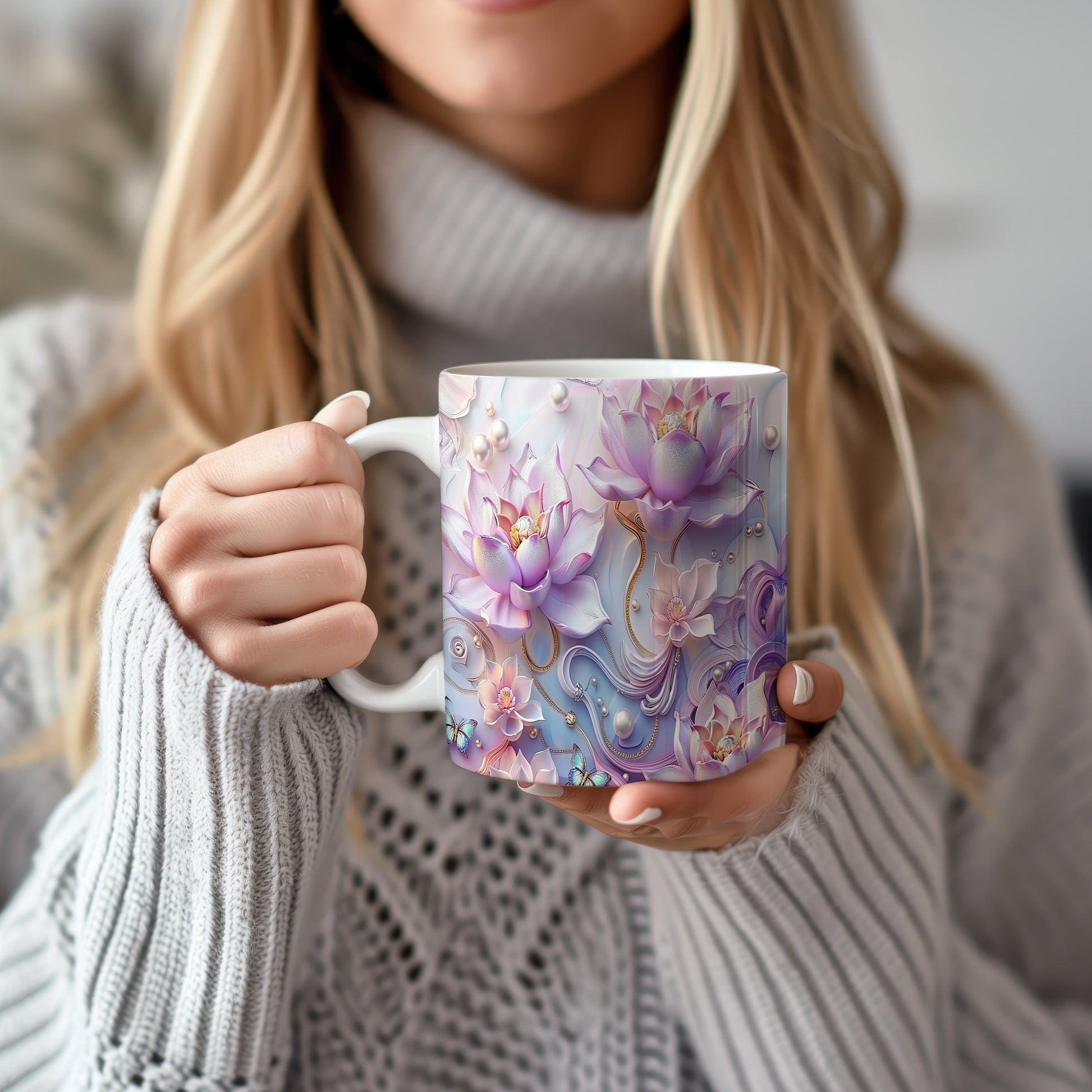 Hrnek s elegantními květinami v modrých a fialových tónech – 3D efektem