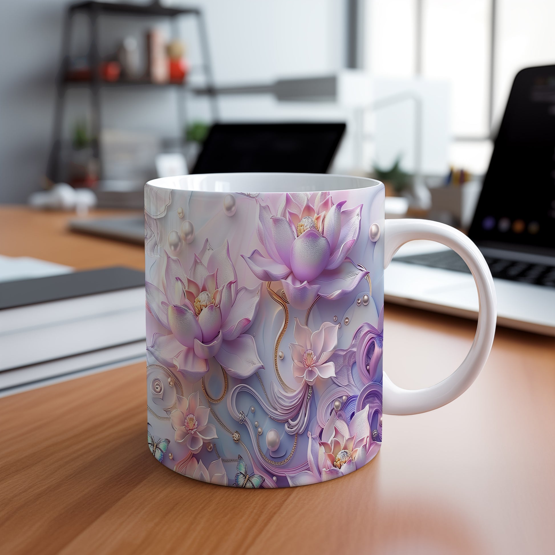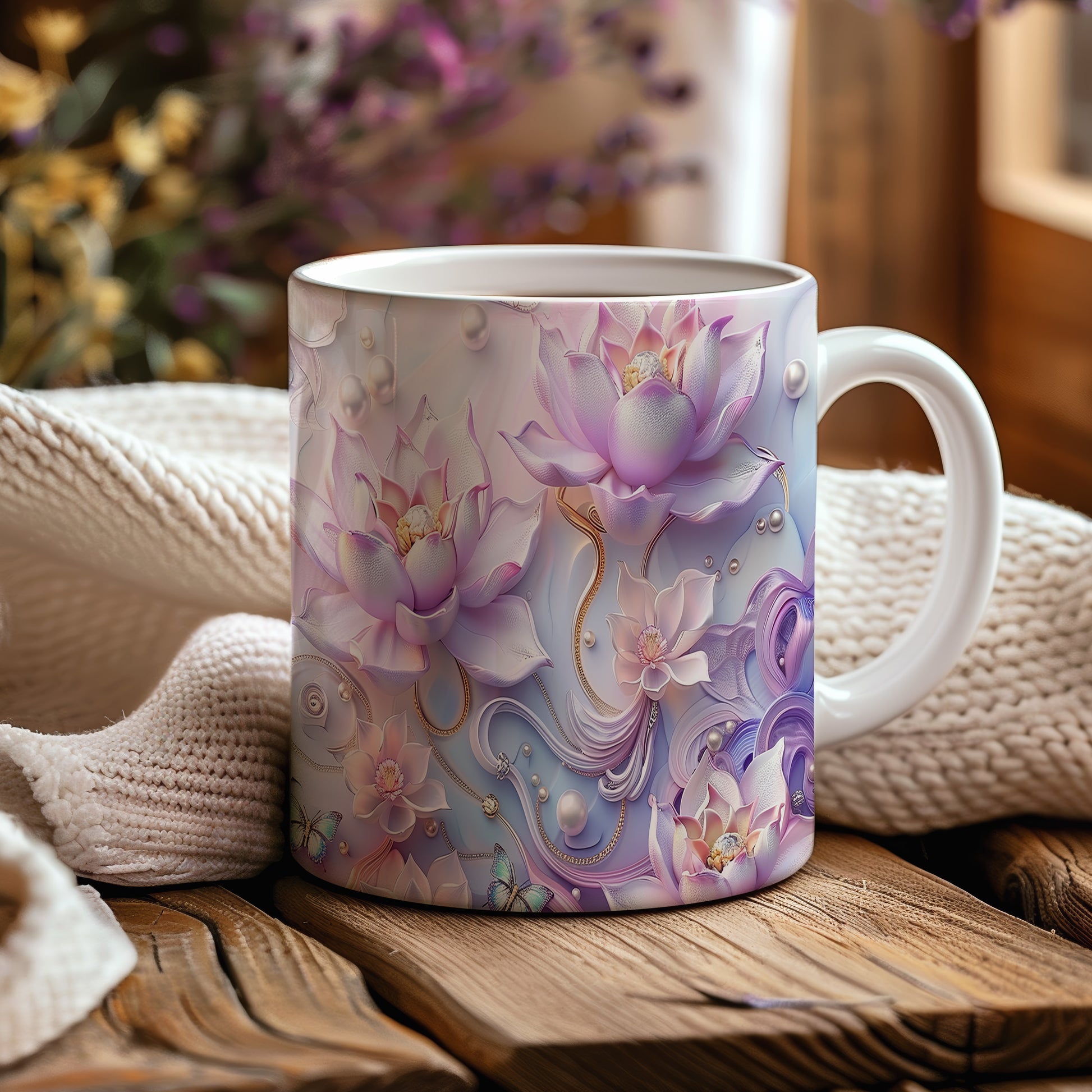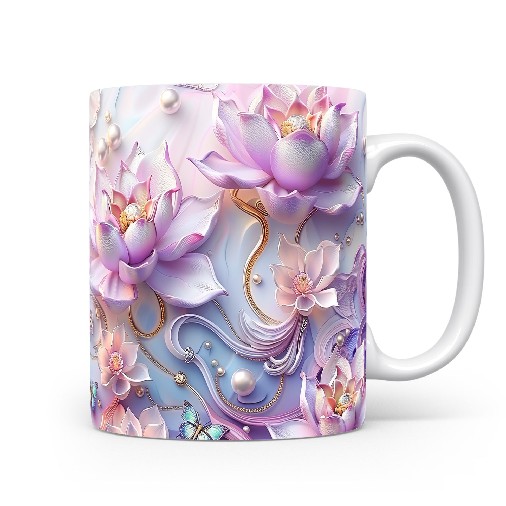 Hrnek s elegantními květinami v modrých a fialových tónech – 3D efektem