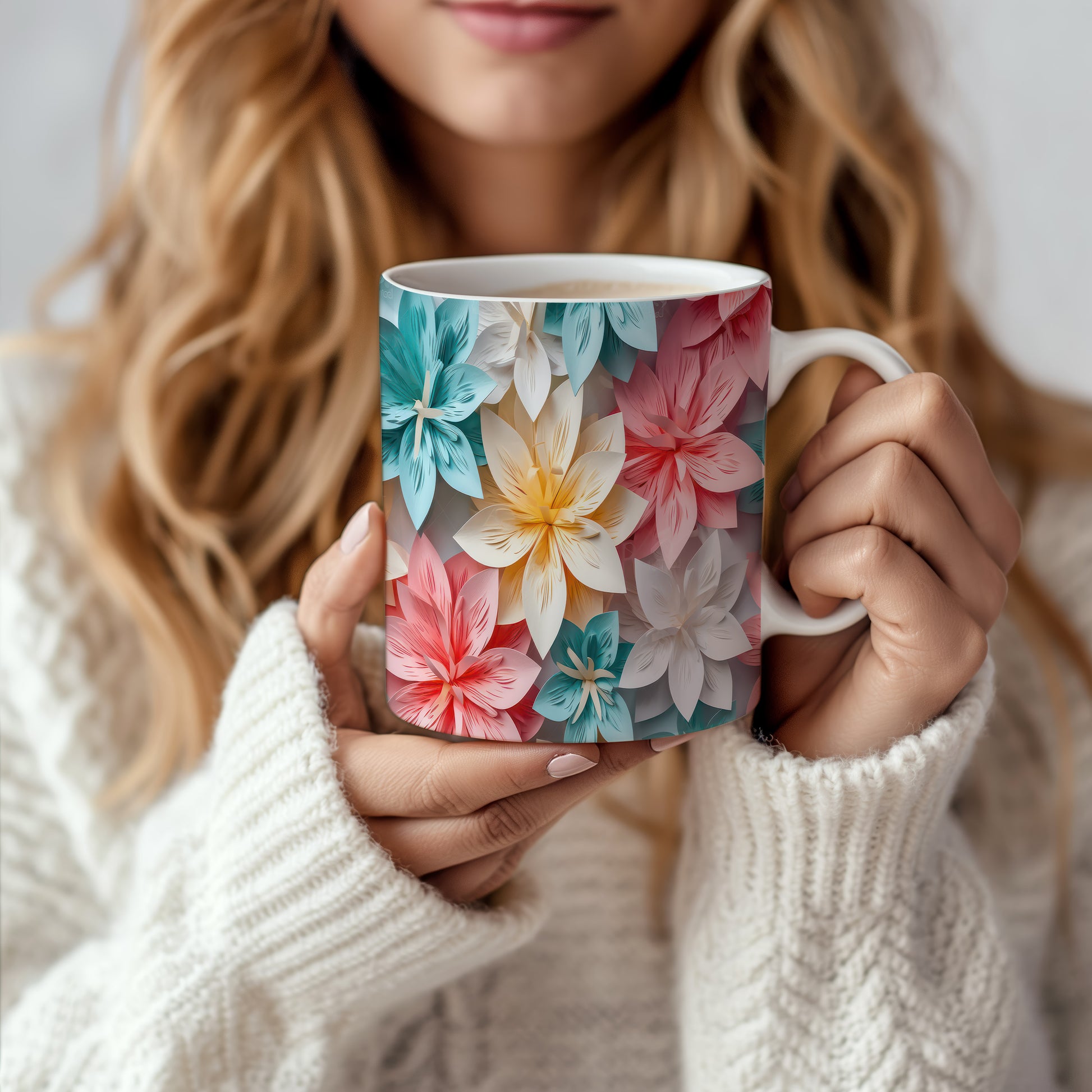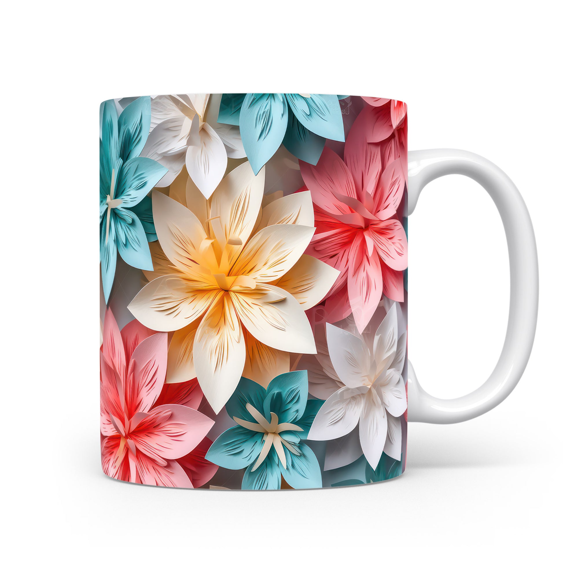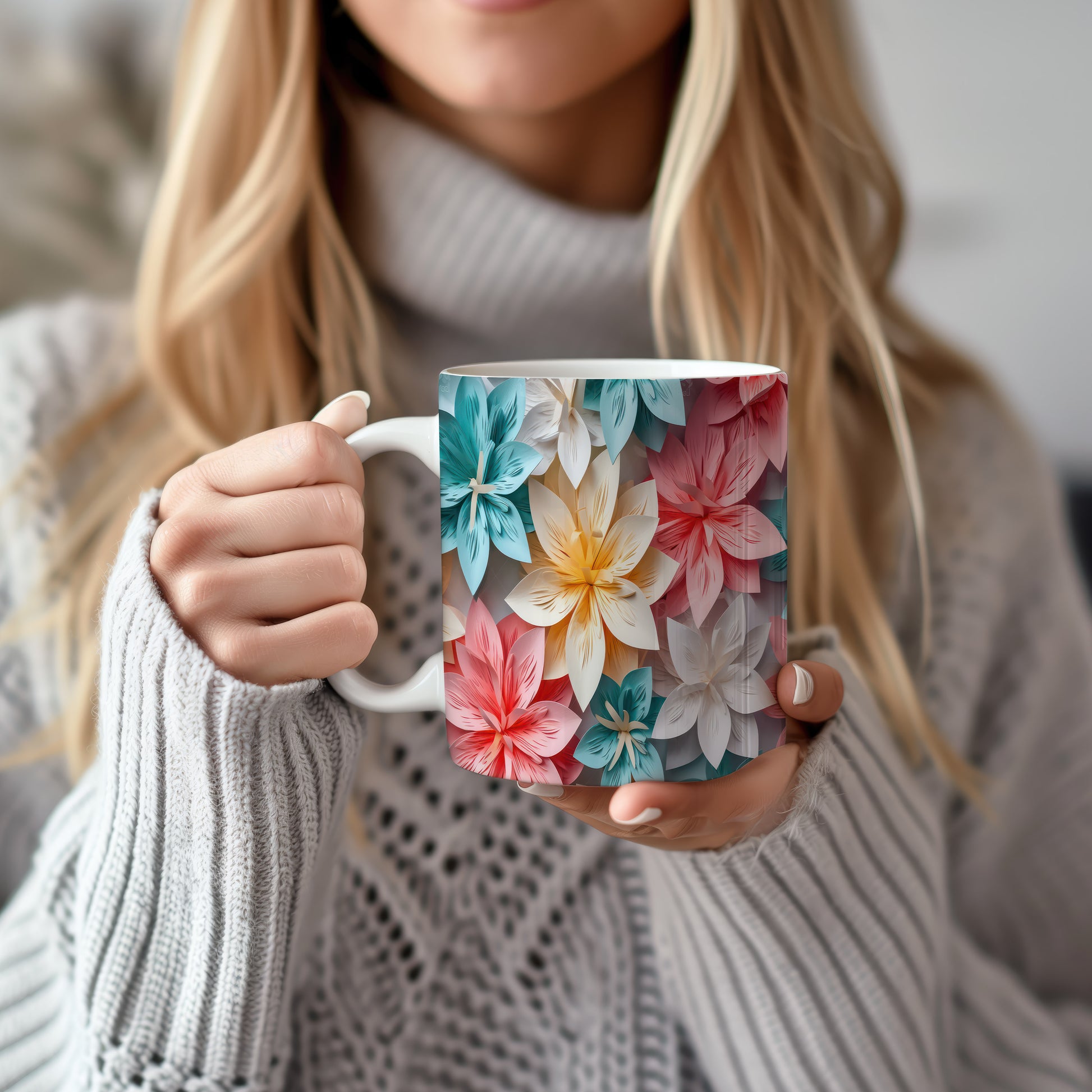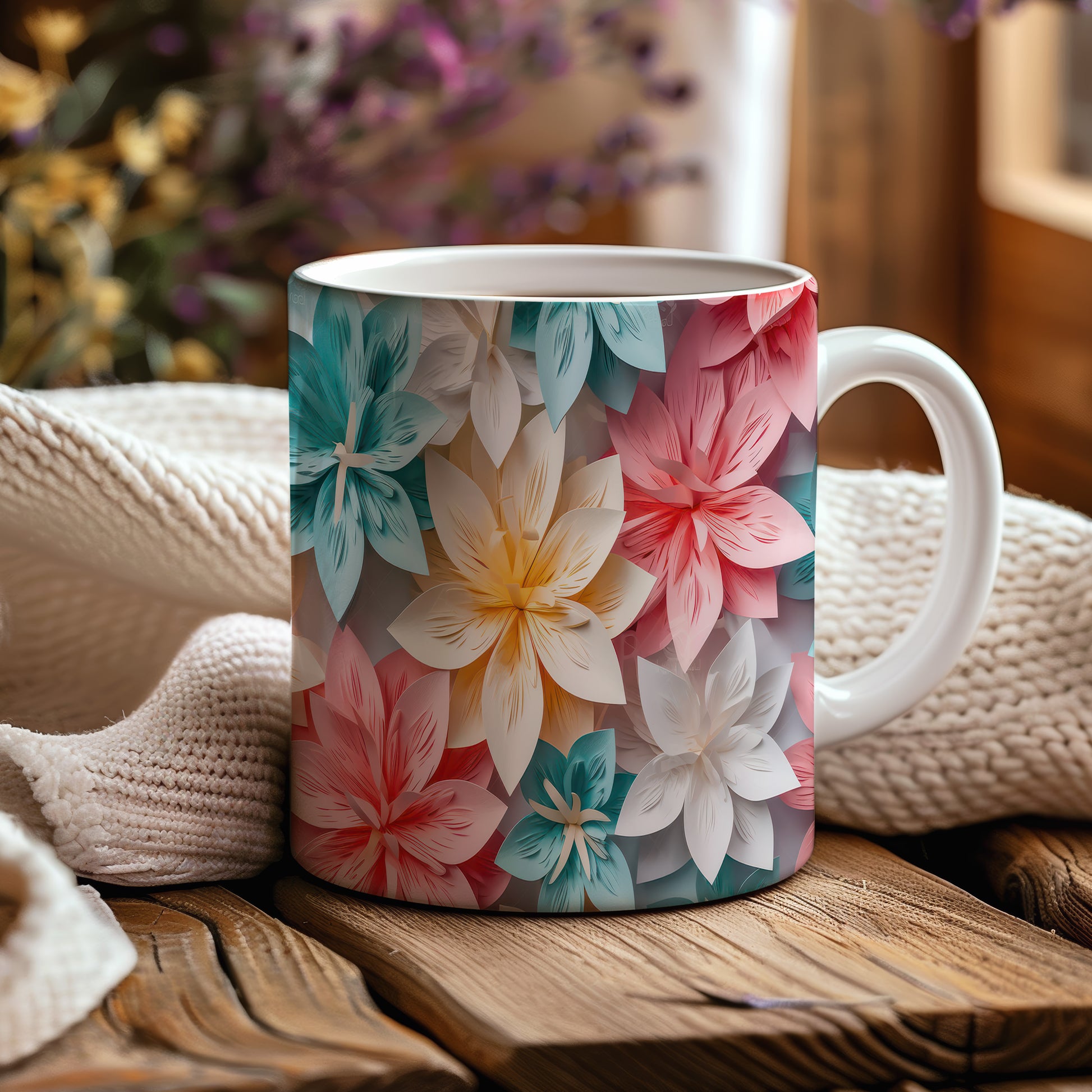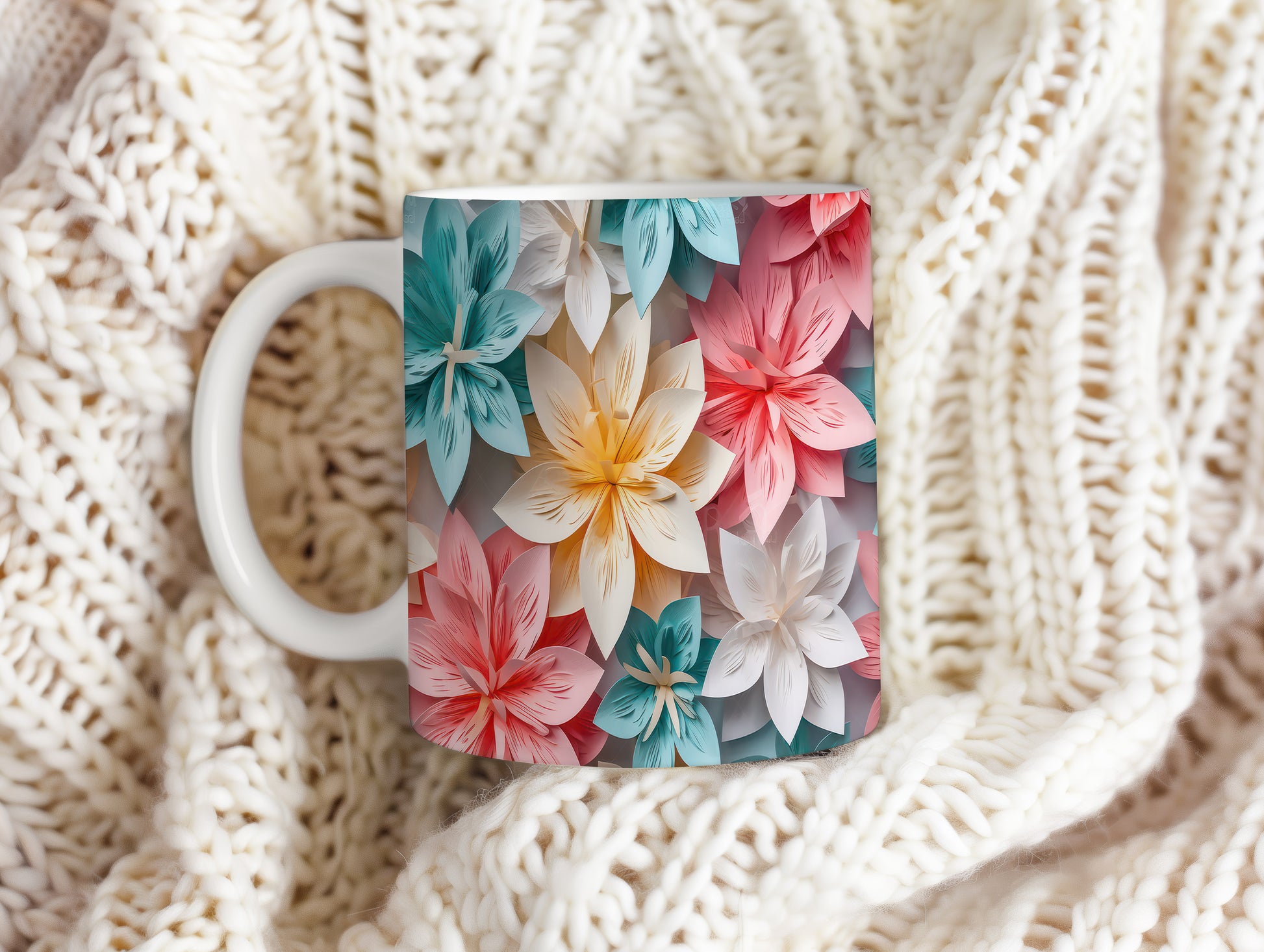 Hrnek s elegantními květinami v modrých a oranžových tónech