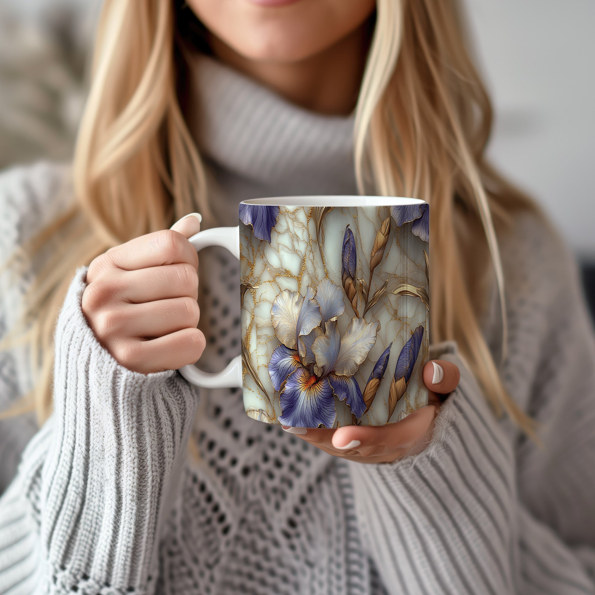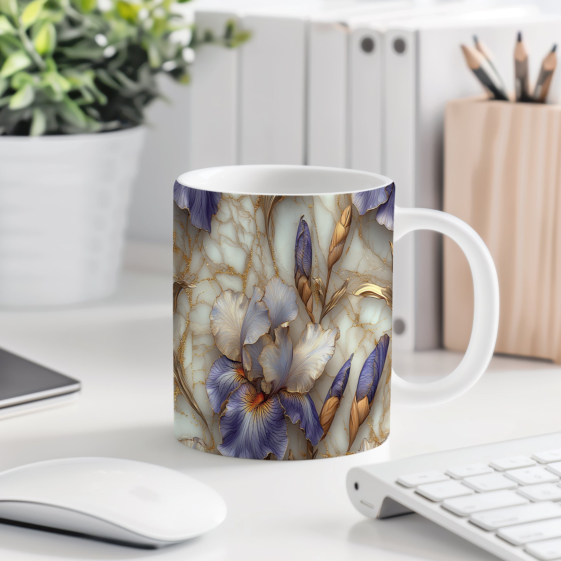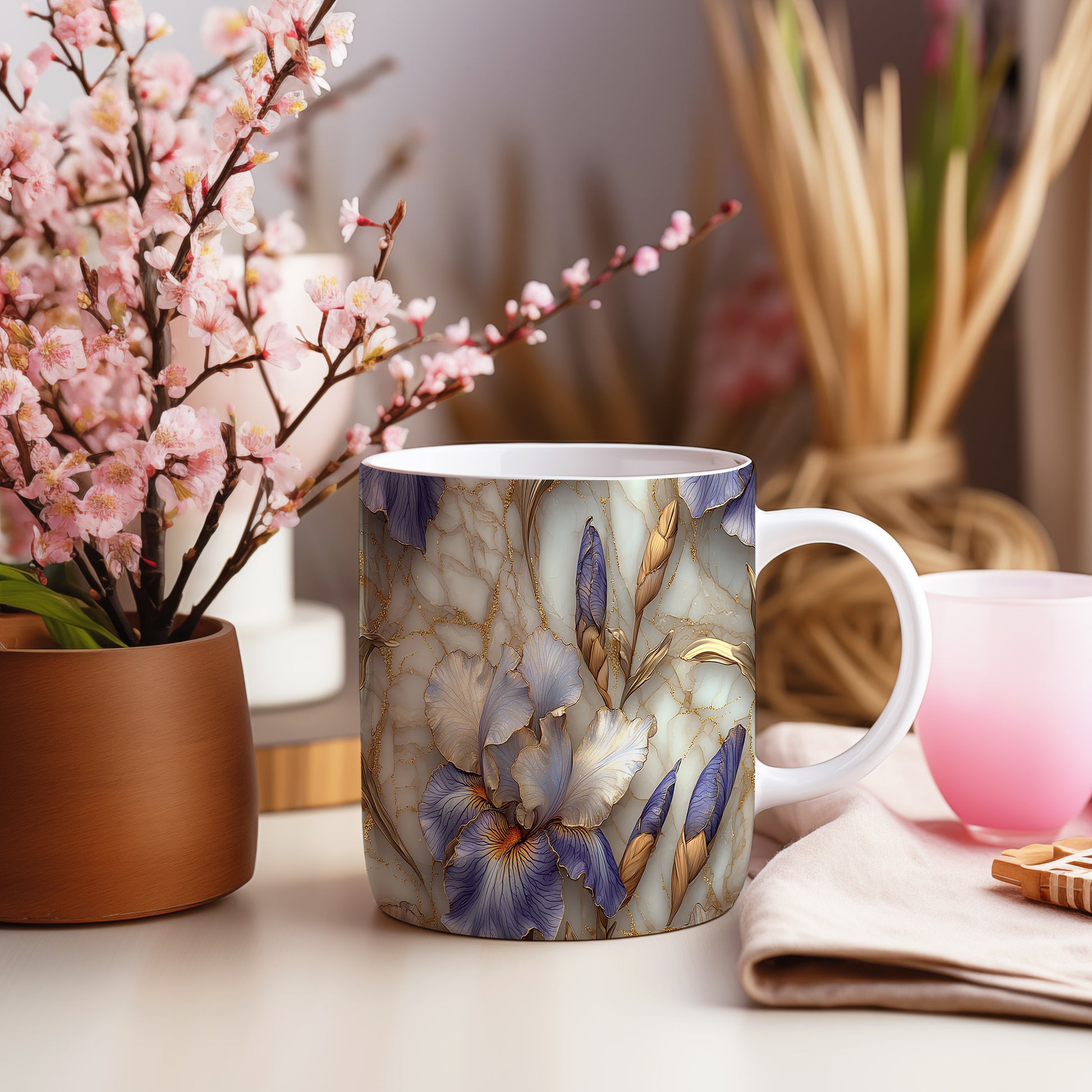 Hrnek s elegantními květinami v modrých a zlatých tónech