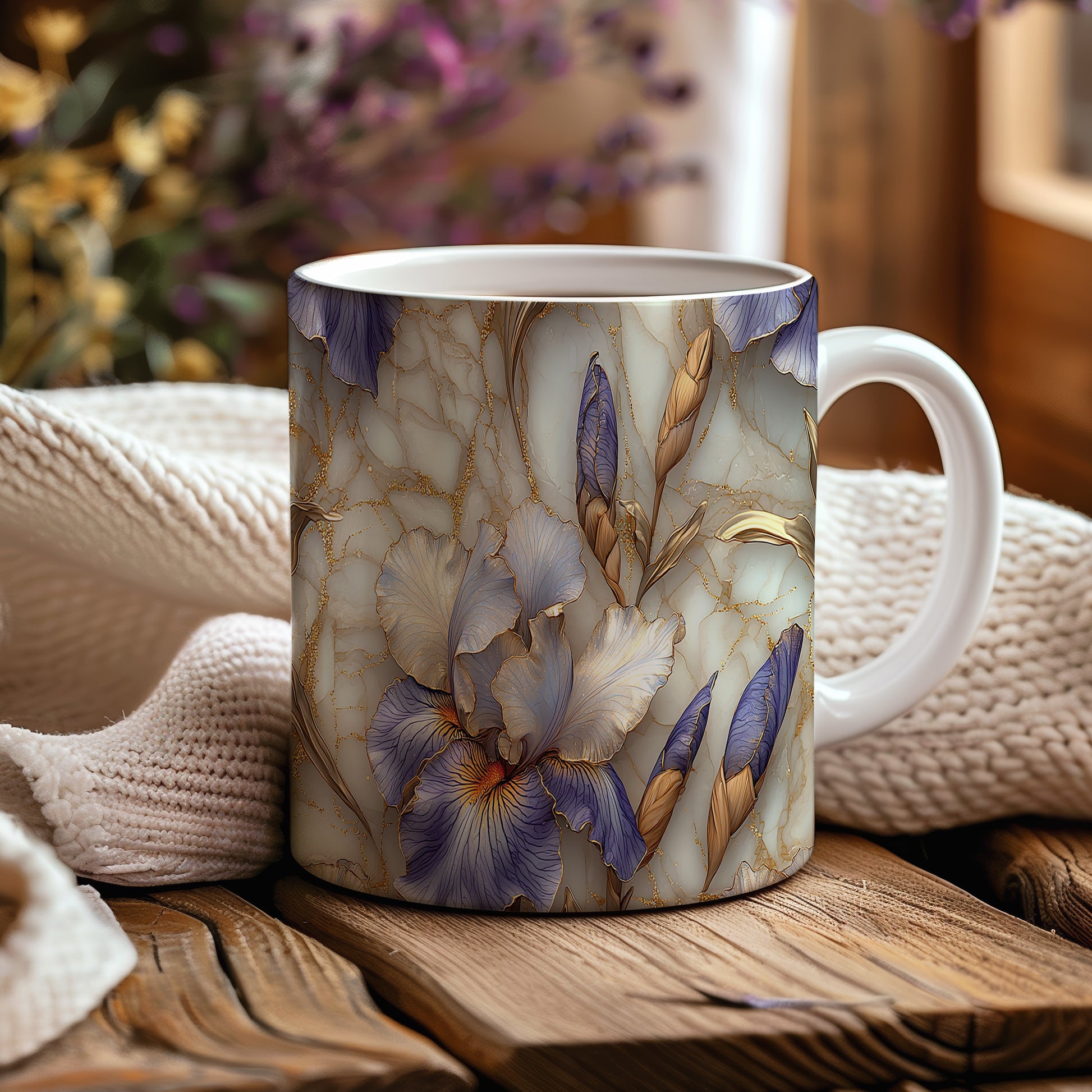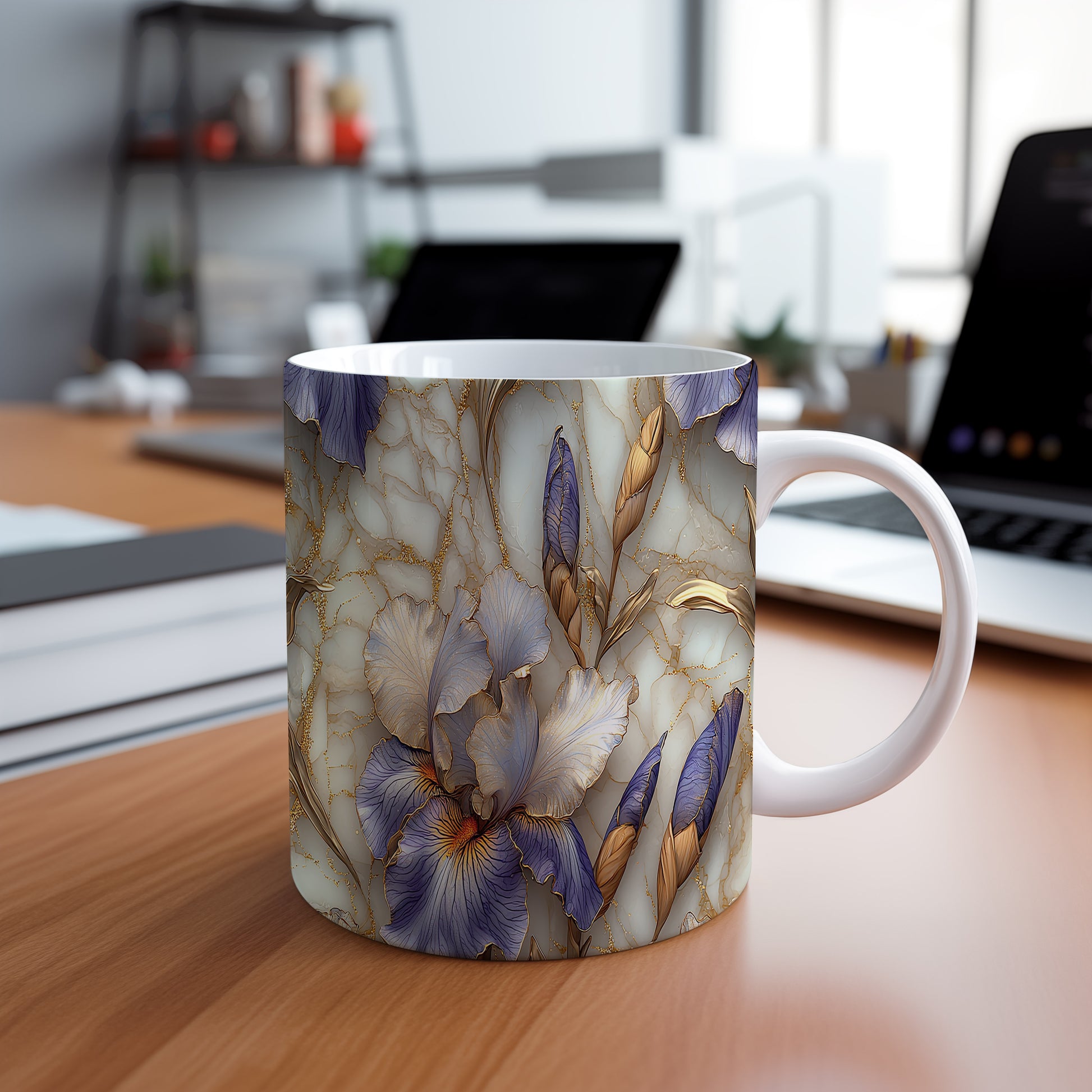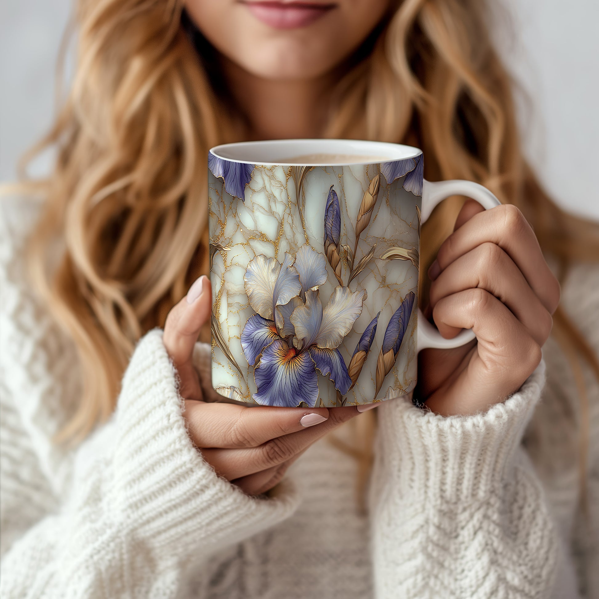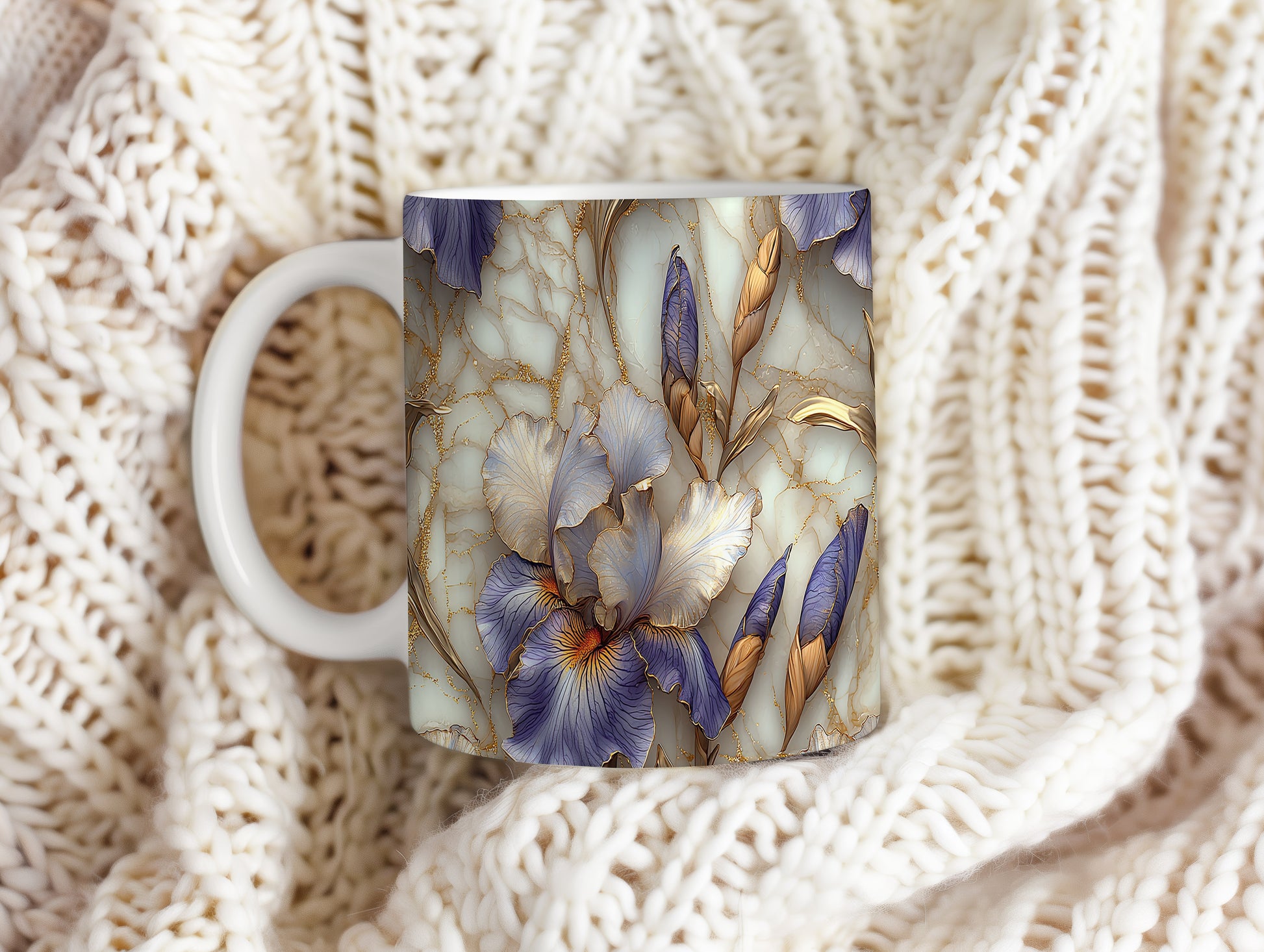 Hrnek s elegantními květinami v modrých a zlatých tónech