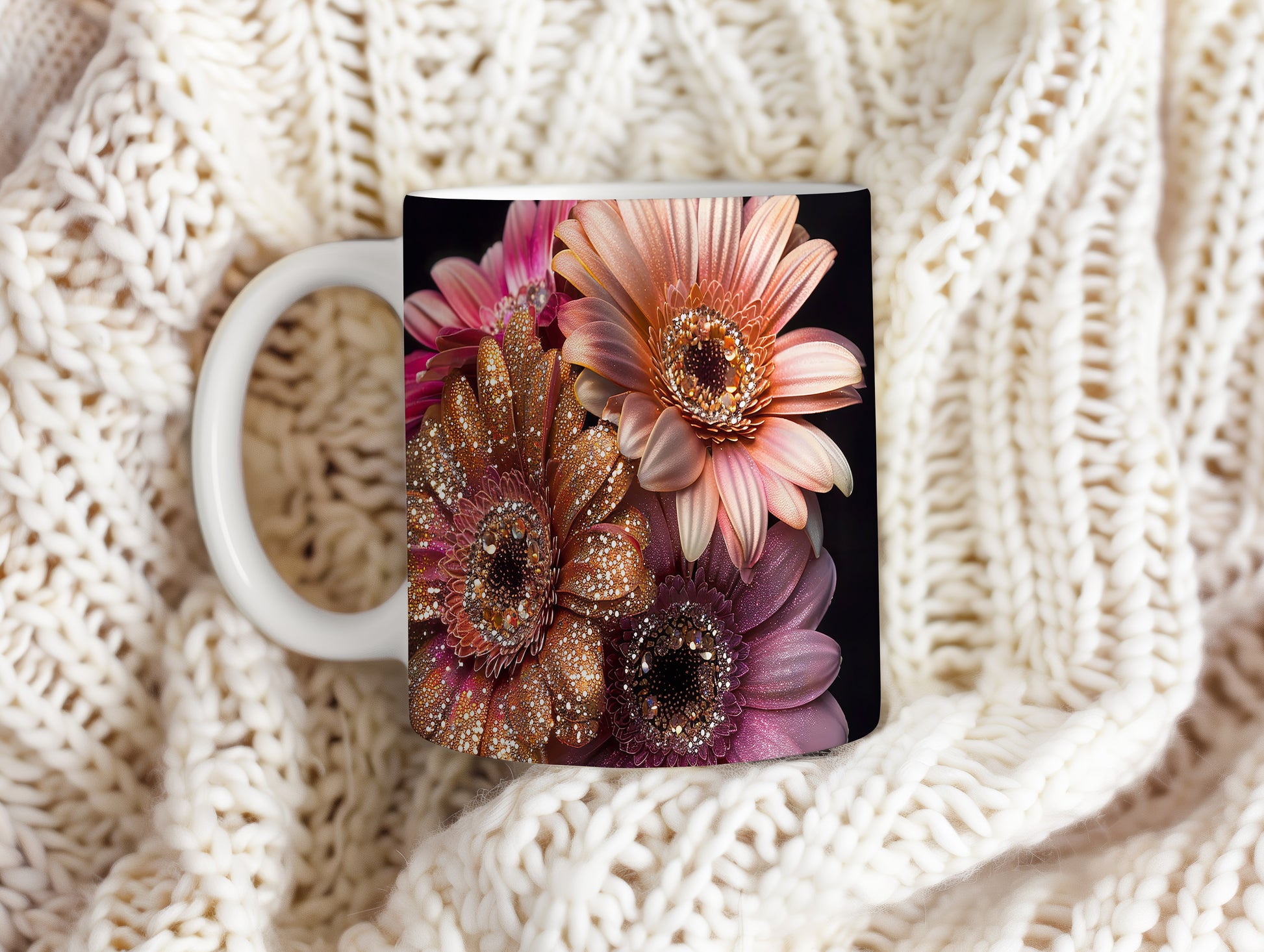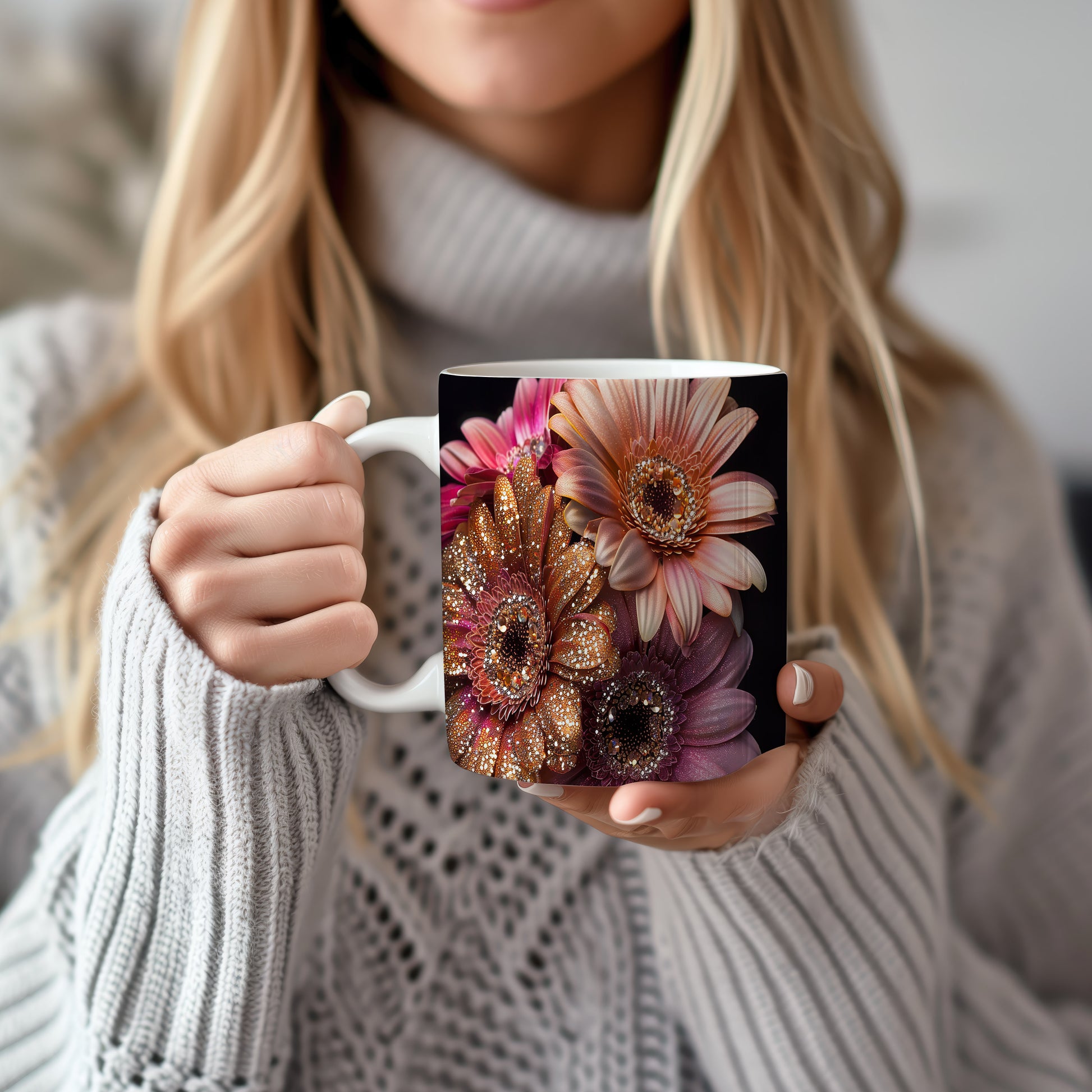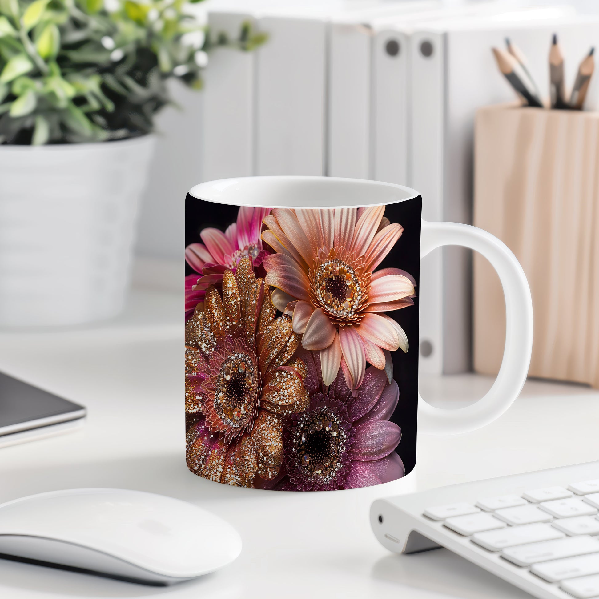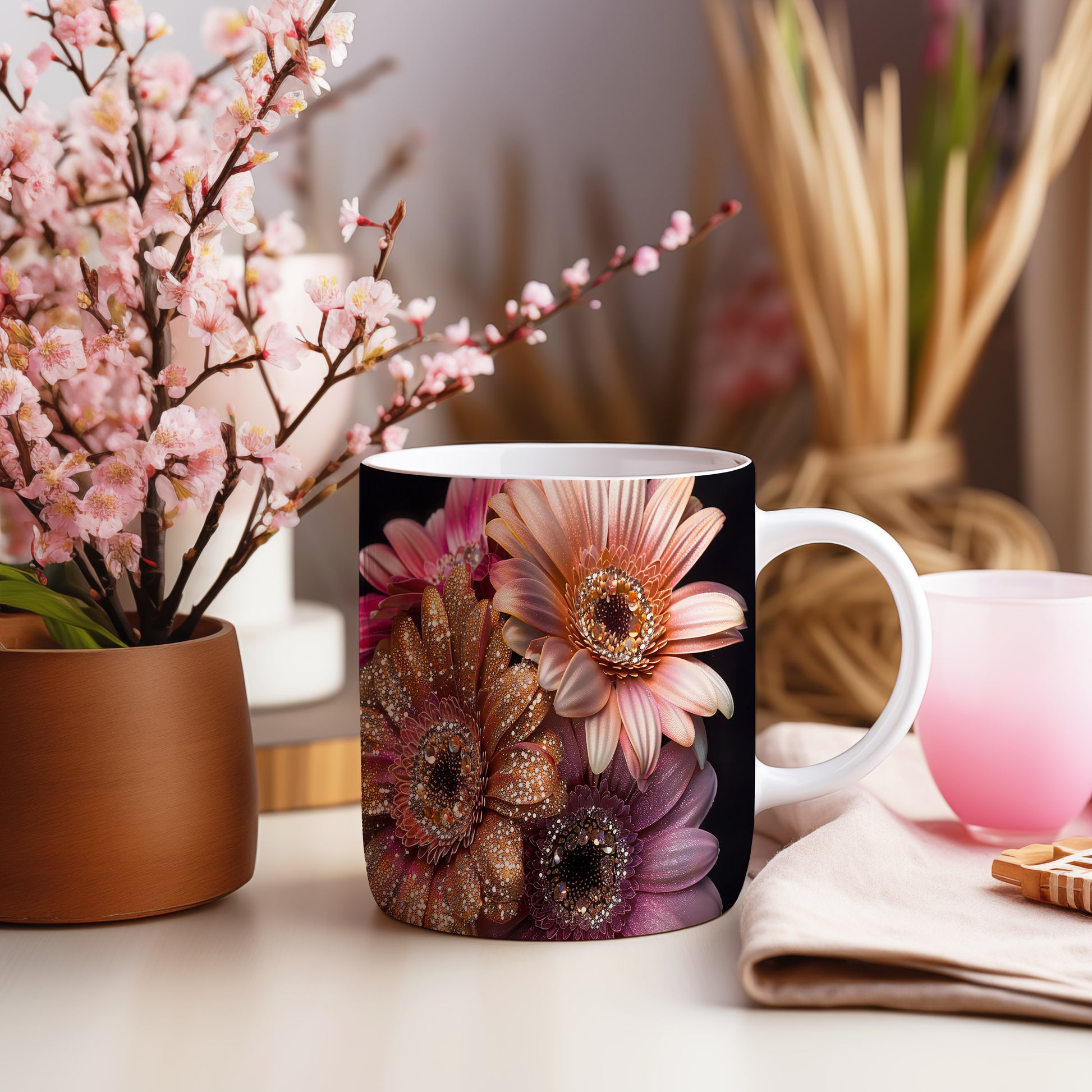 Hrnek s elegantními květinami v růžových a zlatých tónech
