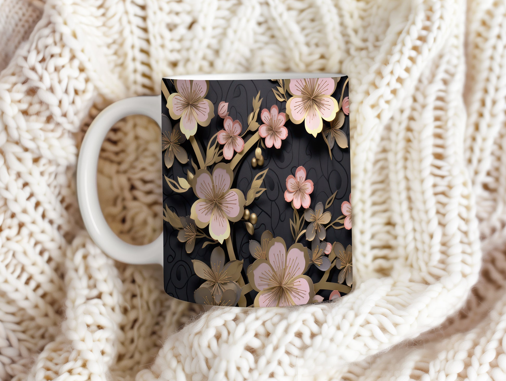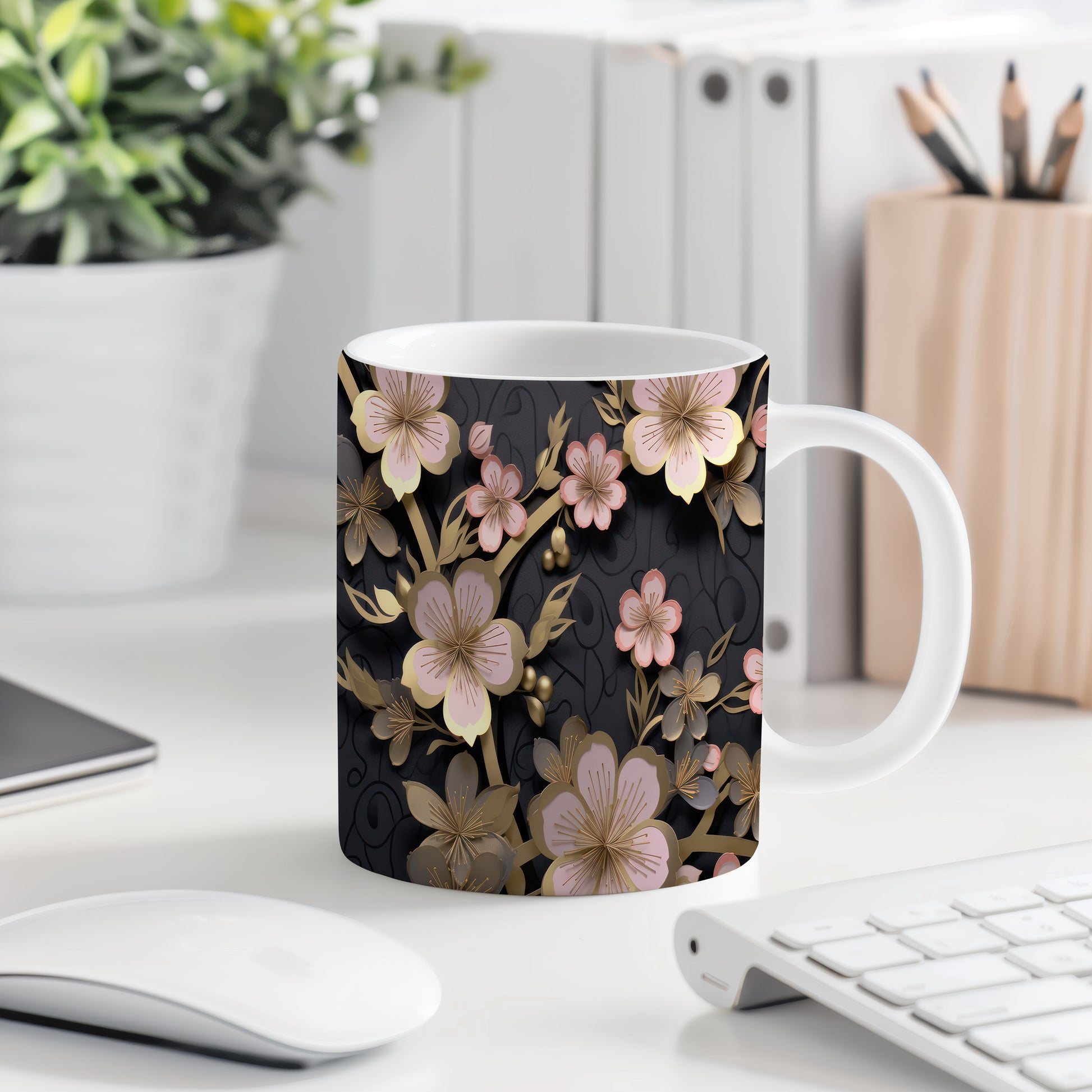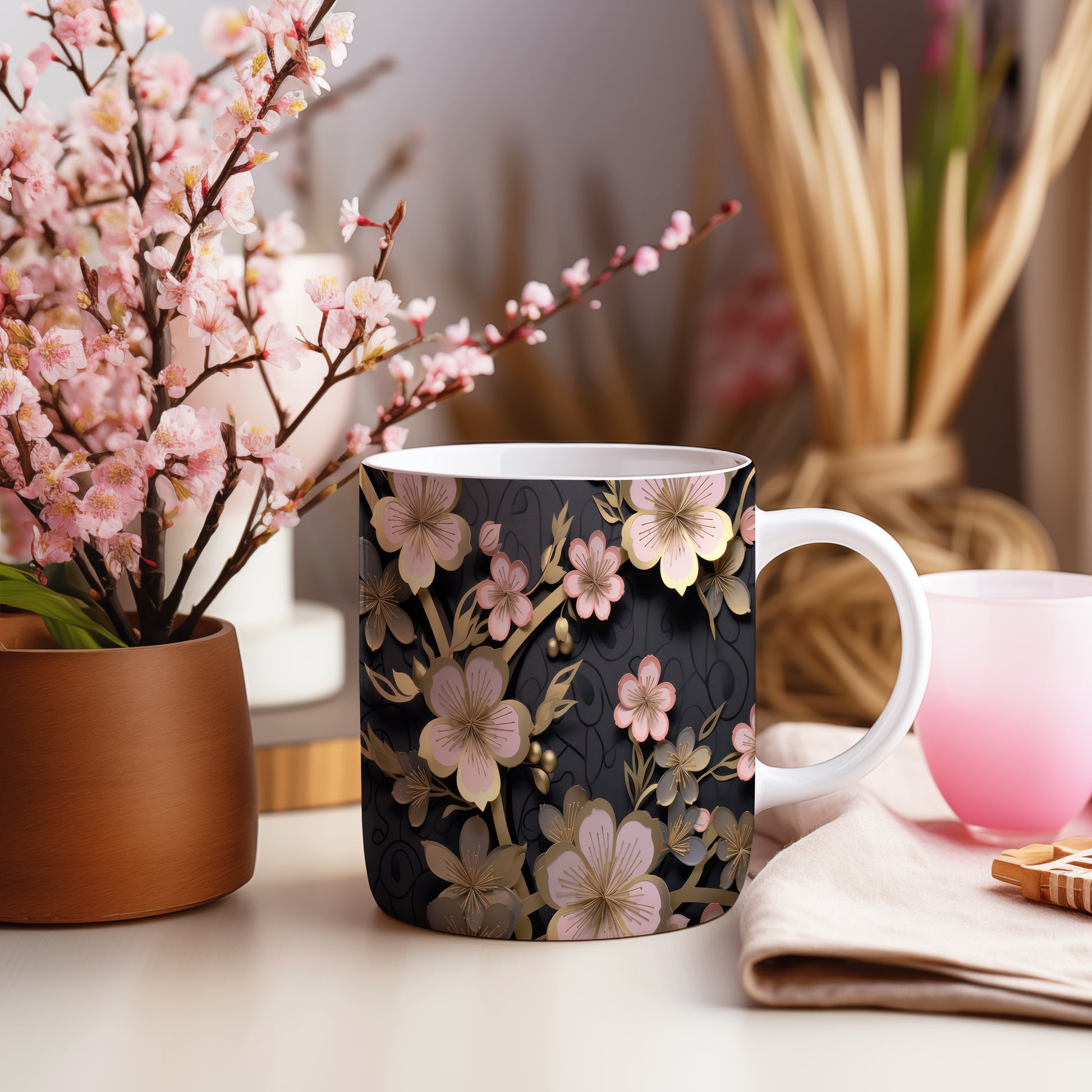 Hrnek s elegantními květinami v růžových tónech