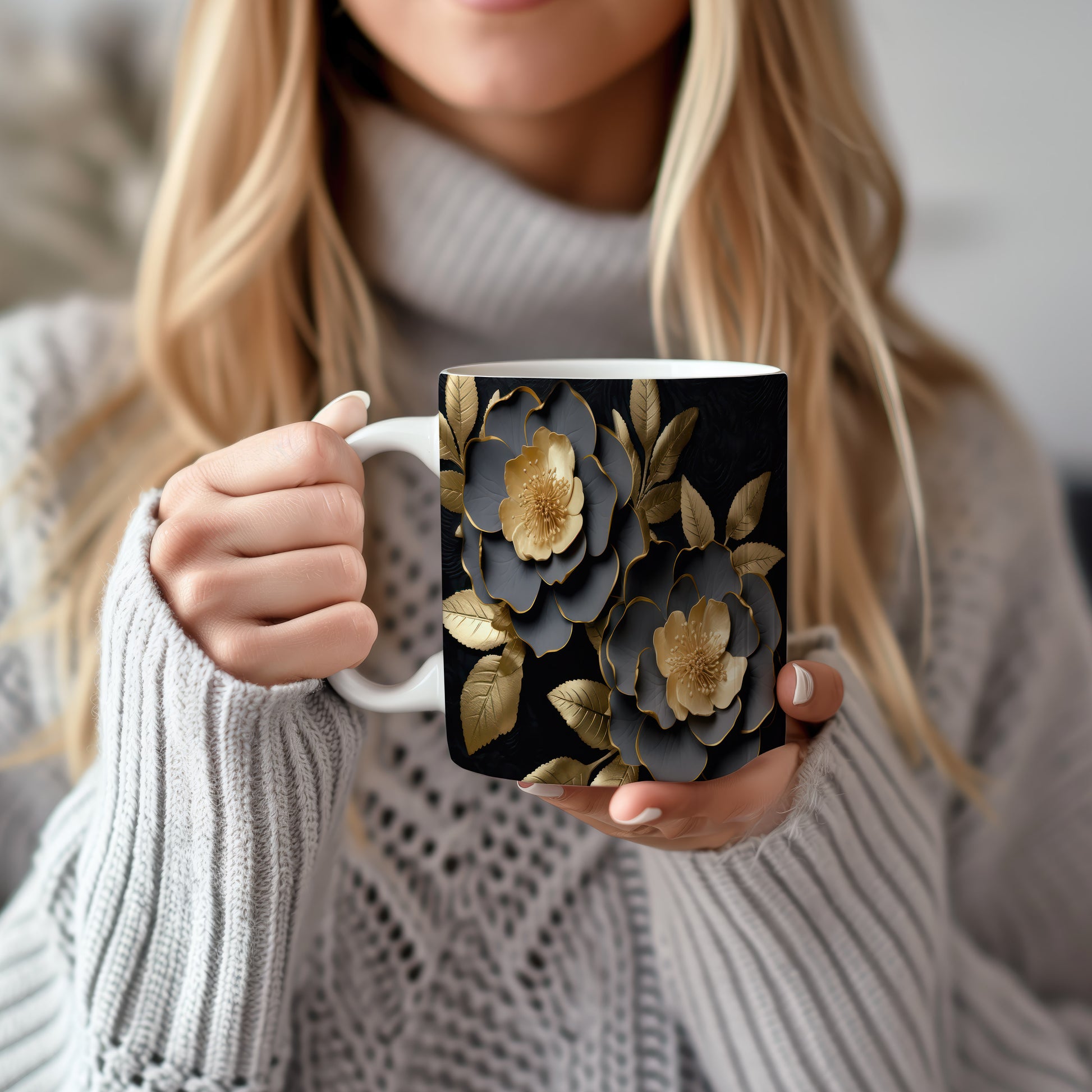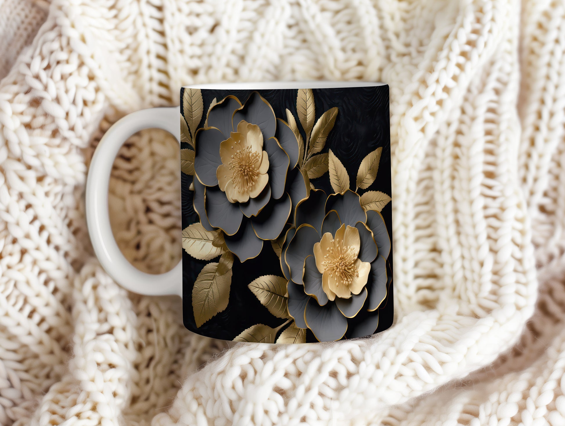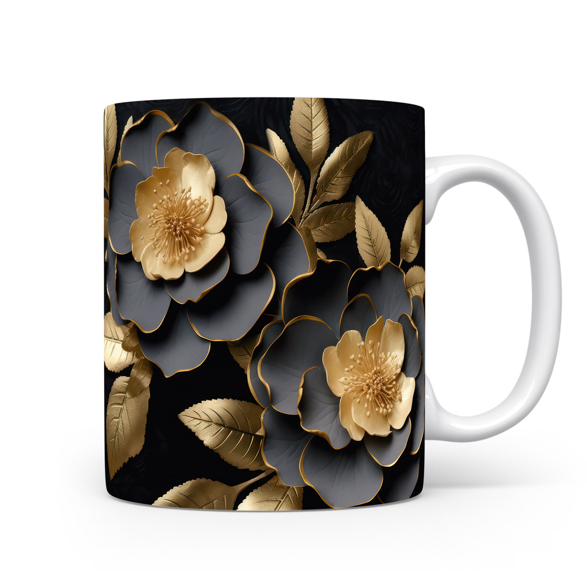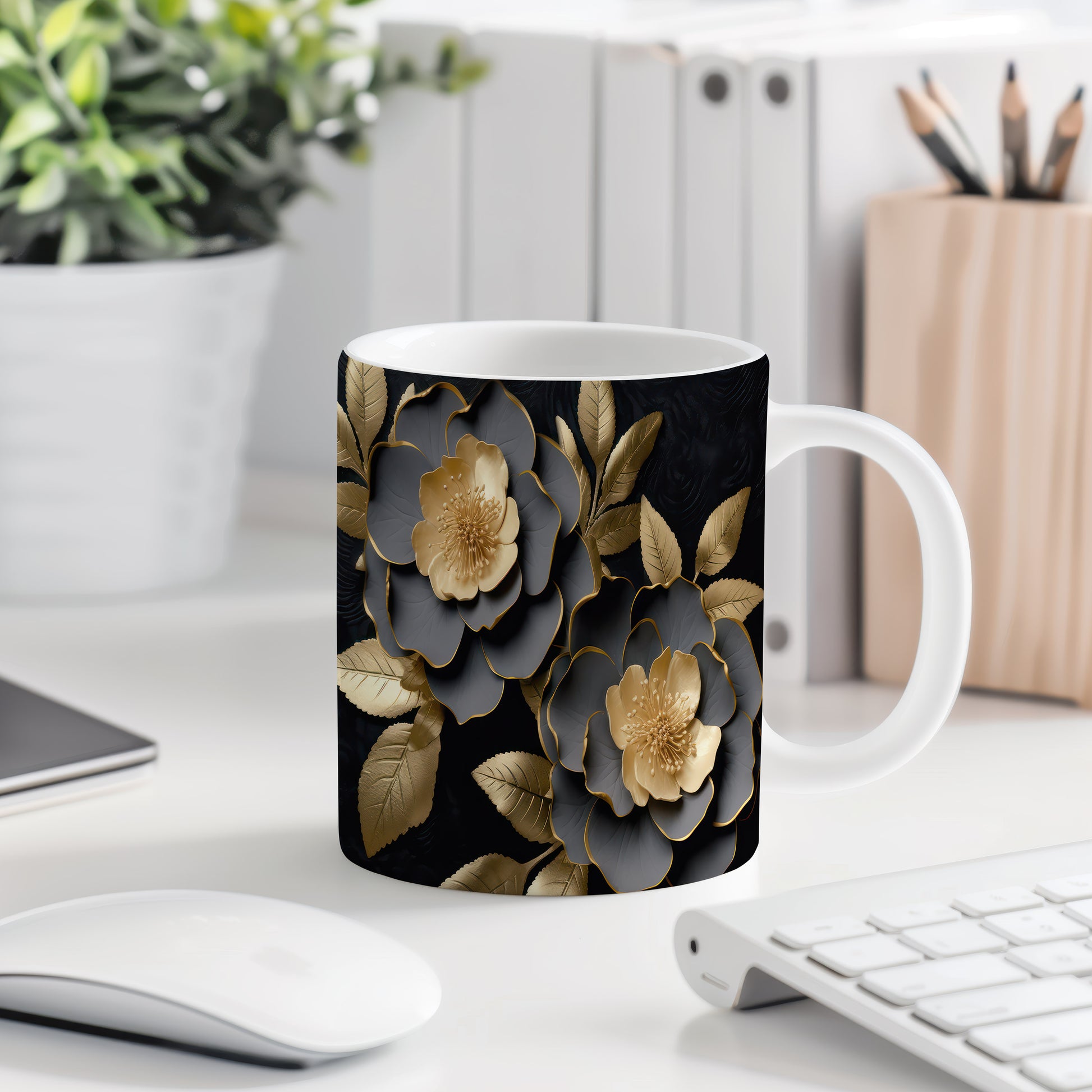Hrnek s elegantními květinami v zlaté a černé barvě