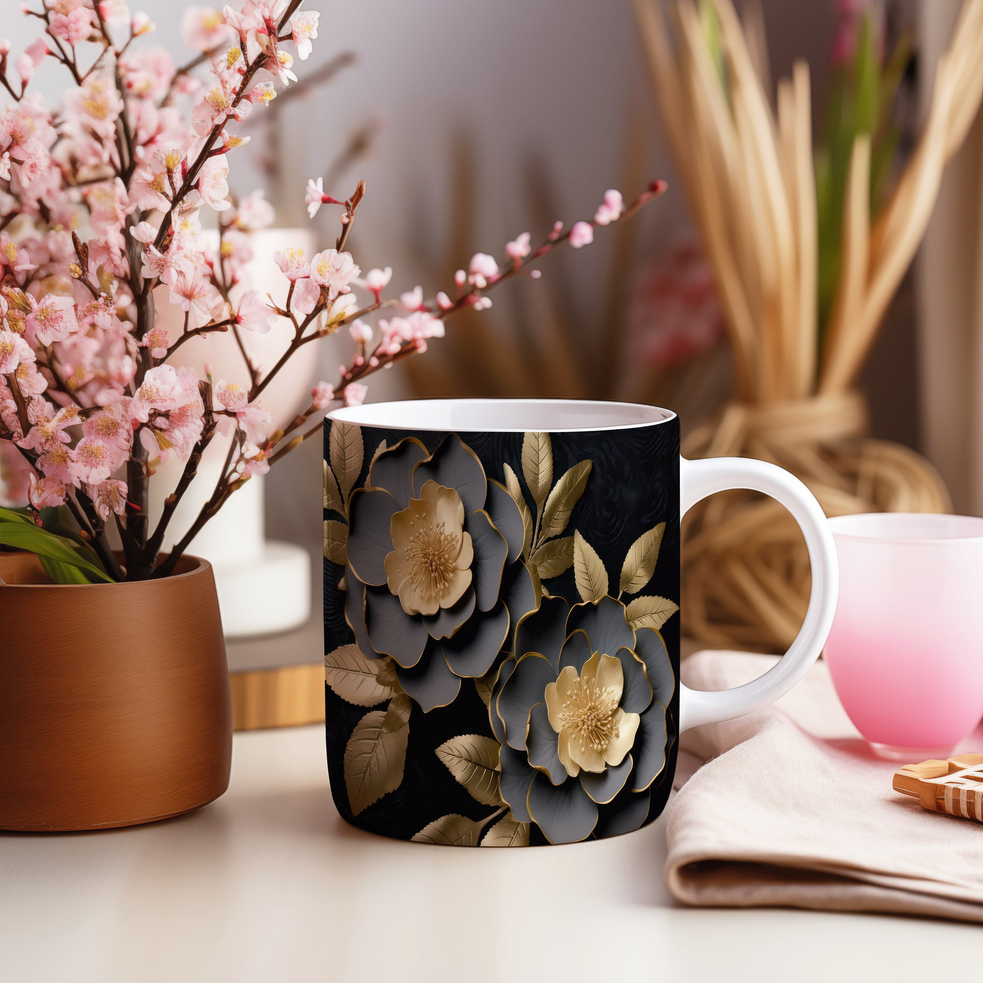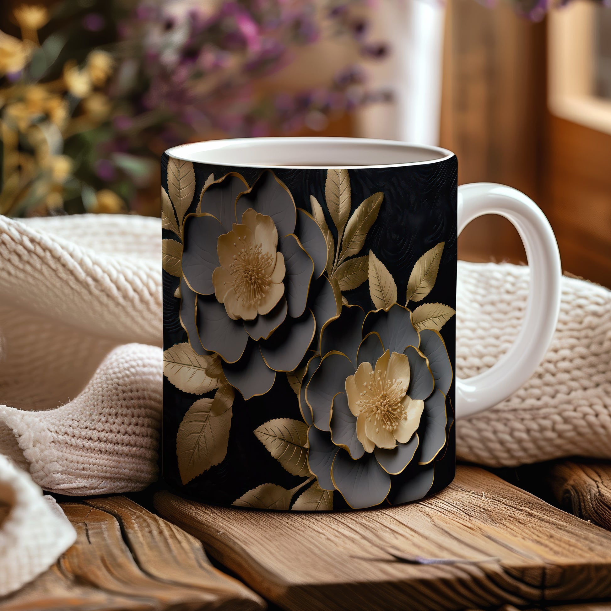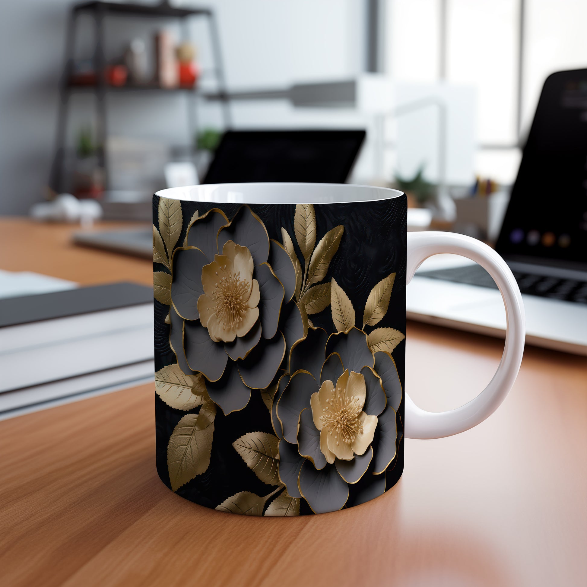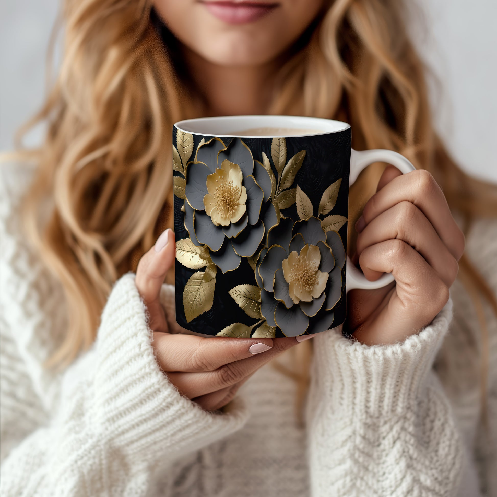 Hrnek s elegantními květinami v zlaté a černé barvě