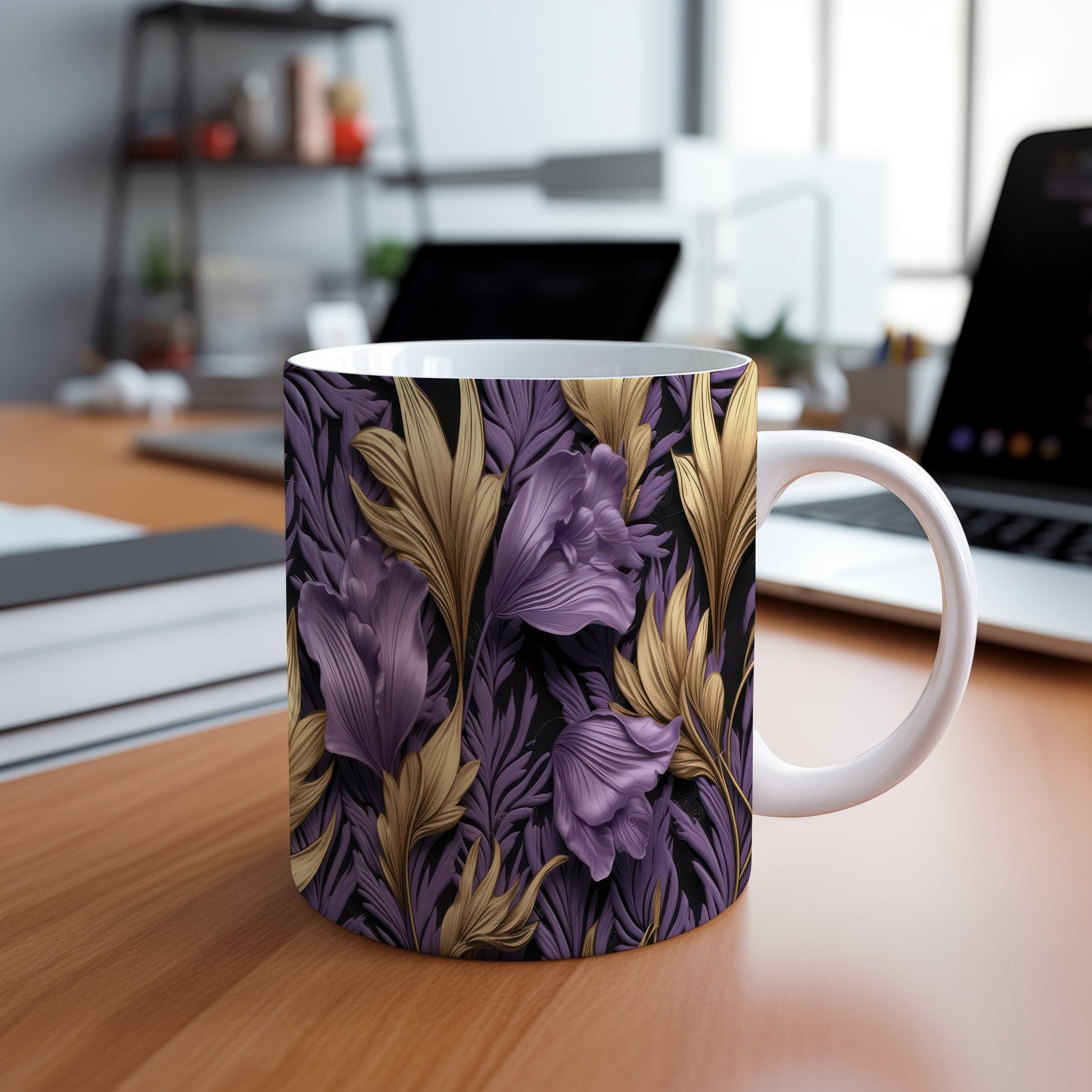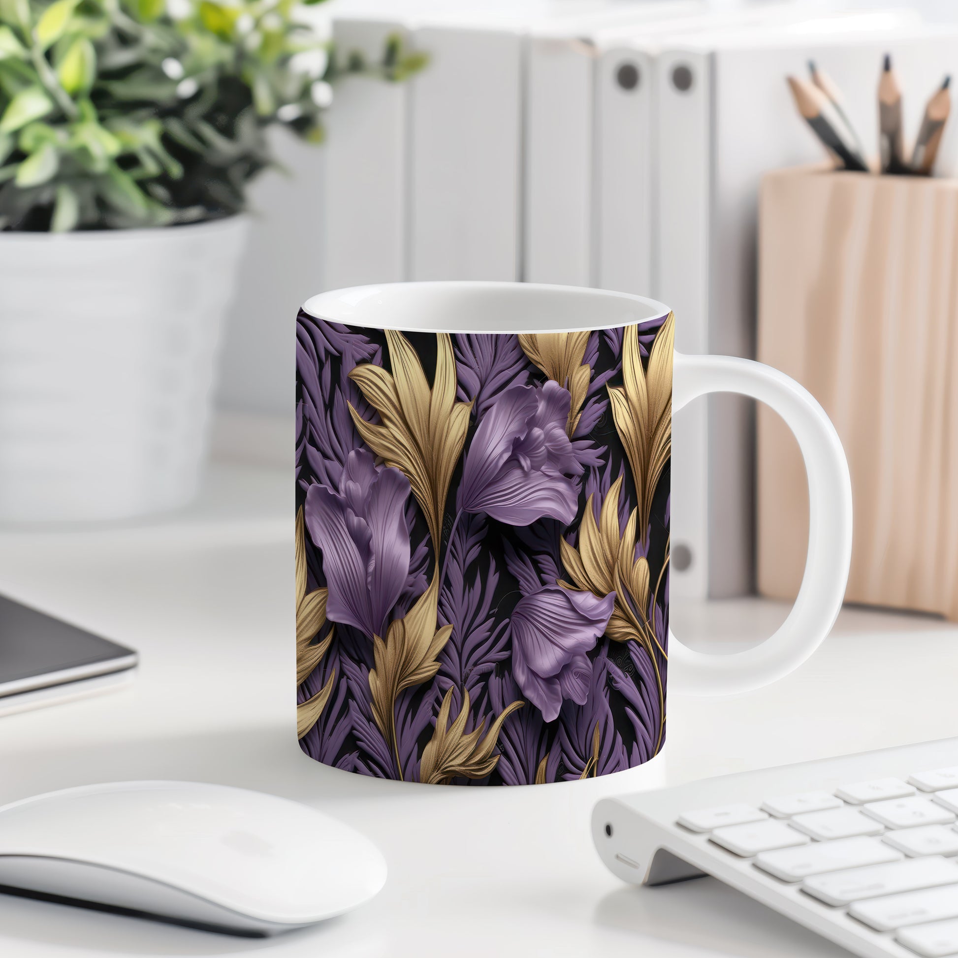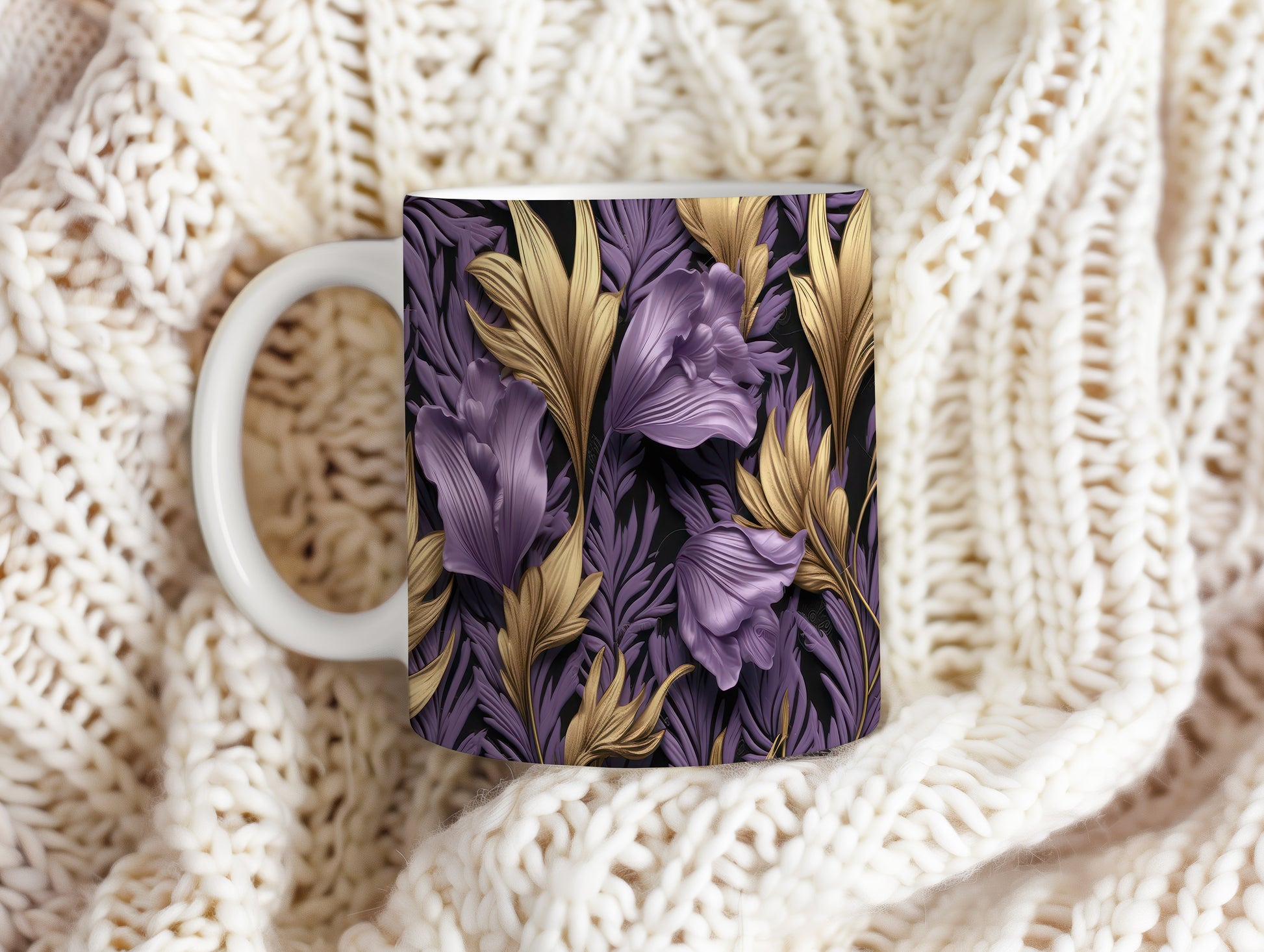 Tento hrnek zdobí krásný vzor fialových květin a zlatých listů na černém pozadí. Je ideální pro každodenní používání doma nebo v kanceláři a skvěle se hodí jako dárek pro milovníky květin. Materiál: keramika. Objem: 330 ml. Vhodné do myčky i mikrovlnky. Díky svému designu přináší do vašeho pití špetku elegance.