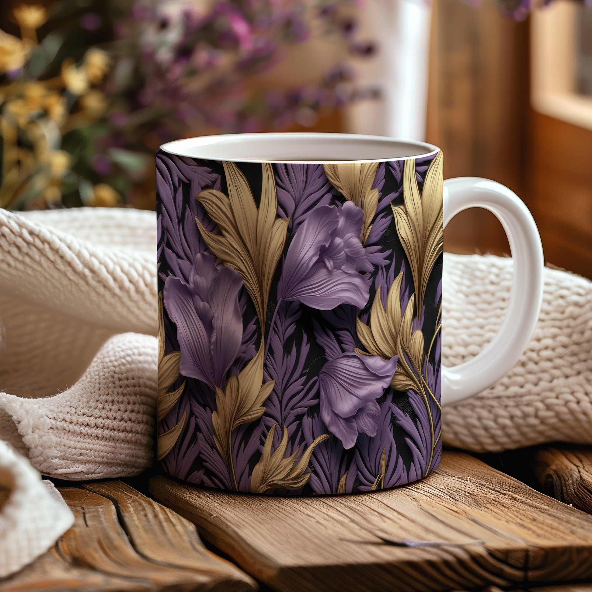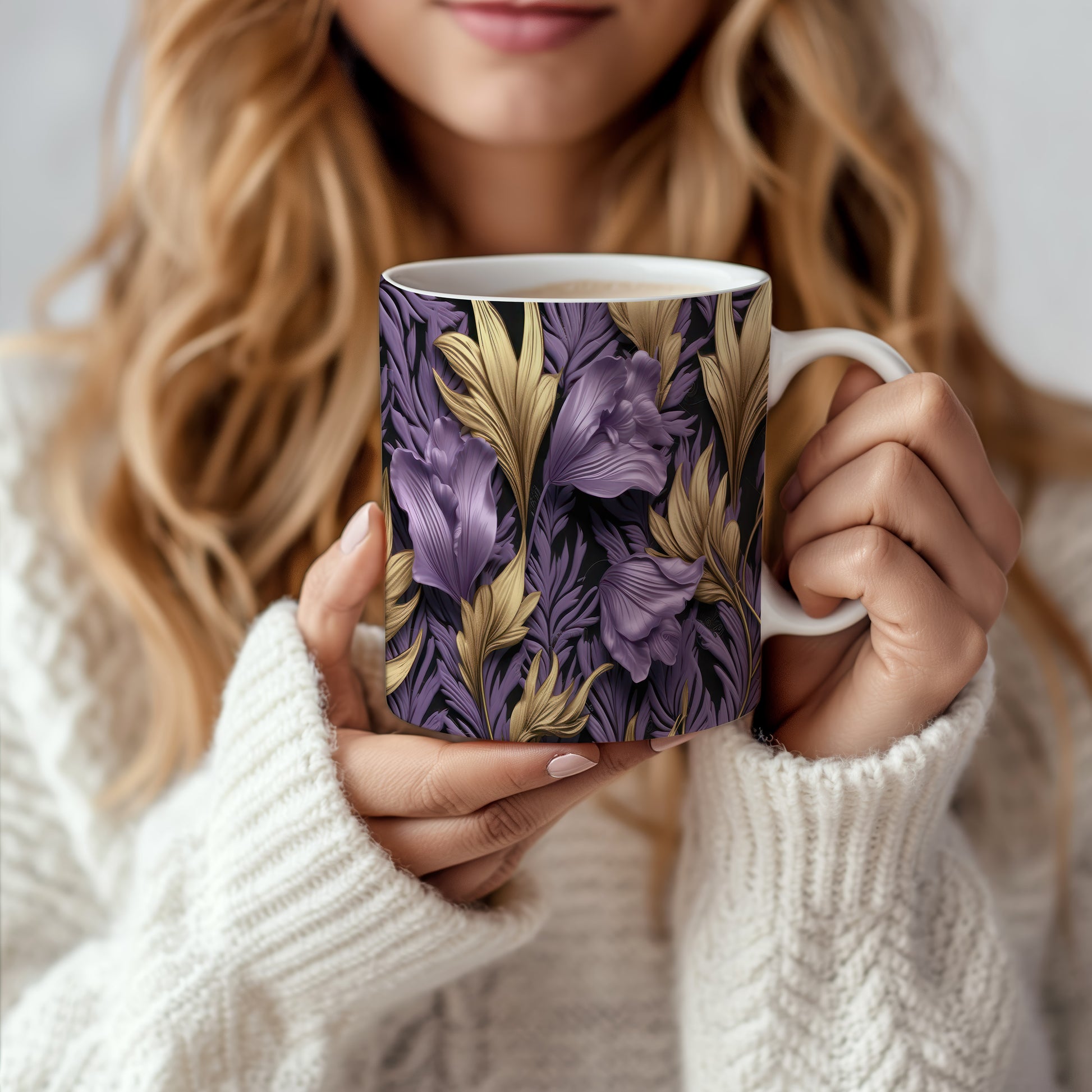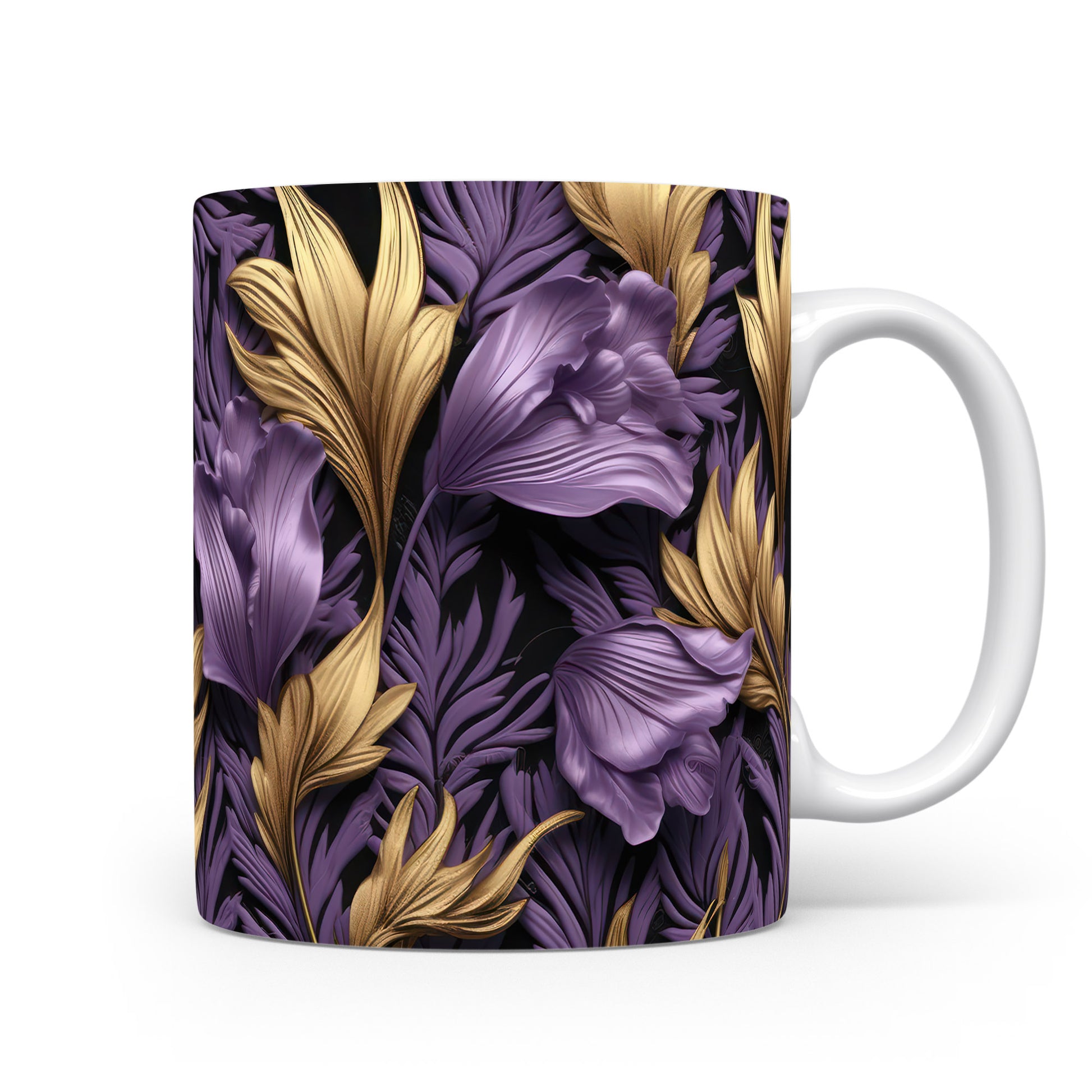 Tento hrnek zdobí krásný vzor fialových květin a zlatých listů na černém pozadí. Je ideální pro každodenní používání doma nebo v kanceláři a skvěle se hodí jako dárek pro milovníky květin. Materiál: keramika. Objem: 330 ml. Vhodné do myčky i mikrovlnky. Díky svému designu přináší do vašeho pití špetku elegance.