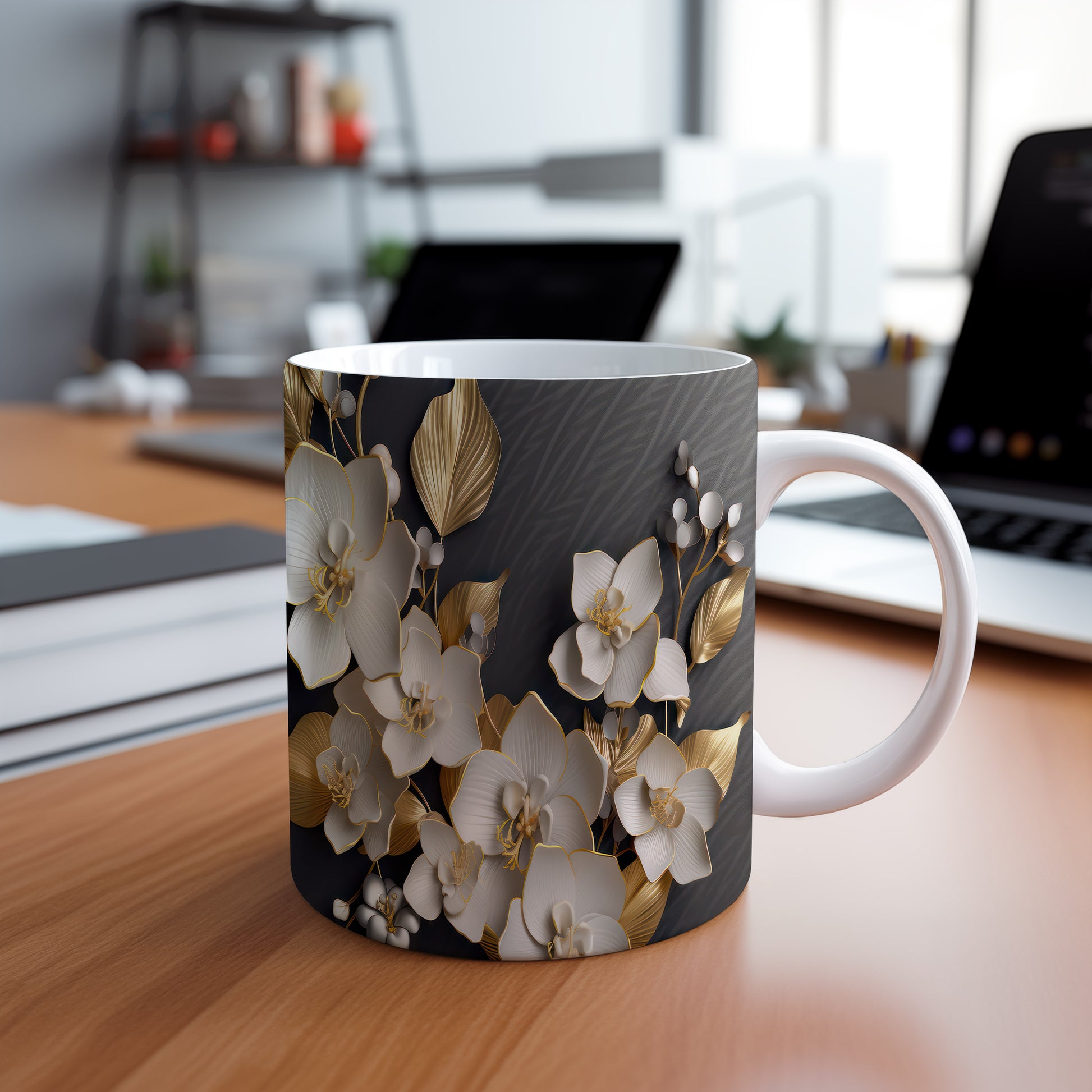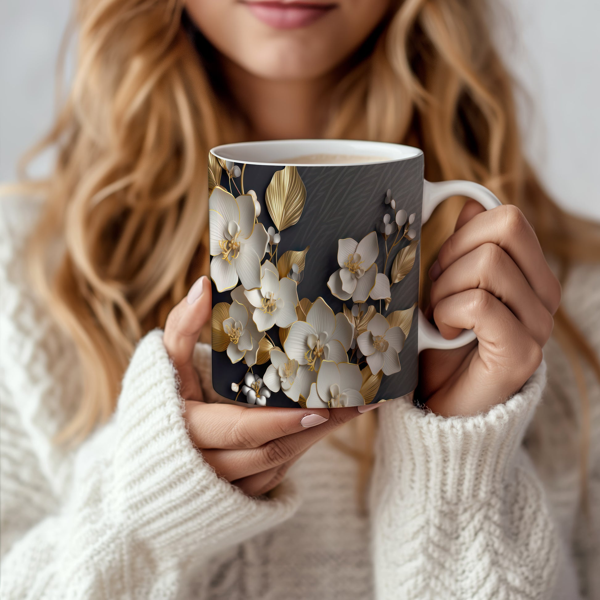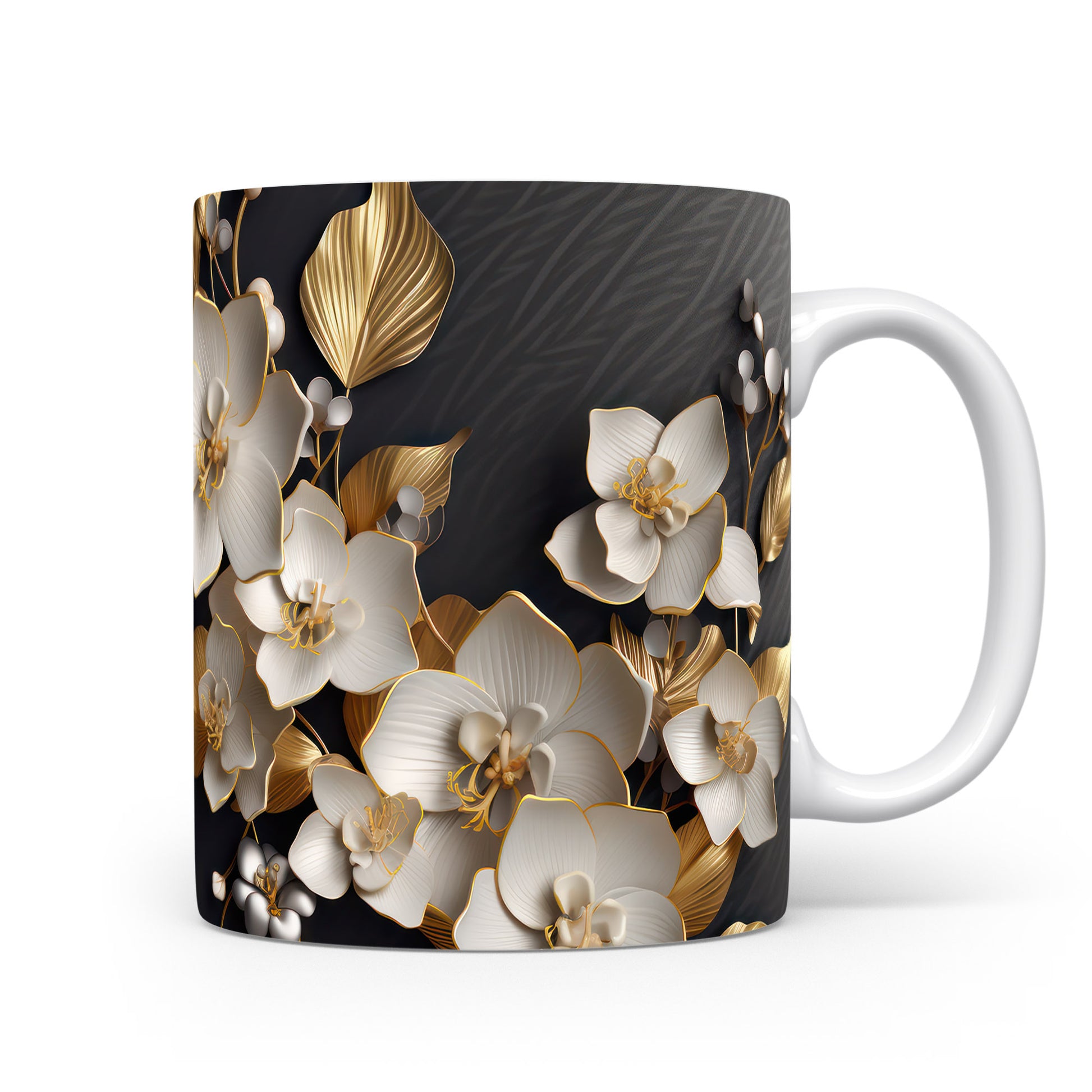 Tento hrnek s květinovým designem přináší jemnost bílých orchidejí a zlaté detaily na tmavém pozadí. Je ideální pro milovníky květin a skvělým dárkem pro ženy. Materiál: keramika. Objem: 330 ml. Vhodné do myčky i mikrovlnky. Díky kvalitnímu zpracování si hrnek zachovává svůj vzhled i po častém používání.
