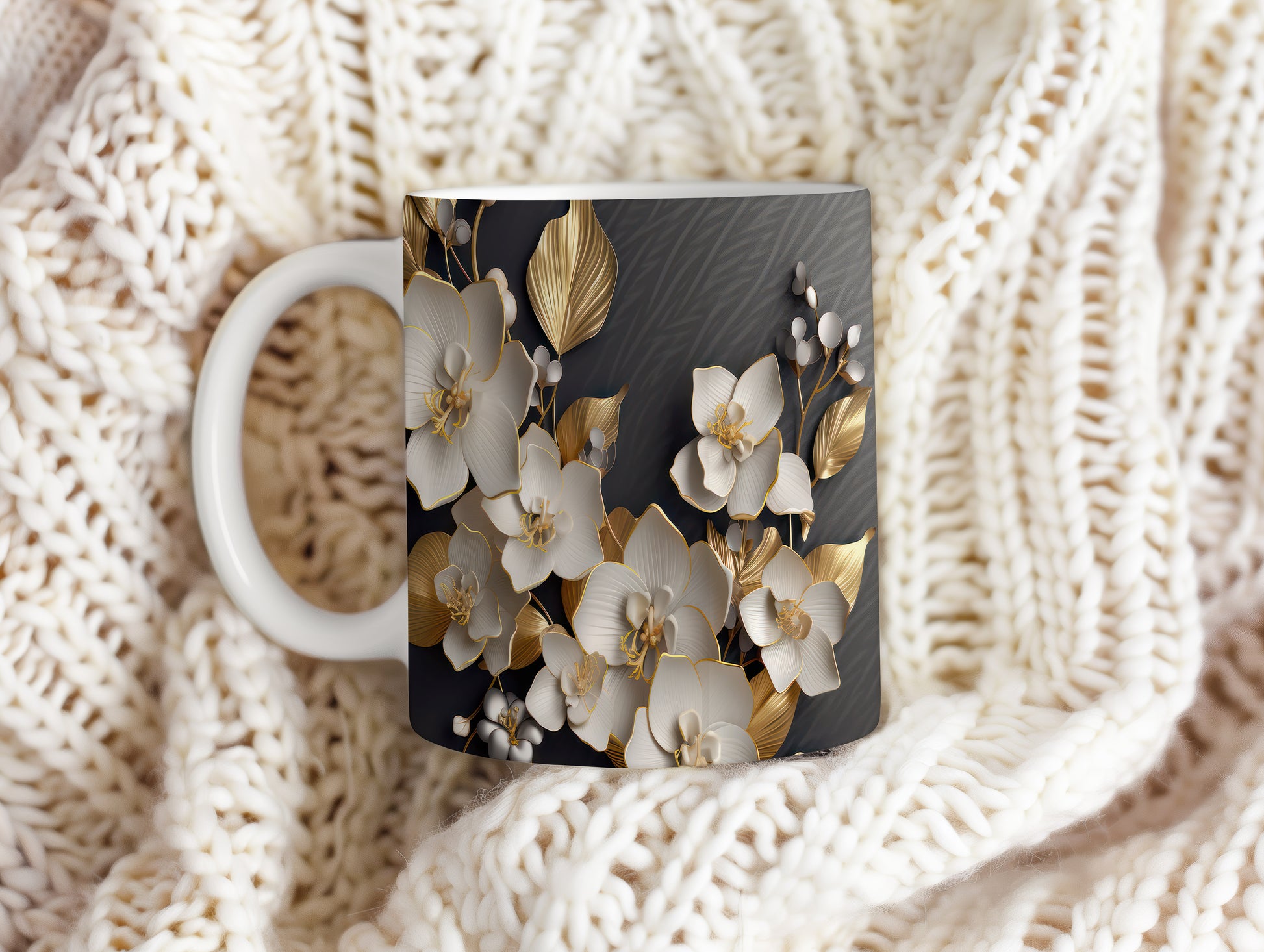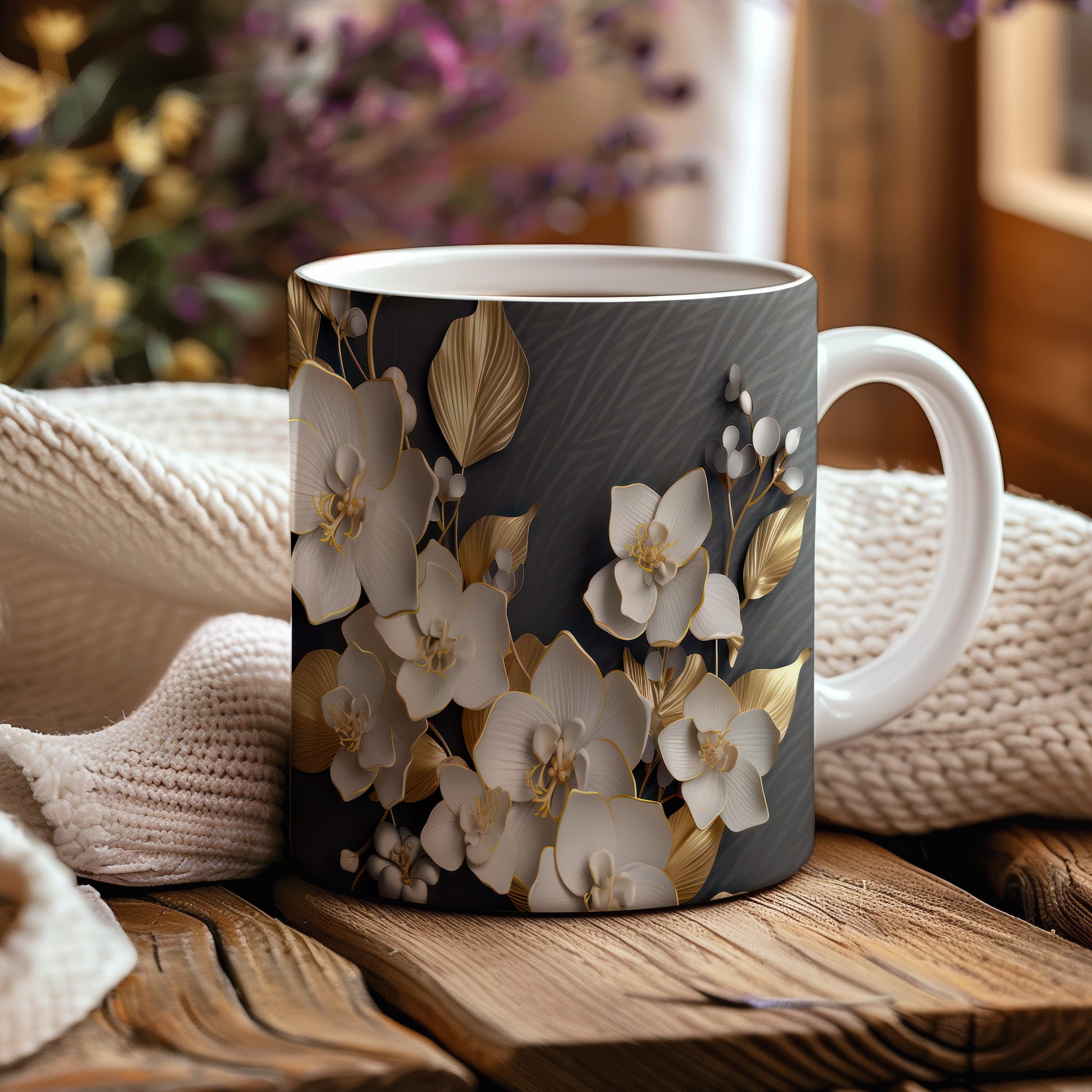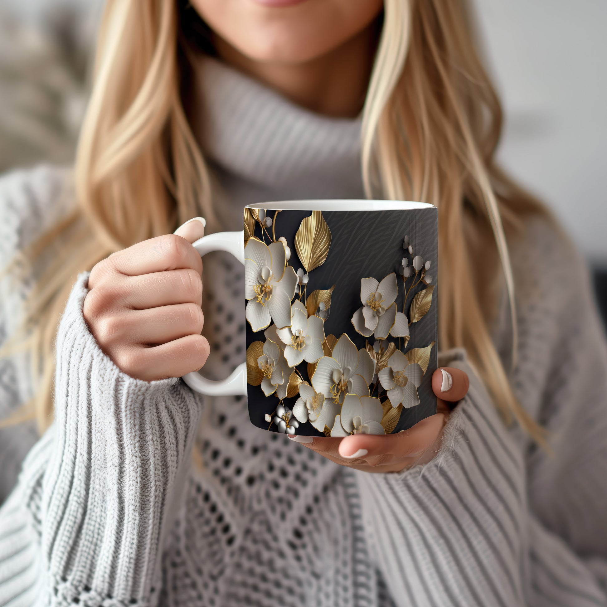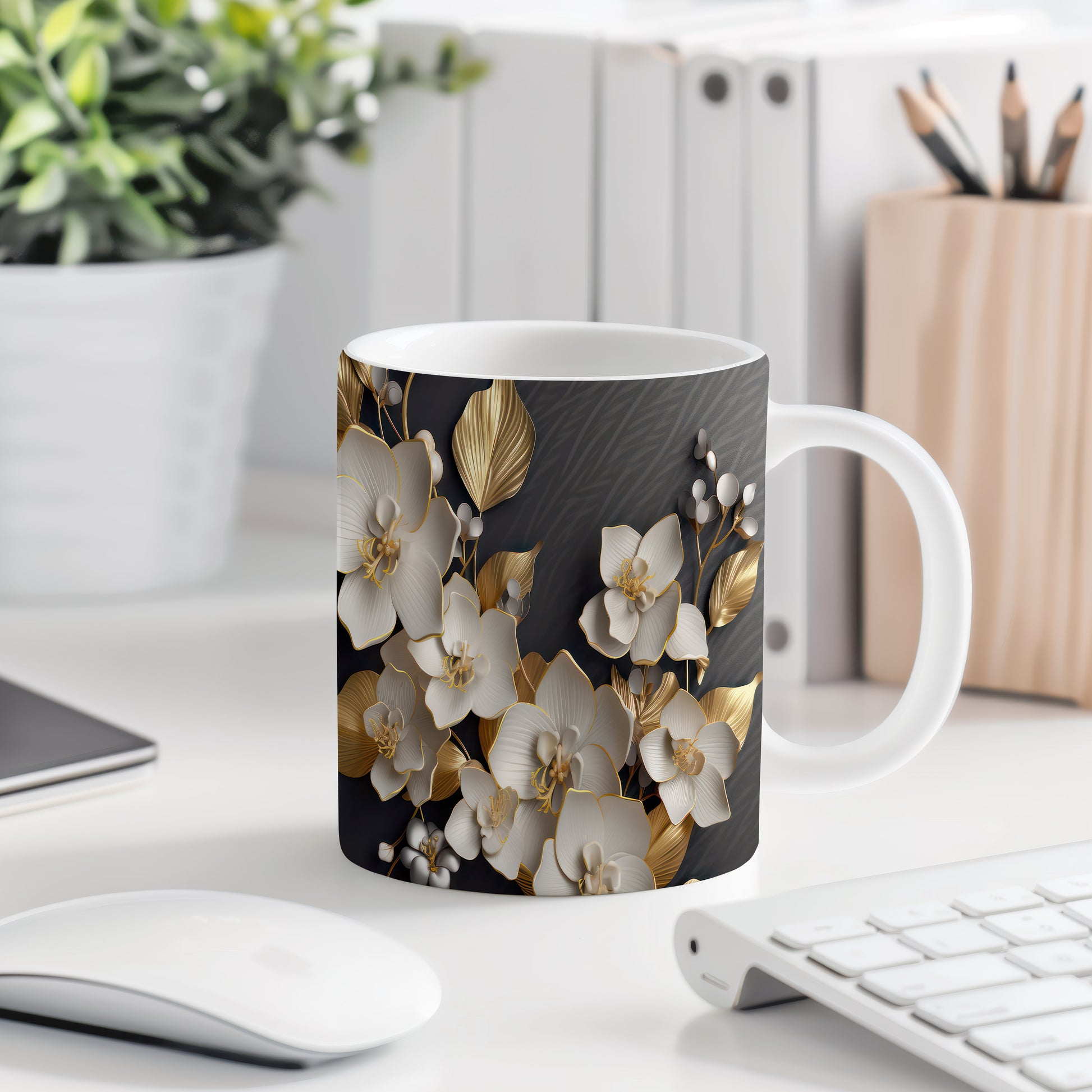 Tento hrnek s květinovým designem přináší jemnost bílých orchidejí a zlaté detaily na tmavém pozadí. Je ideální pro milovníky květin a skvělým dárkem pro ženy. Materiál: keramika. Objem: 330 ml. Vhodné do myčky i mikrovlnky. Díky kvalitnímu zpracování si hrnek zachovává svůj vzhled i po častém používání.