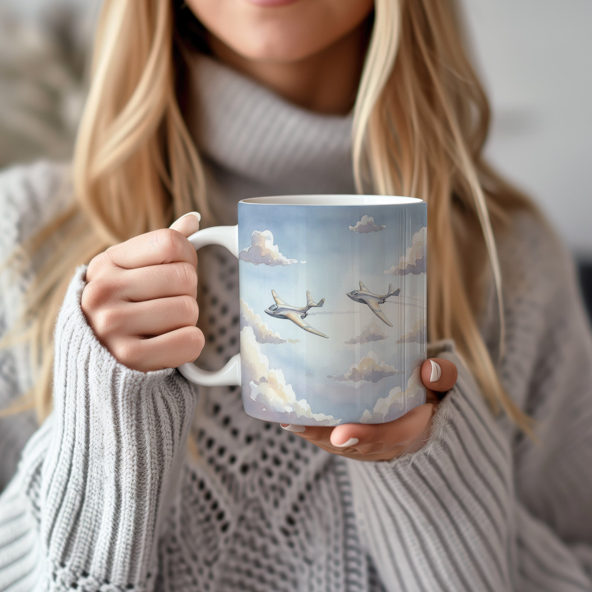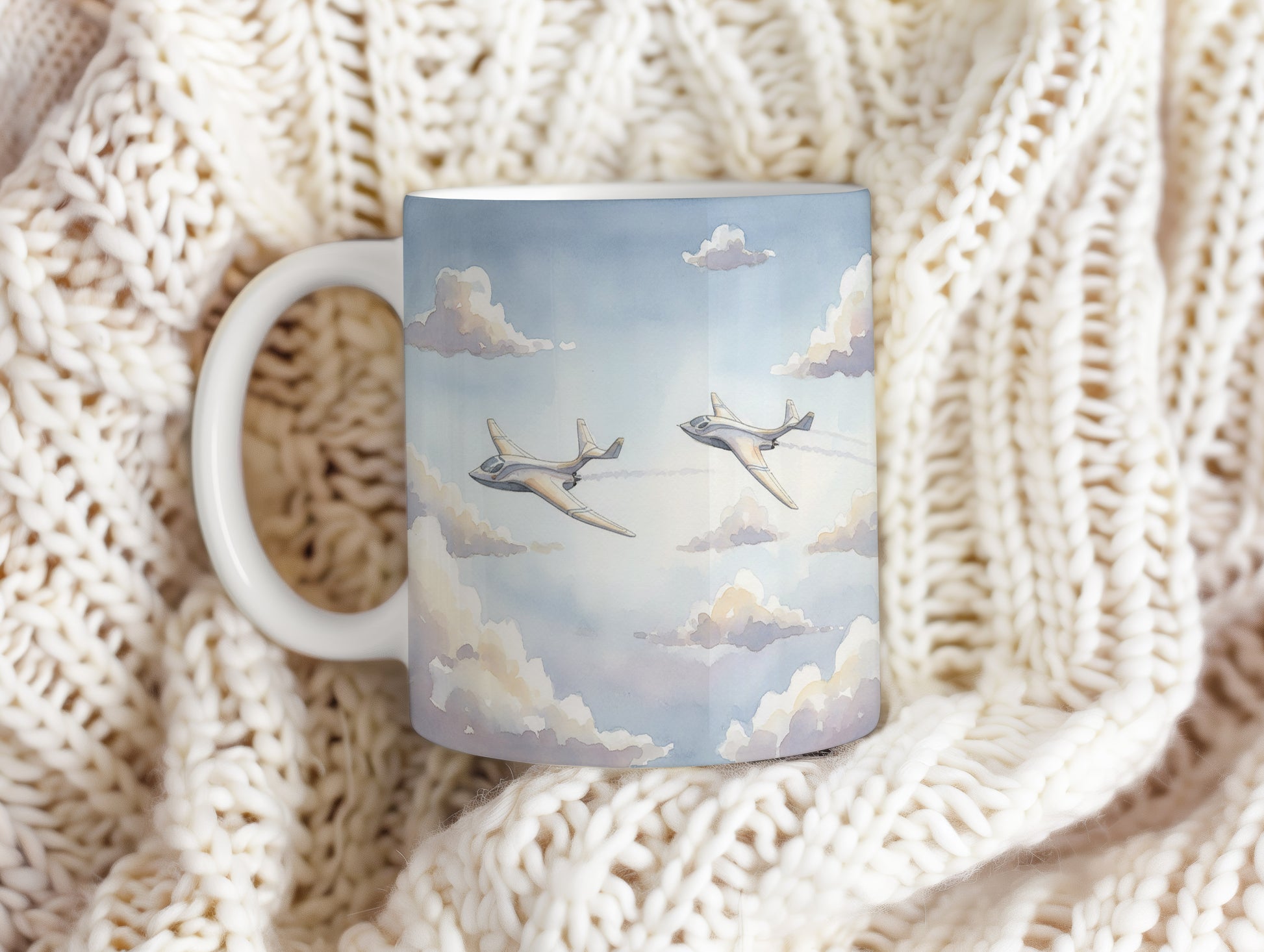 Hrnek s elegantními letadly v oblacích