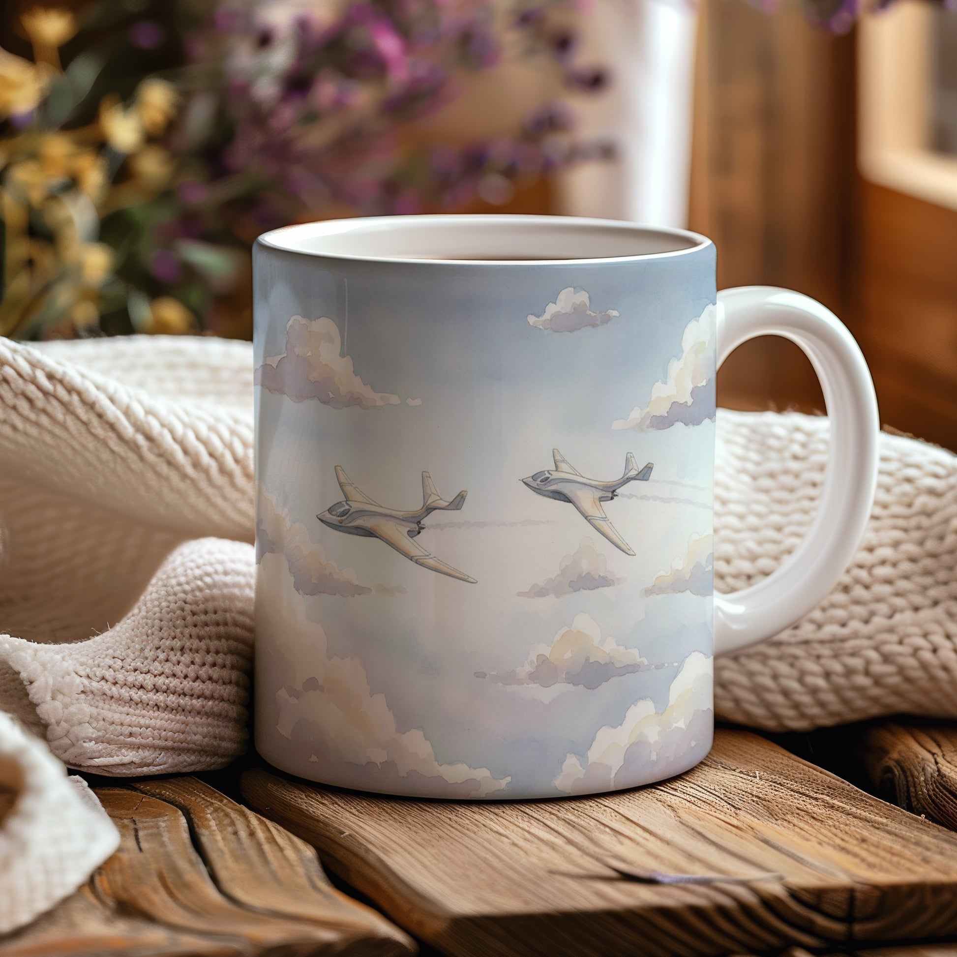 Užijte si pohled na dvě elegantní letadla prolétající oblohou plnou nadýchaných mraků. Akvarelový motiv zachycuje klid a volnost letu. Hrnek 330 ml – vhodný do myčky i mikrovlnky.