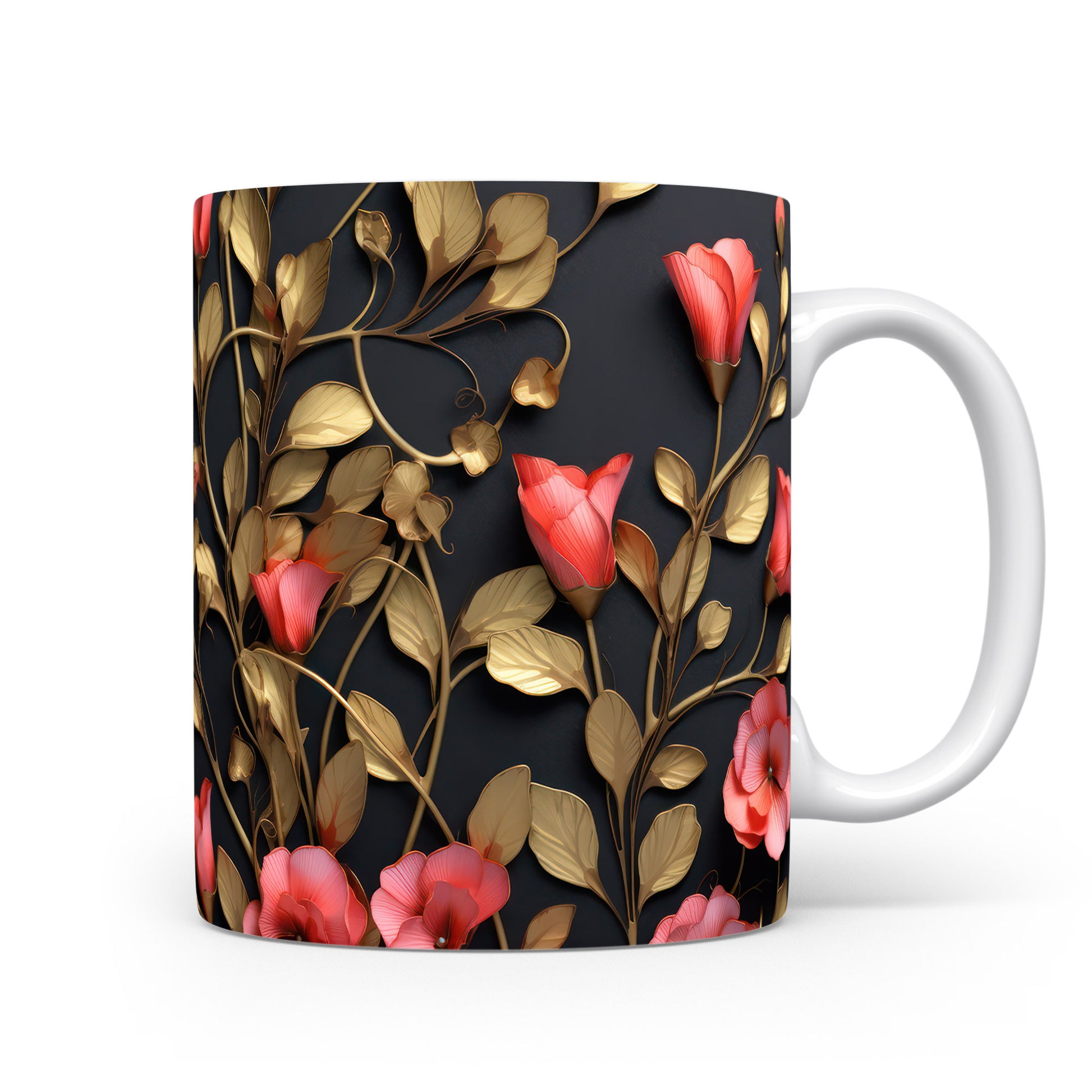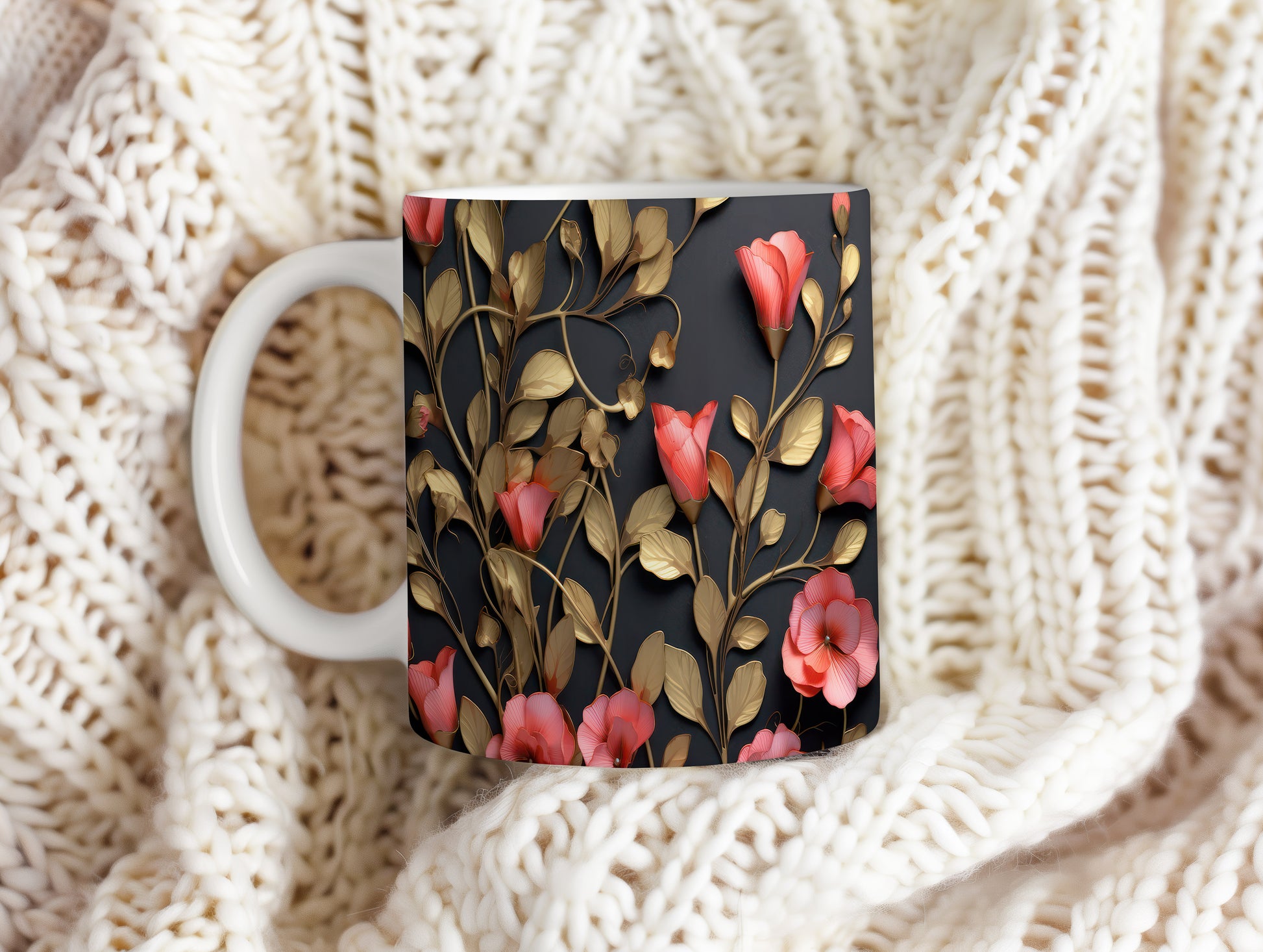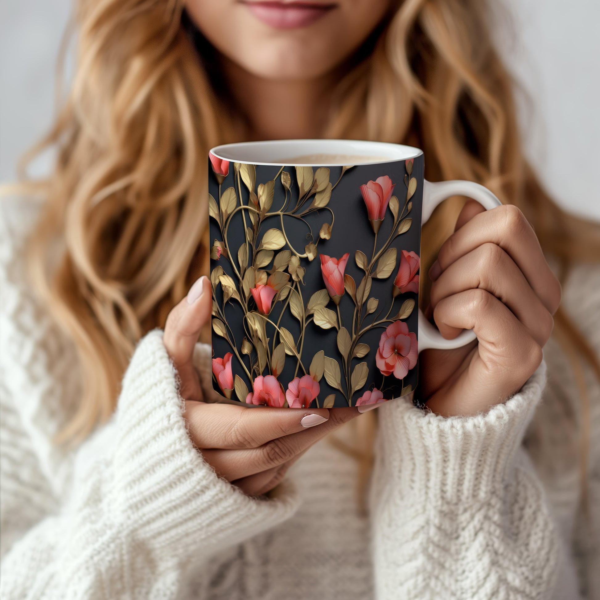 Hrnek s elegantními růžovými květy a zlatými detaily