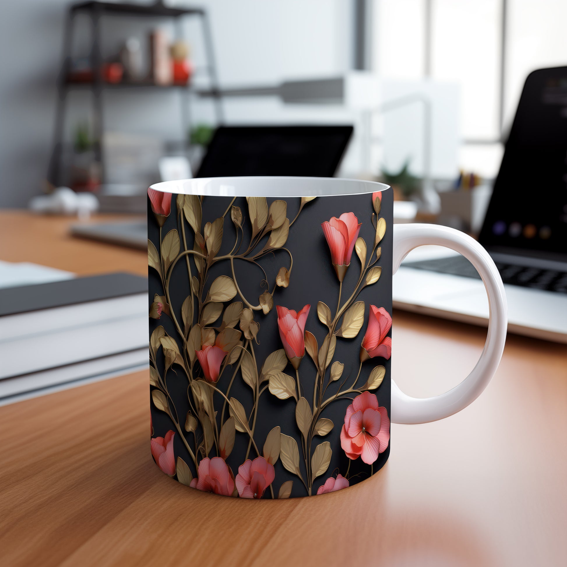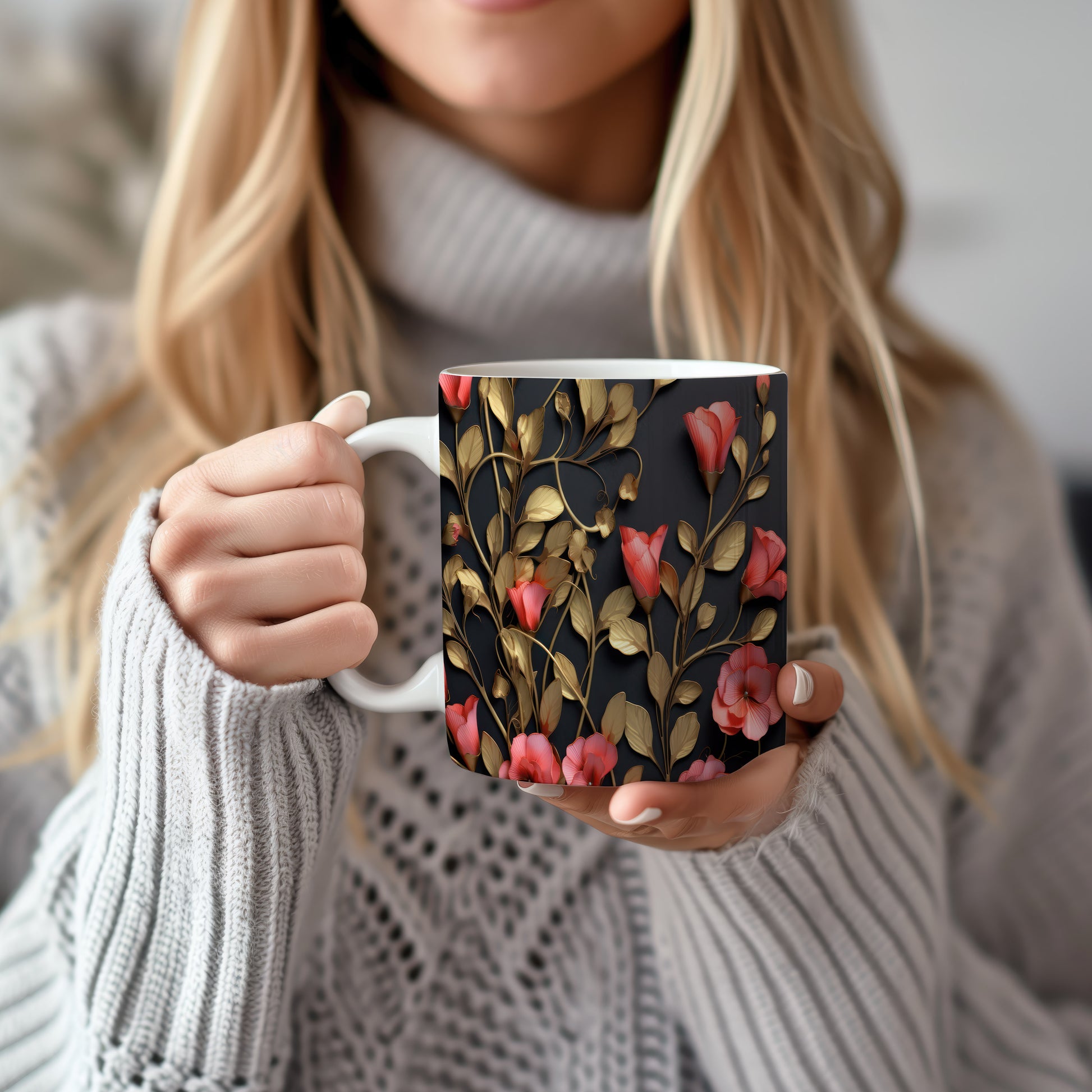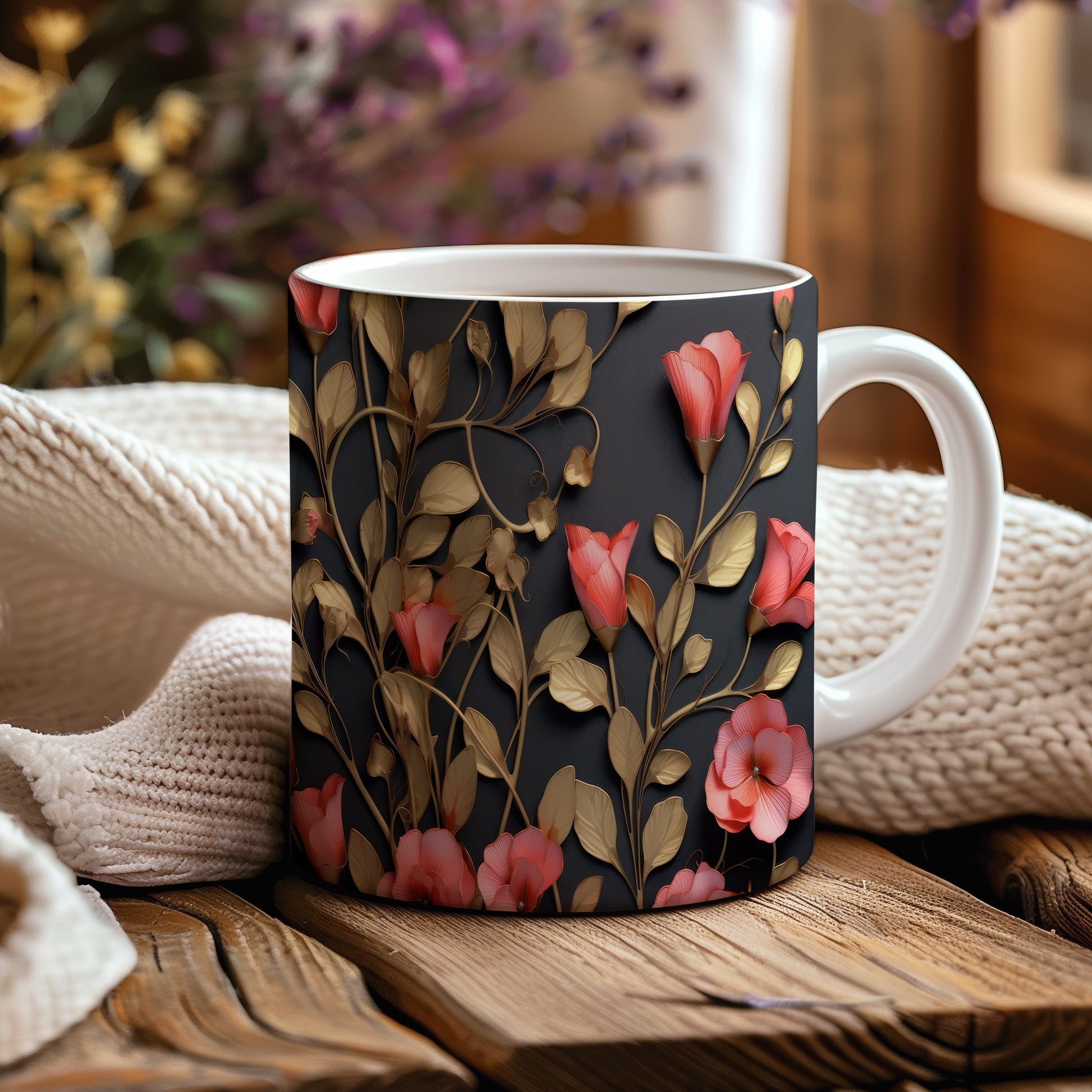 Hrnek s elegantními růžovými květy a zlatými detaily