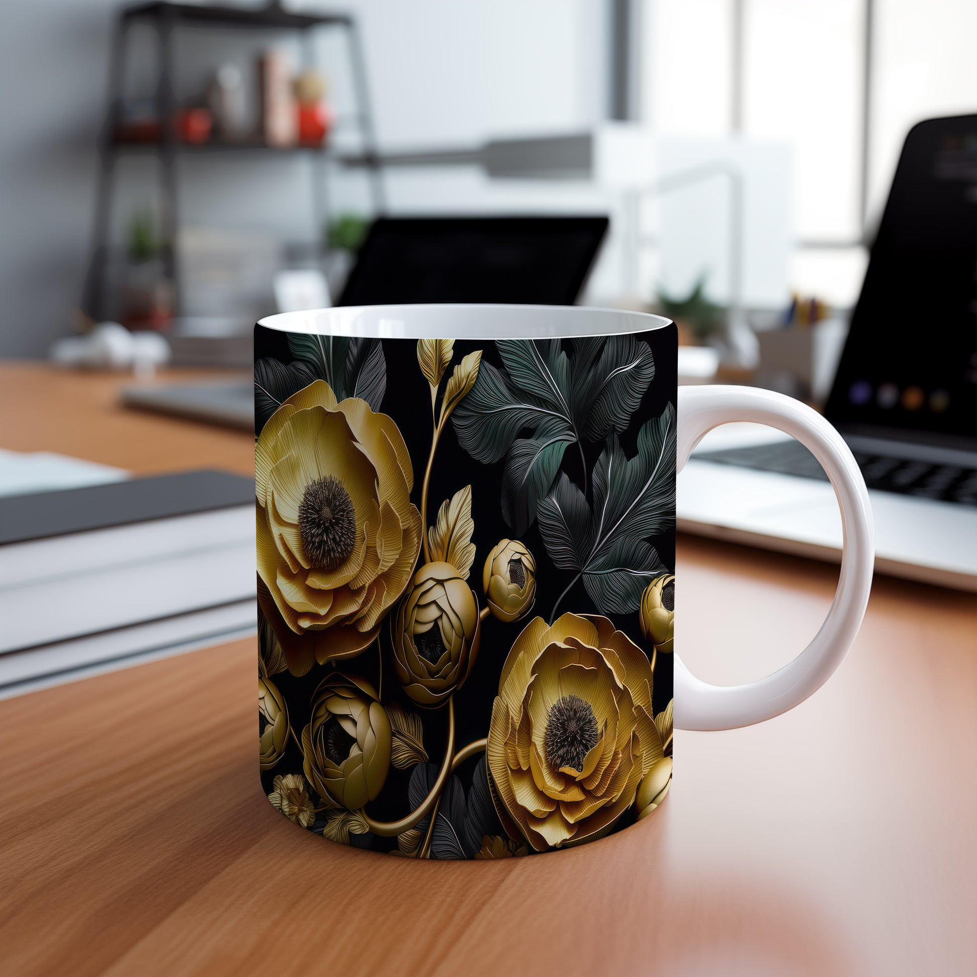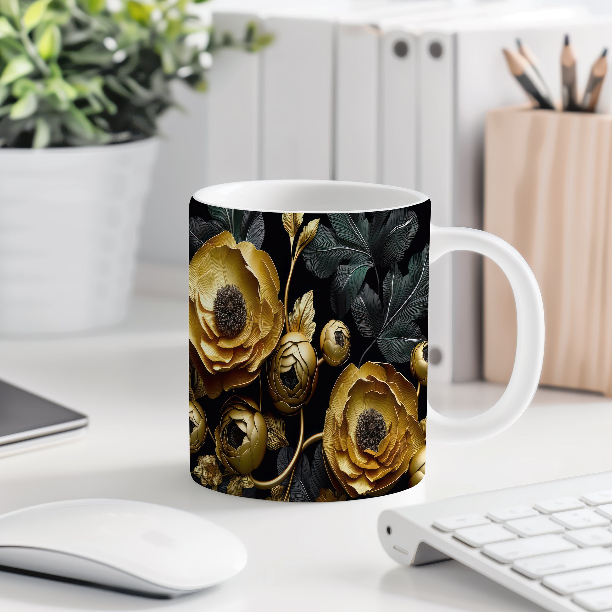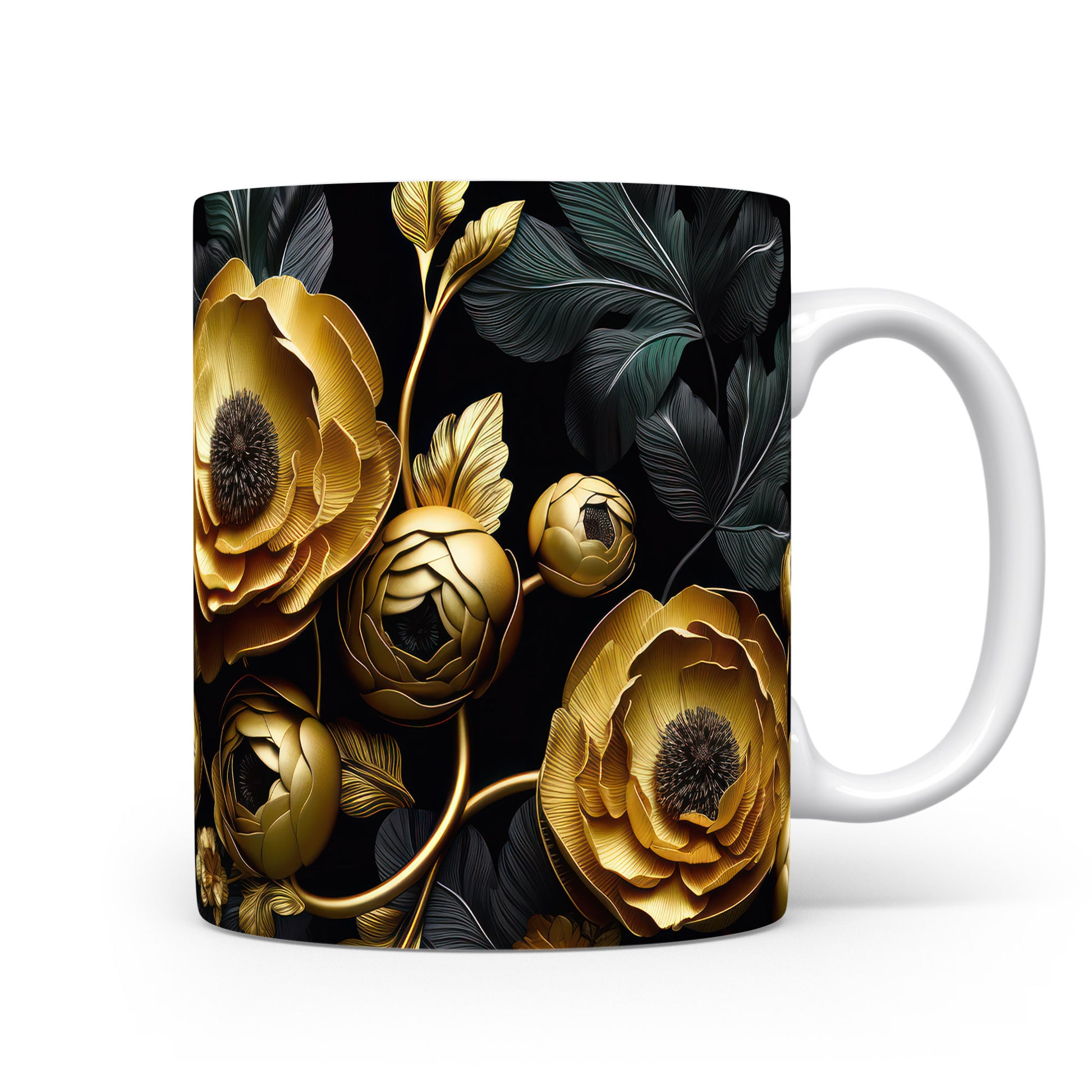 Tento hrnek s motivem elegantních zlatých květin na černém pozadí přináší stylový dojem do každého interiéru. Je ideální pro milovníky designu a skvělým dárkem pro přátele či rodinu. Materiál: keramika. Objem: 330 ml. Vhodné do myčky i mikrovlnky. Používání tohoto hrnku dodá vašemu pití nádech luxusu.
