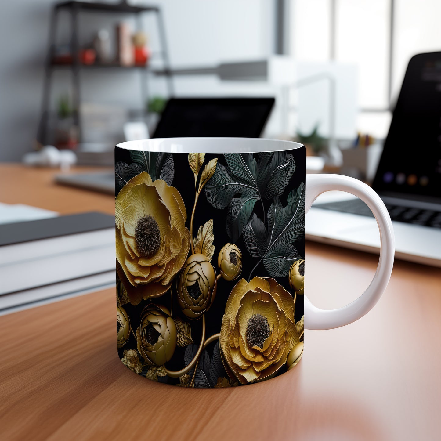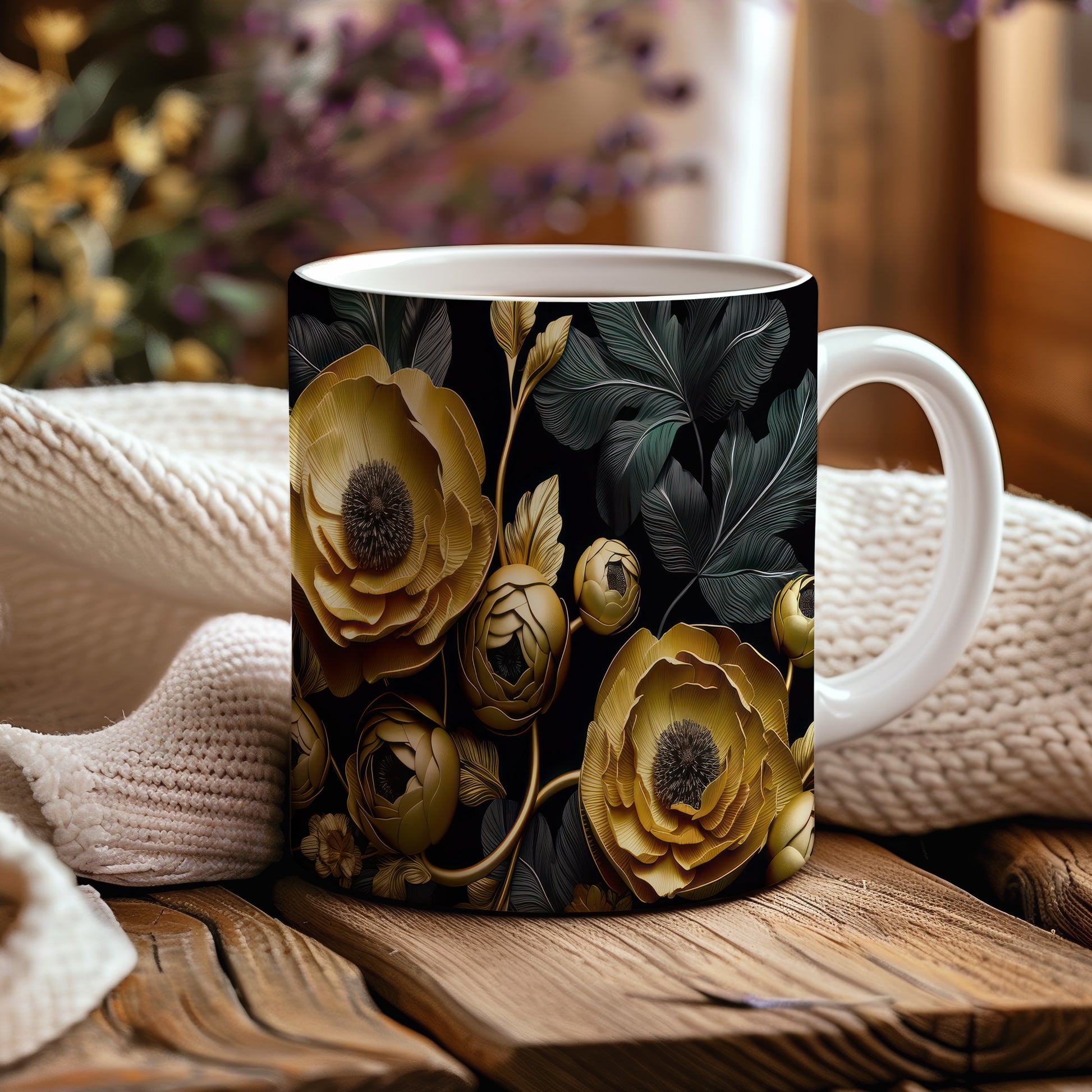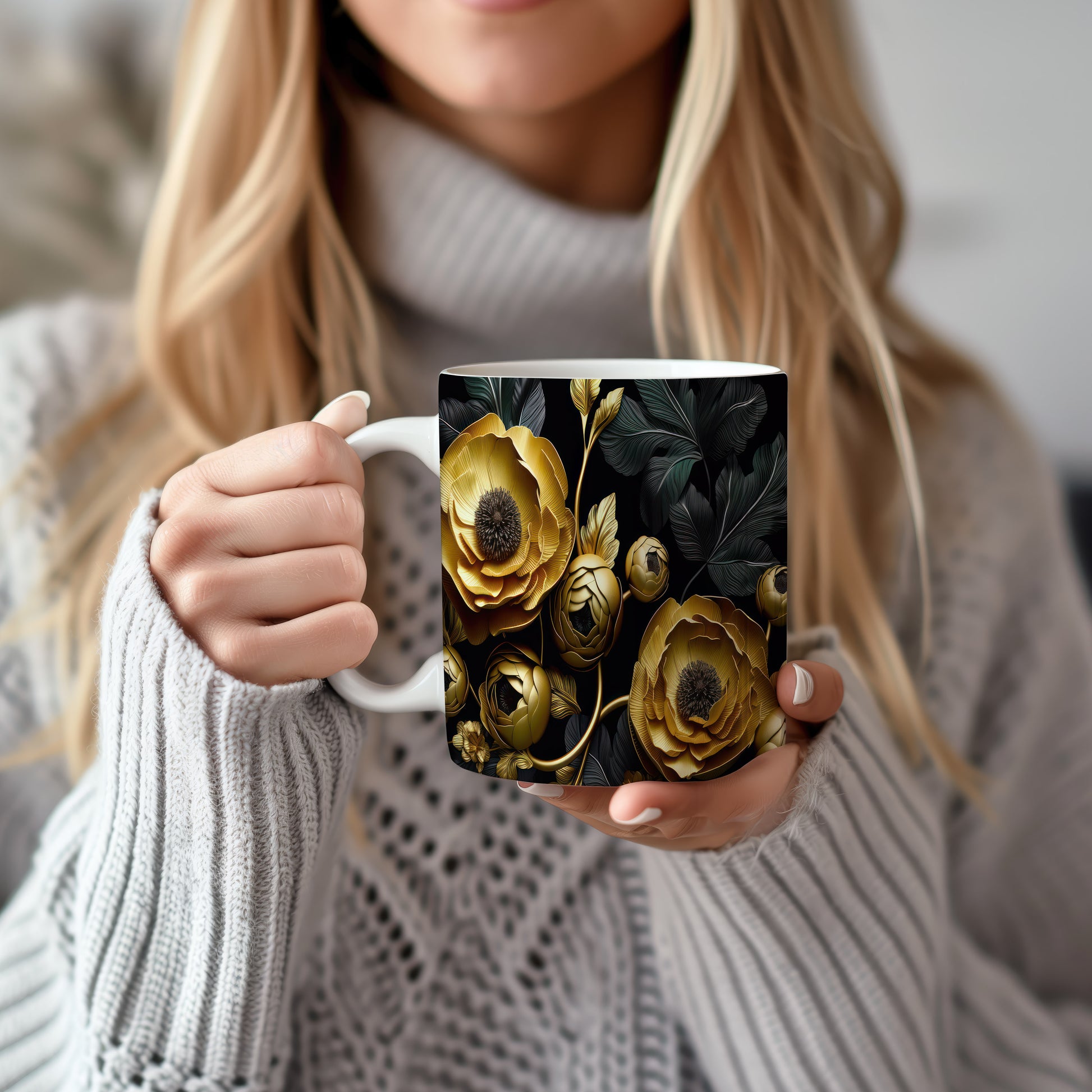 Tento hrnek s motivem elegantních zlatých květin na černém pozadí přináší stylový dojem do každého interiéru. Je ideální pro milovníky designu a skvělým dárkem pro přátele či rodinu. Materiál: keramika. Objem: 330 ml. Vhodné do myčky i mikrovlnky. Používání tohoto hrnku dodá vašemu pití nádech luxusu.