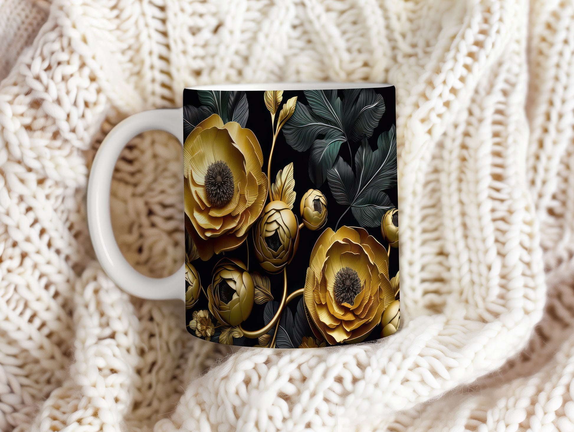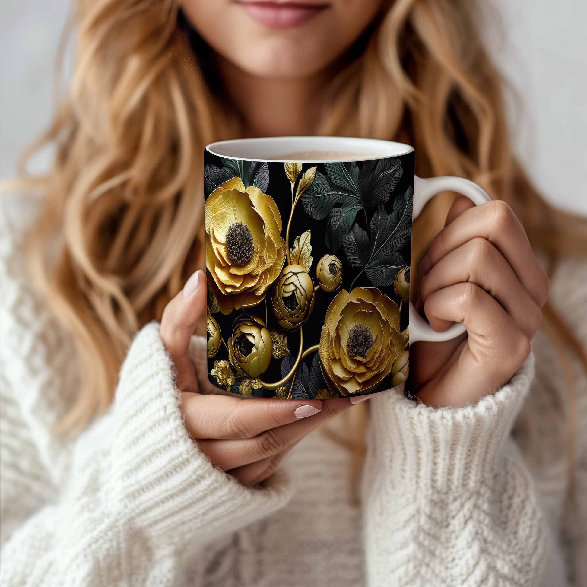 Hrnek s elegantními zlatými květy – malířským vzhledem