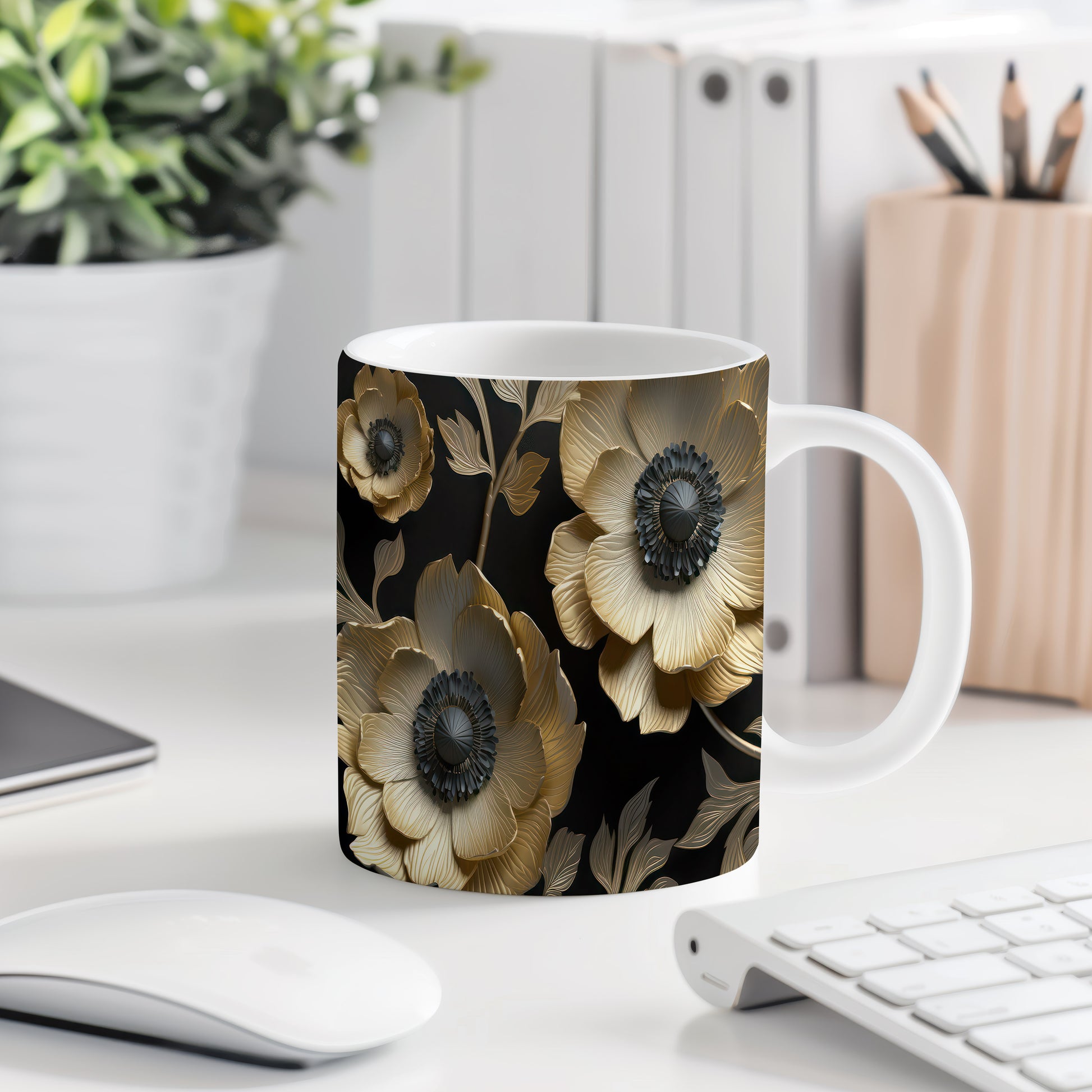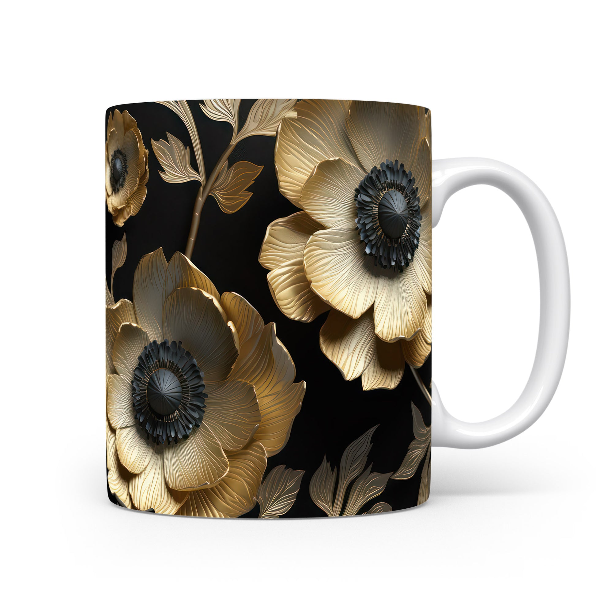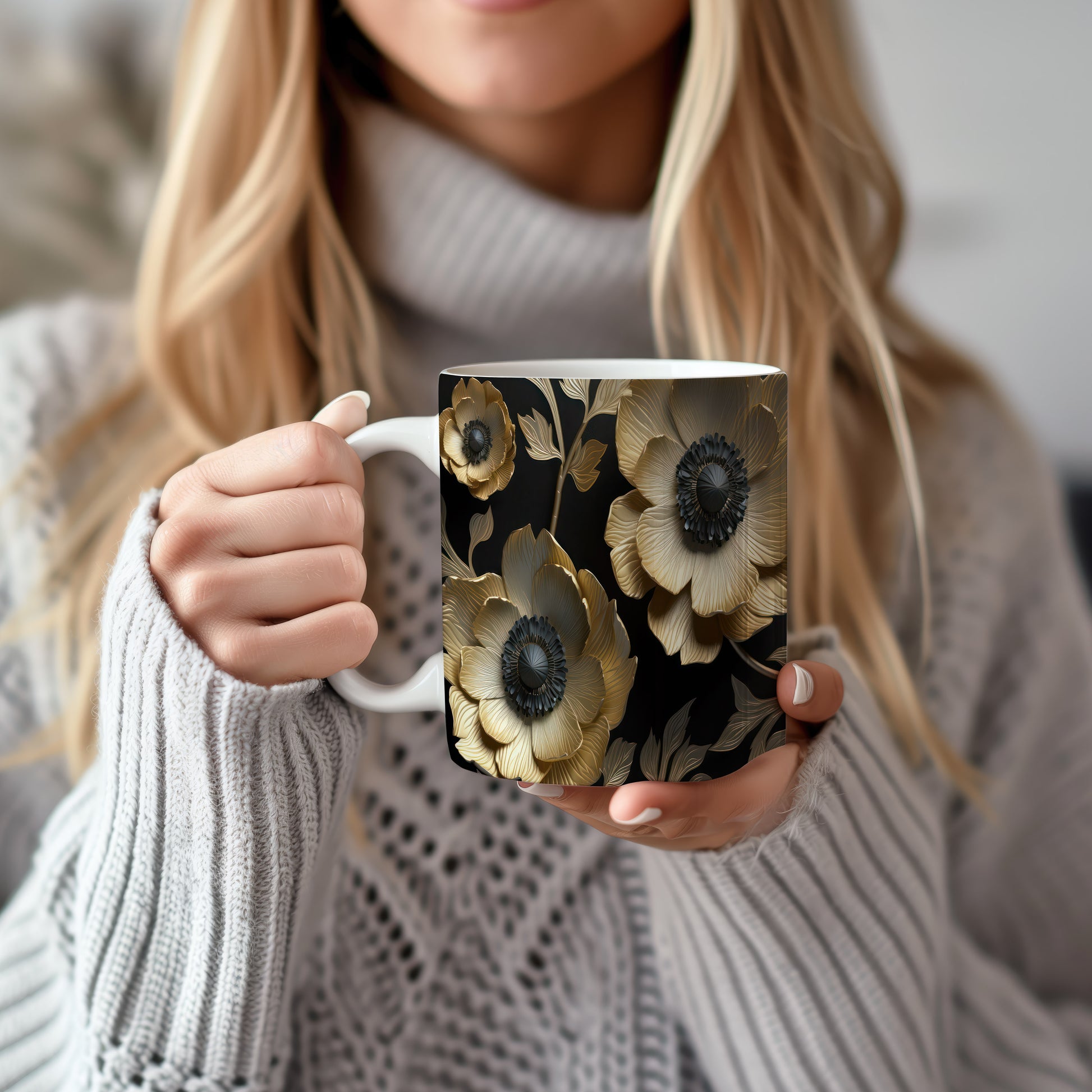 Tento hrnek s elegantními zlatými květy na černém pozadí je stylovým doplňkem pro každého milovníka krásného designu. Skvěle se hodí jako dárek pro přátele nebo rodinu, kteří ocení umělecké kousky. Materiál: keramika. Objem: 330 ml. Vhodné do myčky i mikrovlnky. Díky svému jedinečnému vzhledu přinese do vašeho každodenního pití špetku elegance.