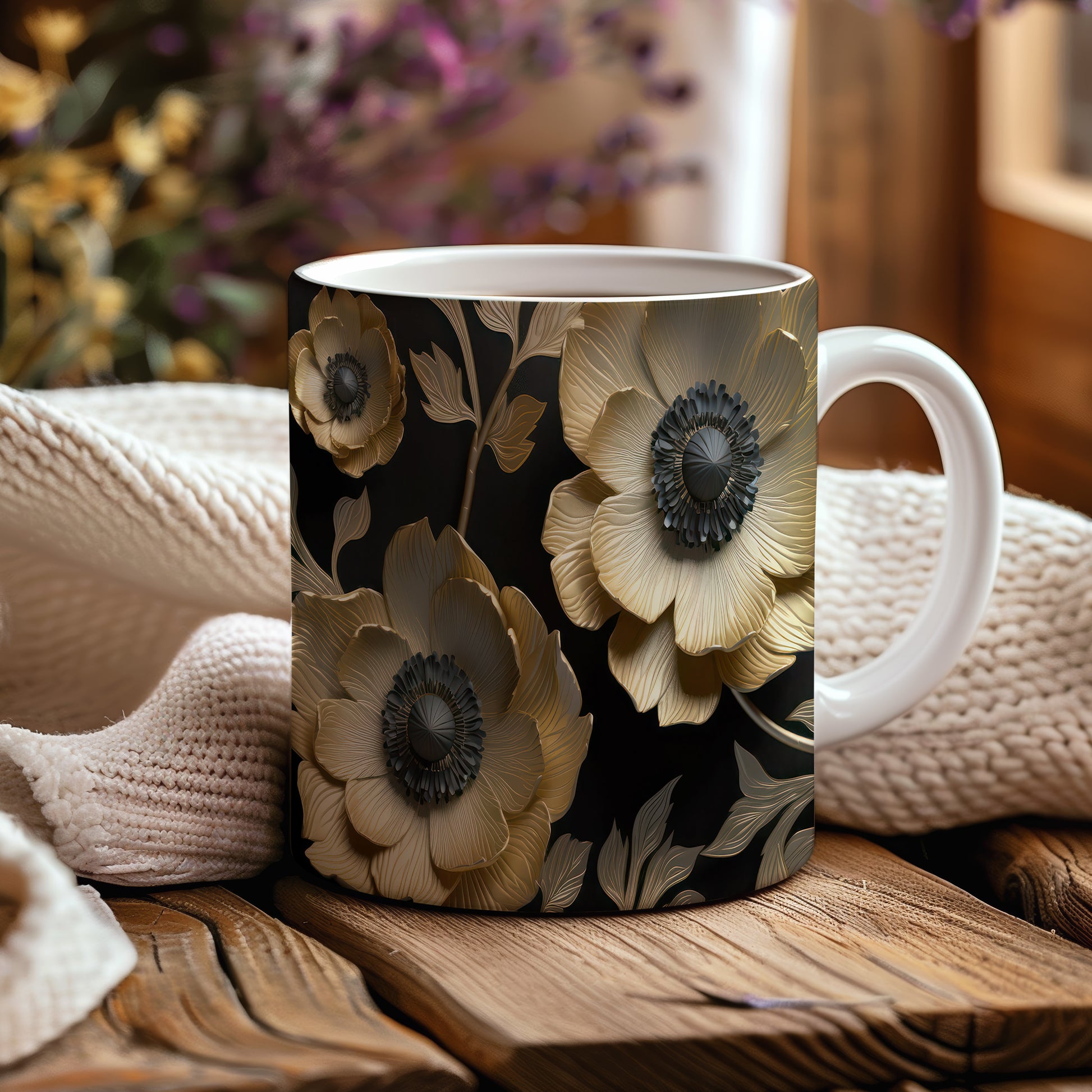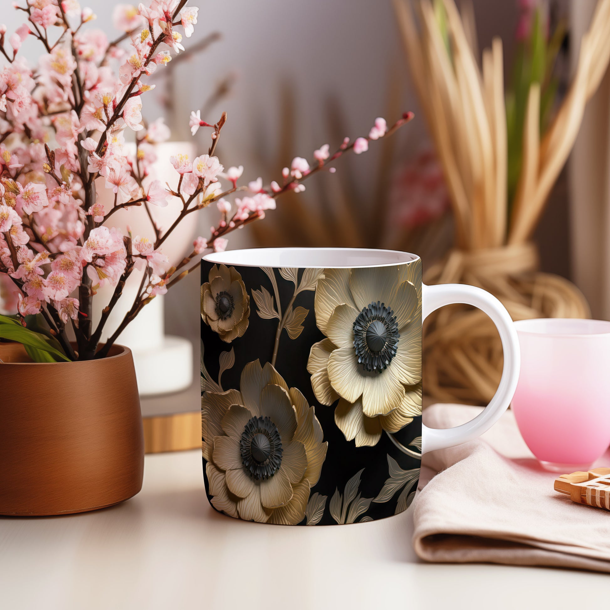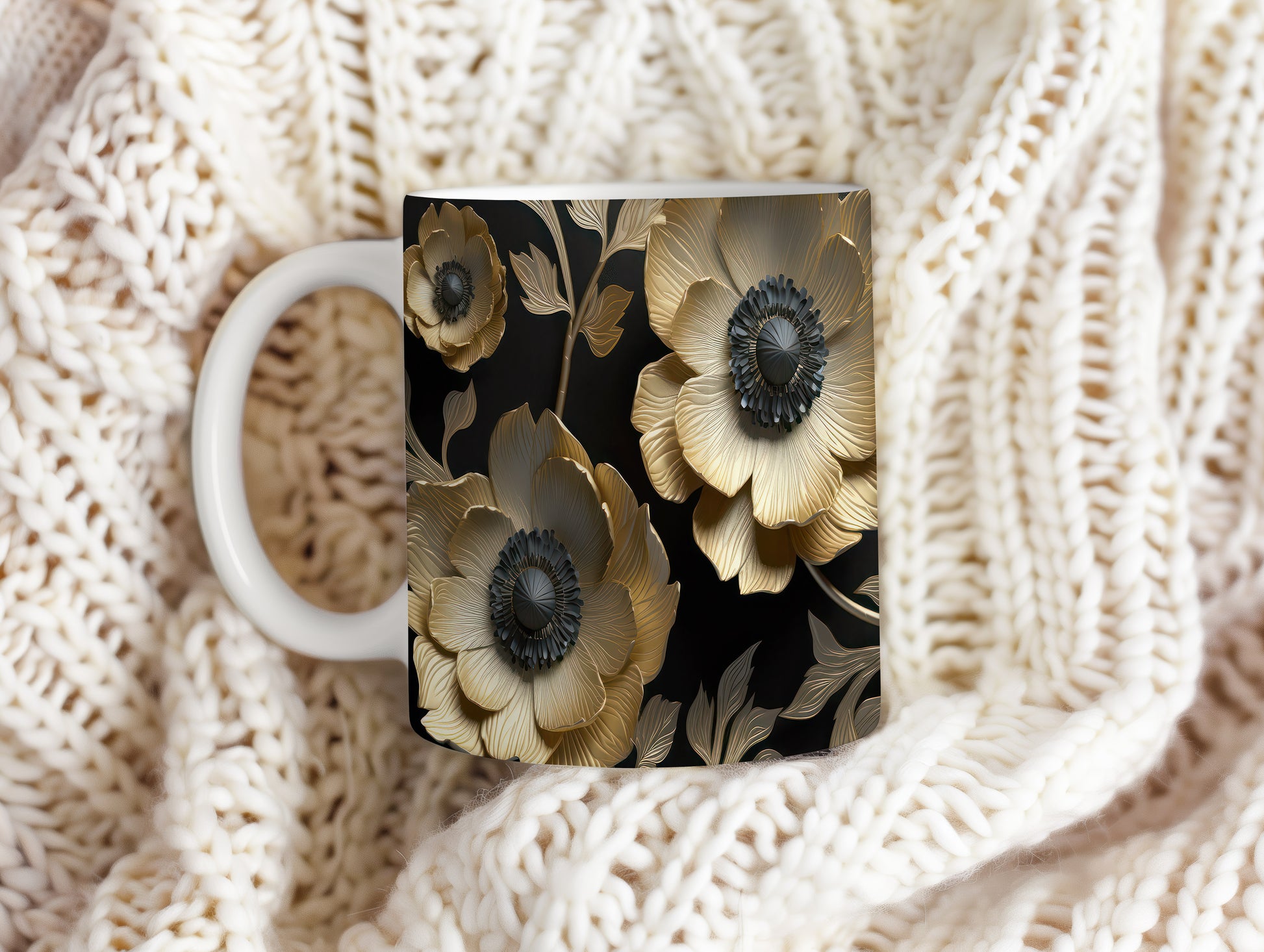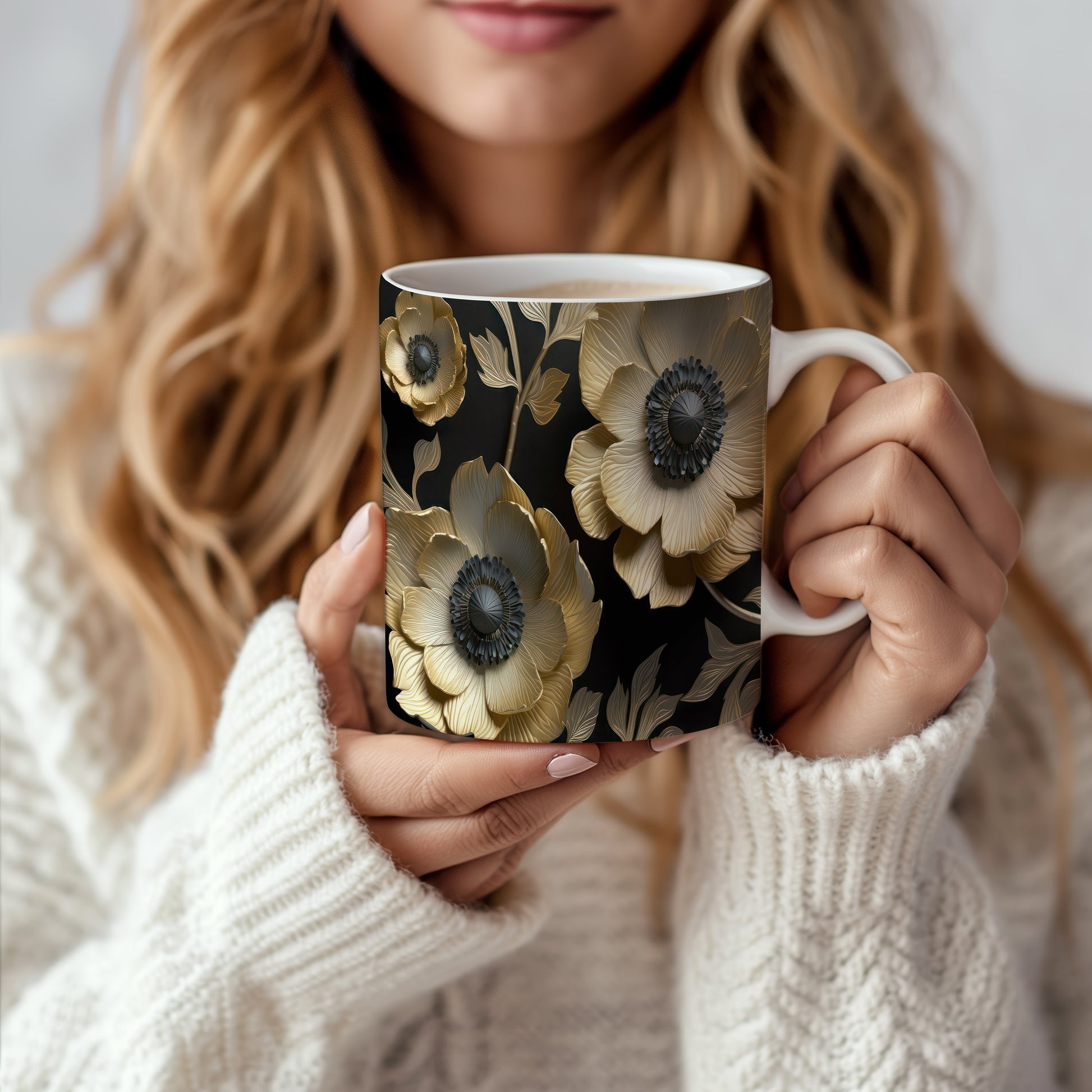Tento hrnek s elegantními zlatými květy na černém pozadí je stylovým doplňkem pro každého milovníka krásného designu. Skvěle se hodí jako dárek pro přátele nebo rodinu, kteří ocení umělecké kousky. Materiál: keramika. Objem: 330 ml. Vhodné do myčky i mikrovlnky. Díky svému jedinečnému vzhledu přinese do vašeho každodenního pití špetku elegance.