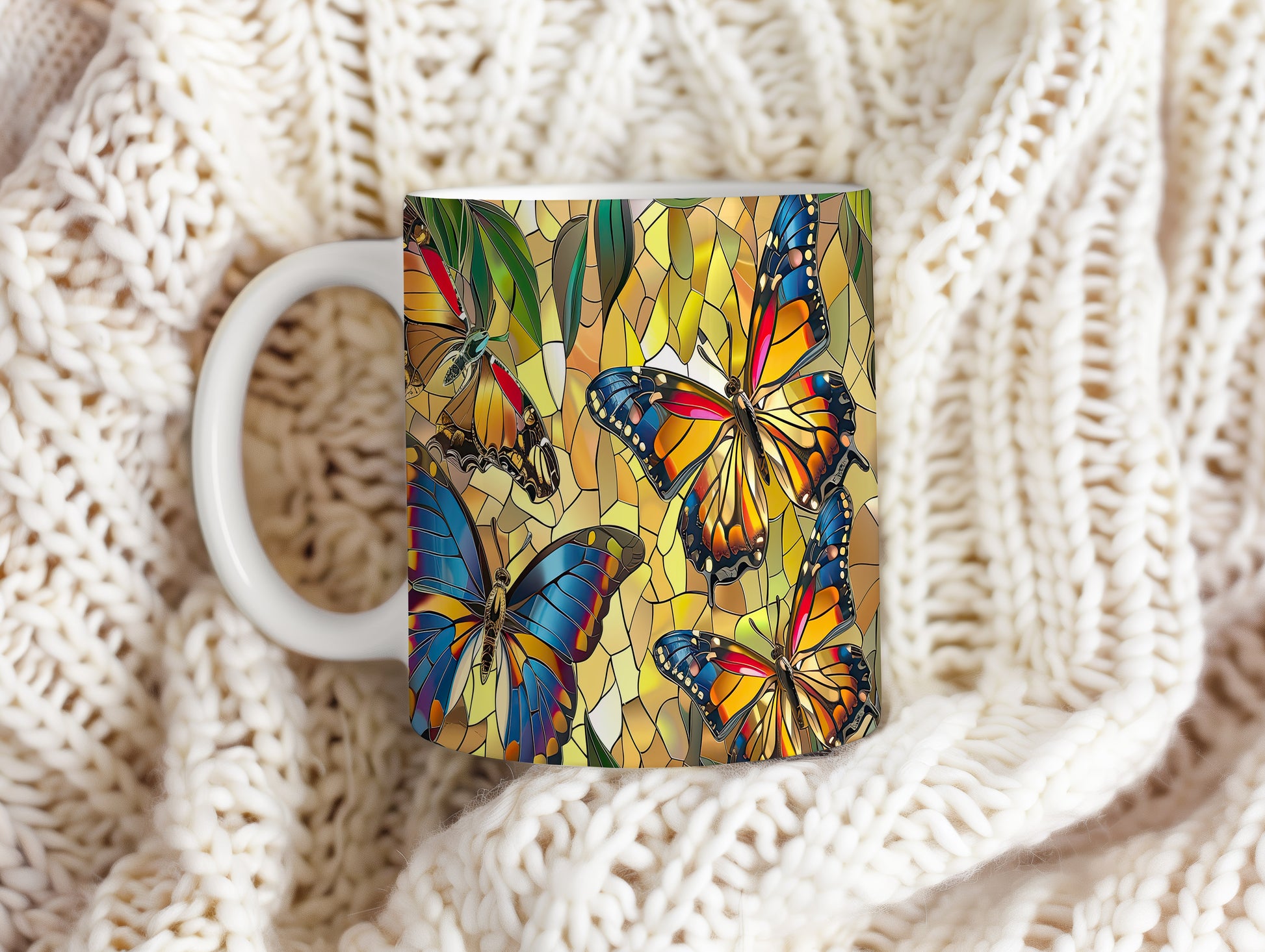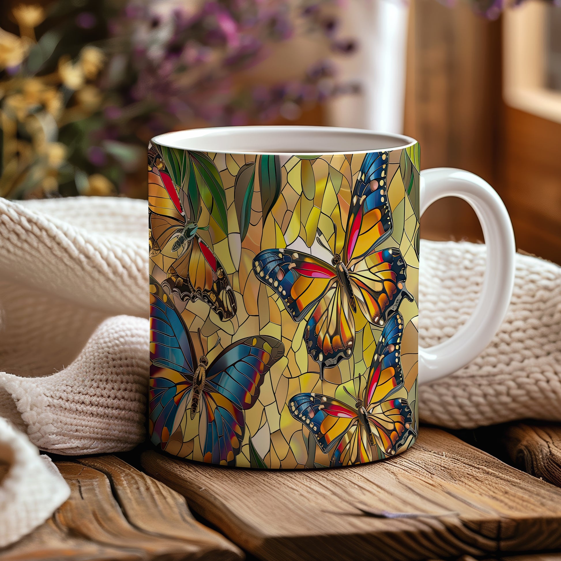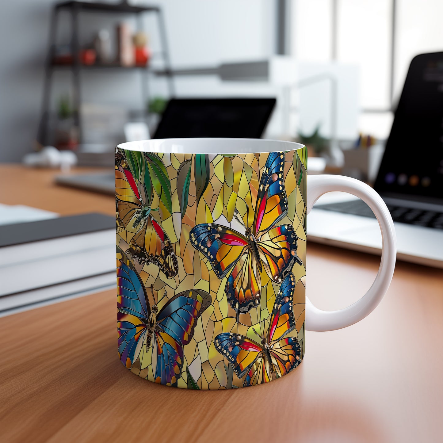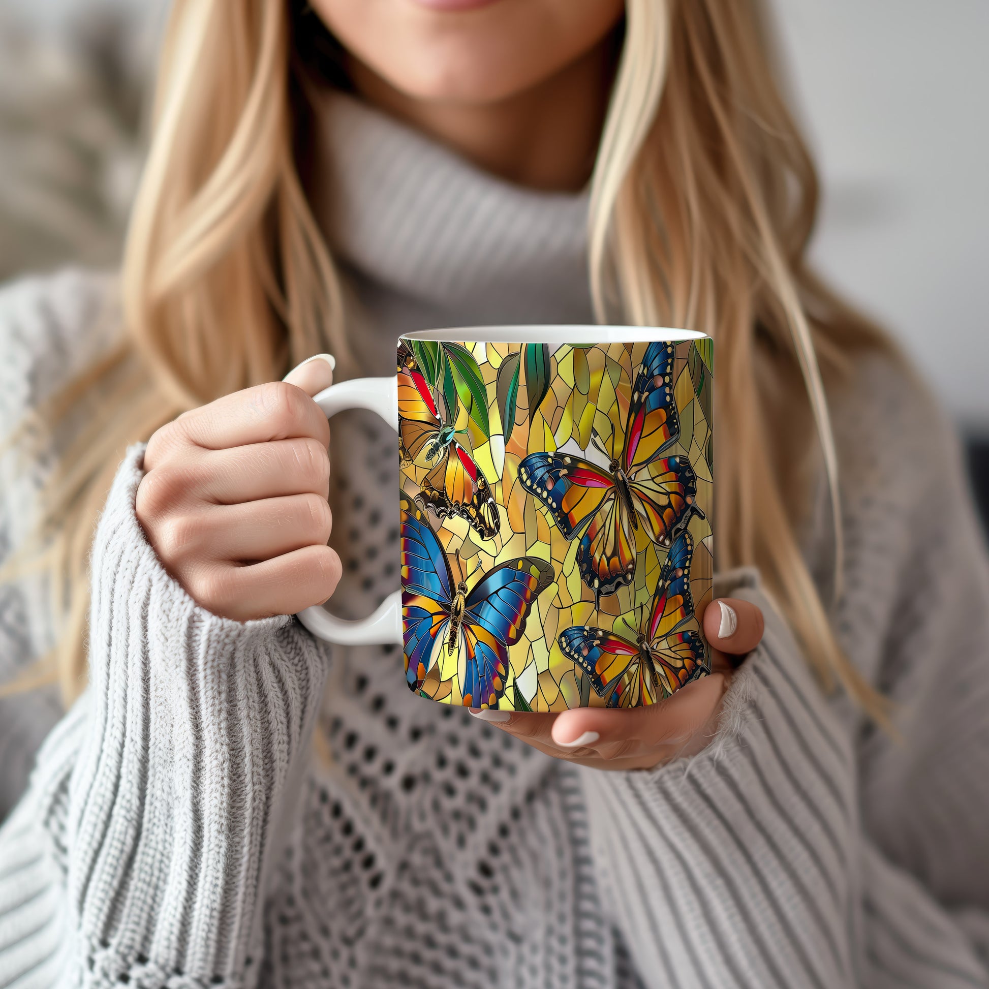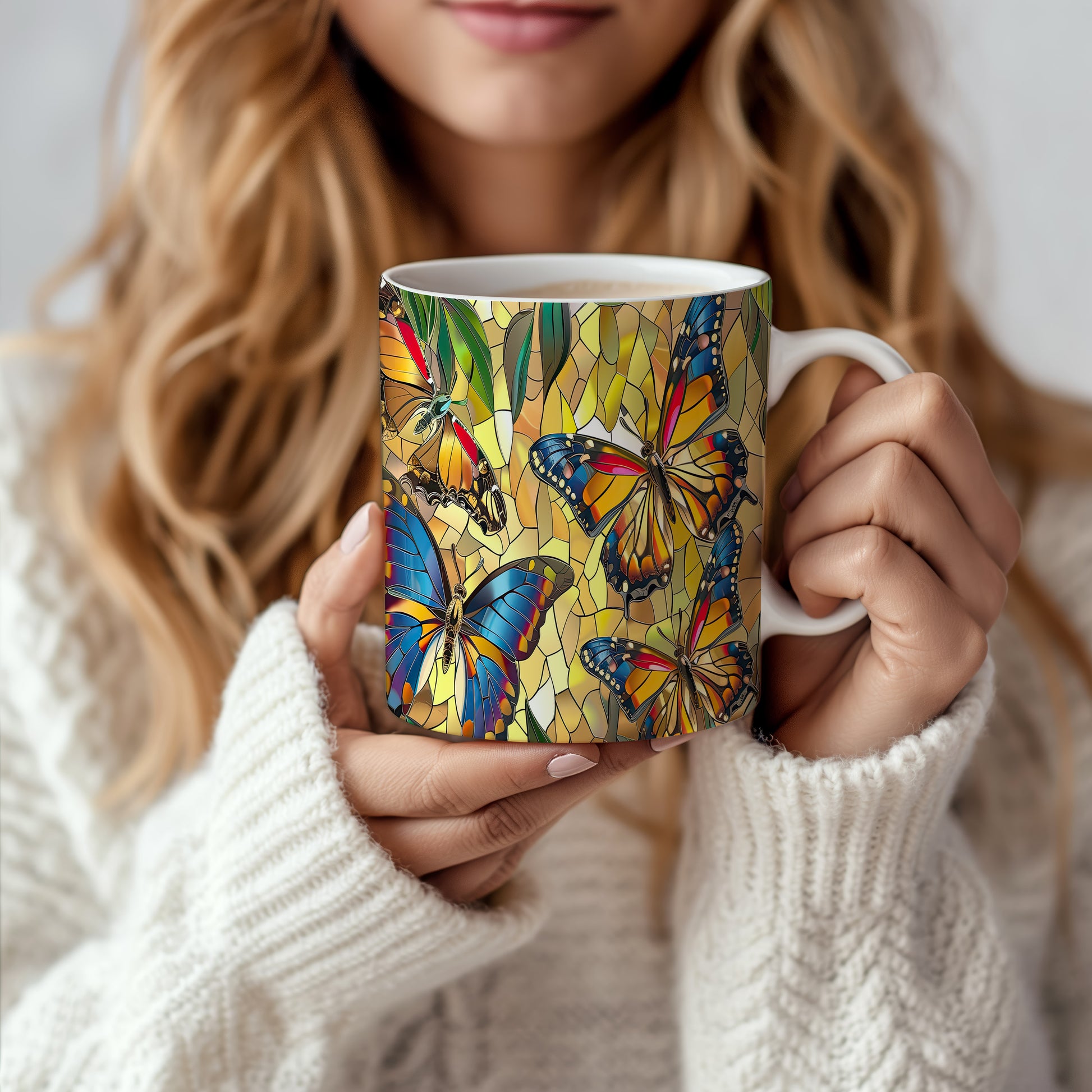 Hrnek s fascinujícími motýly na abstraktním pozadí