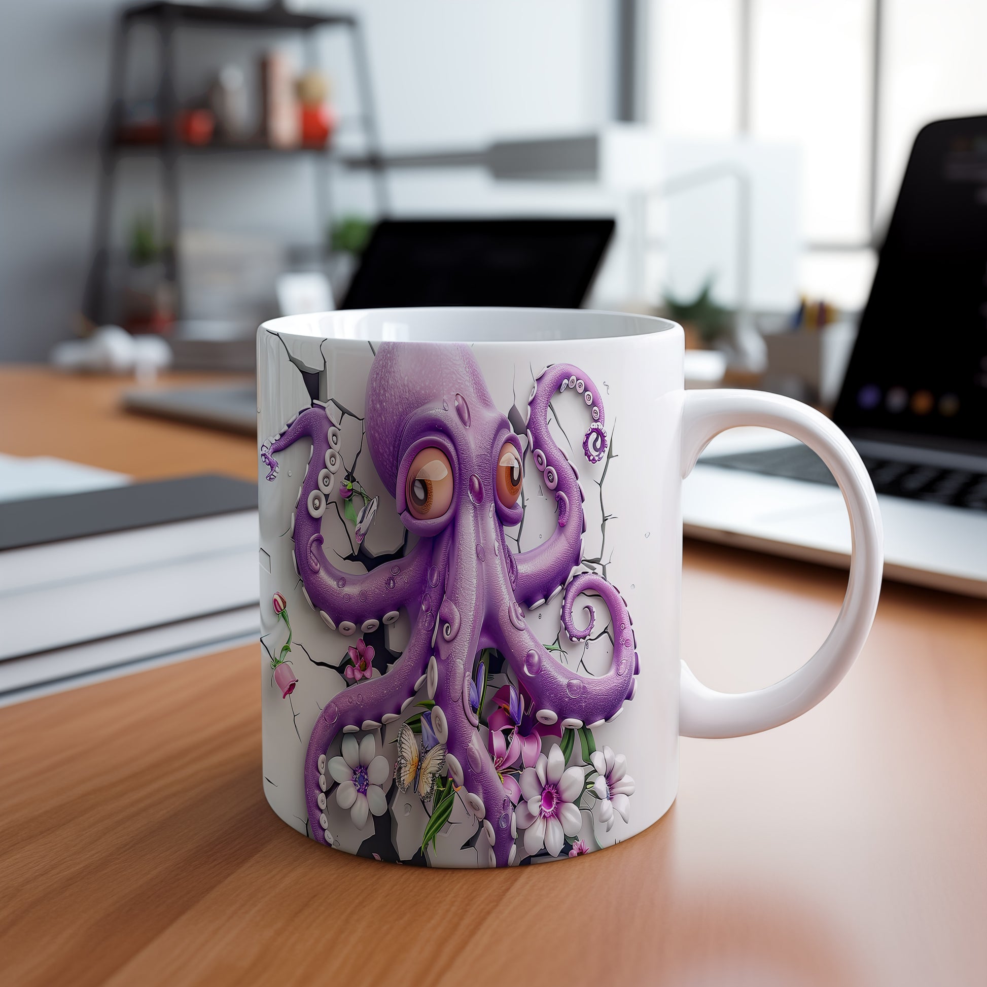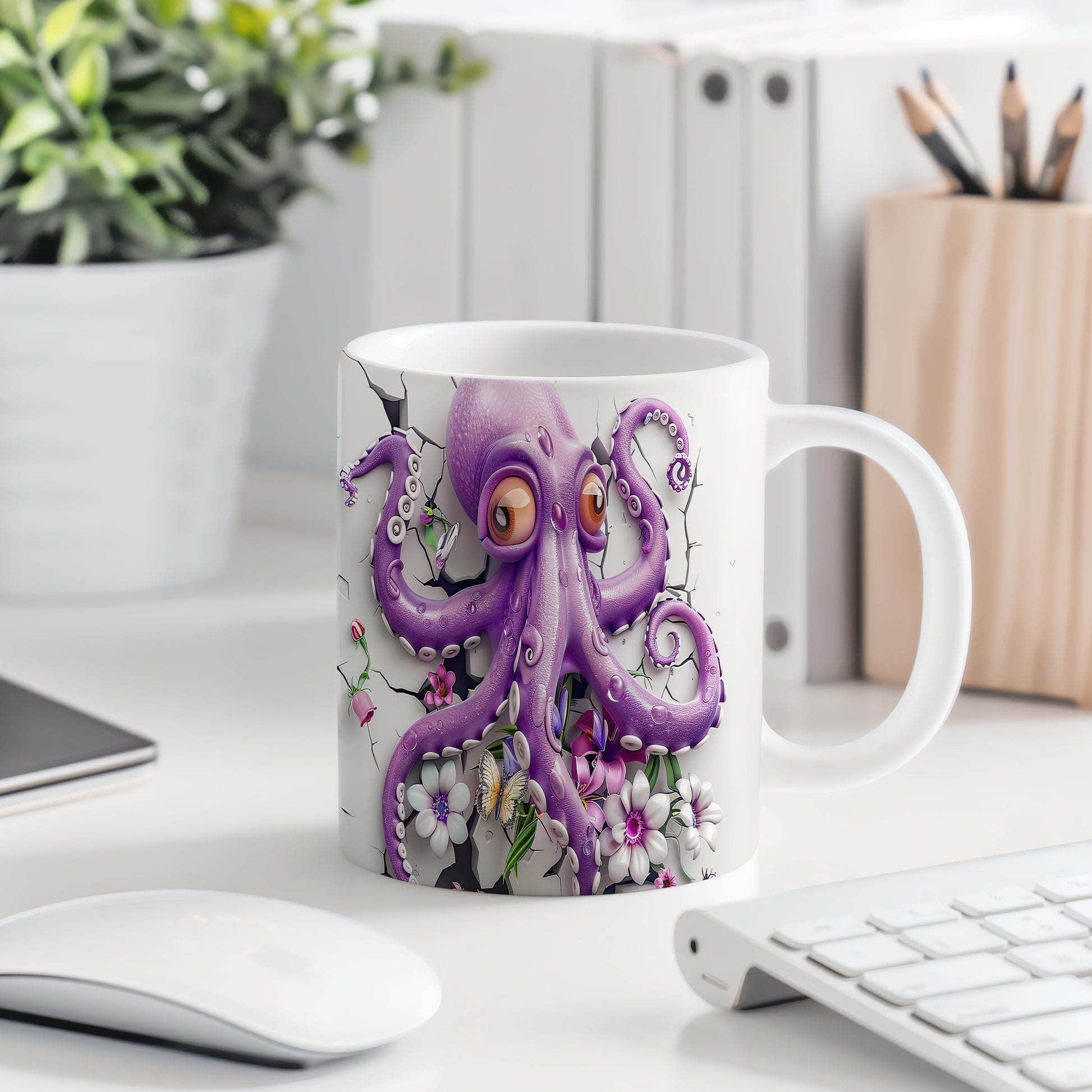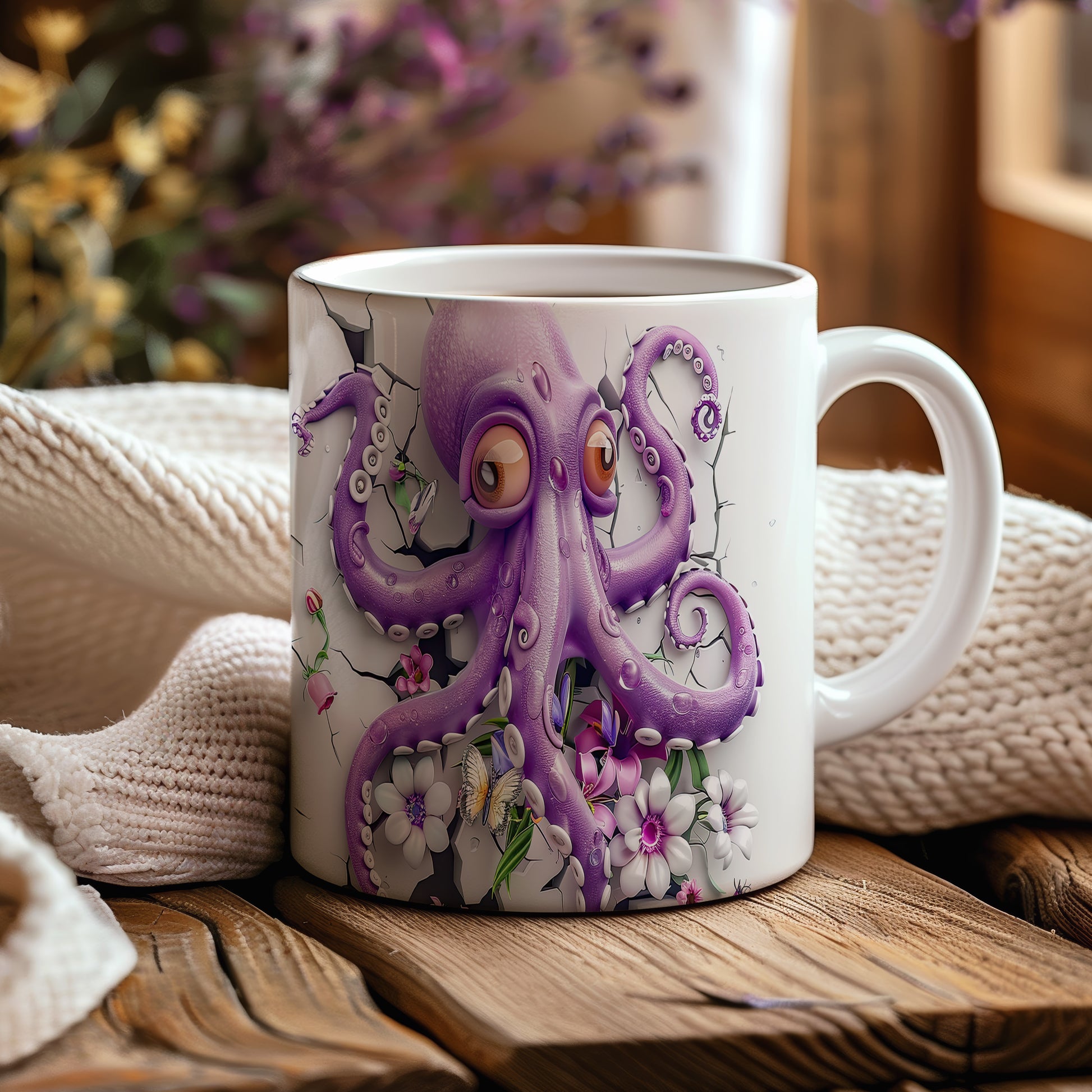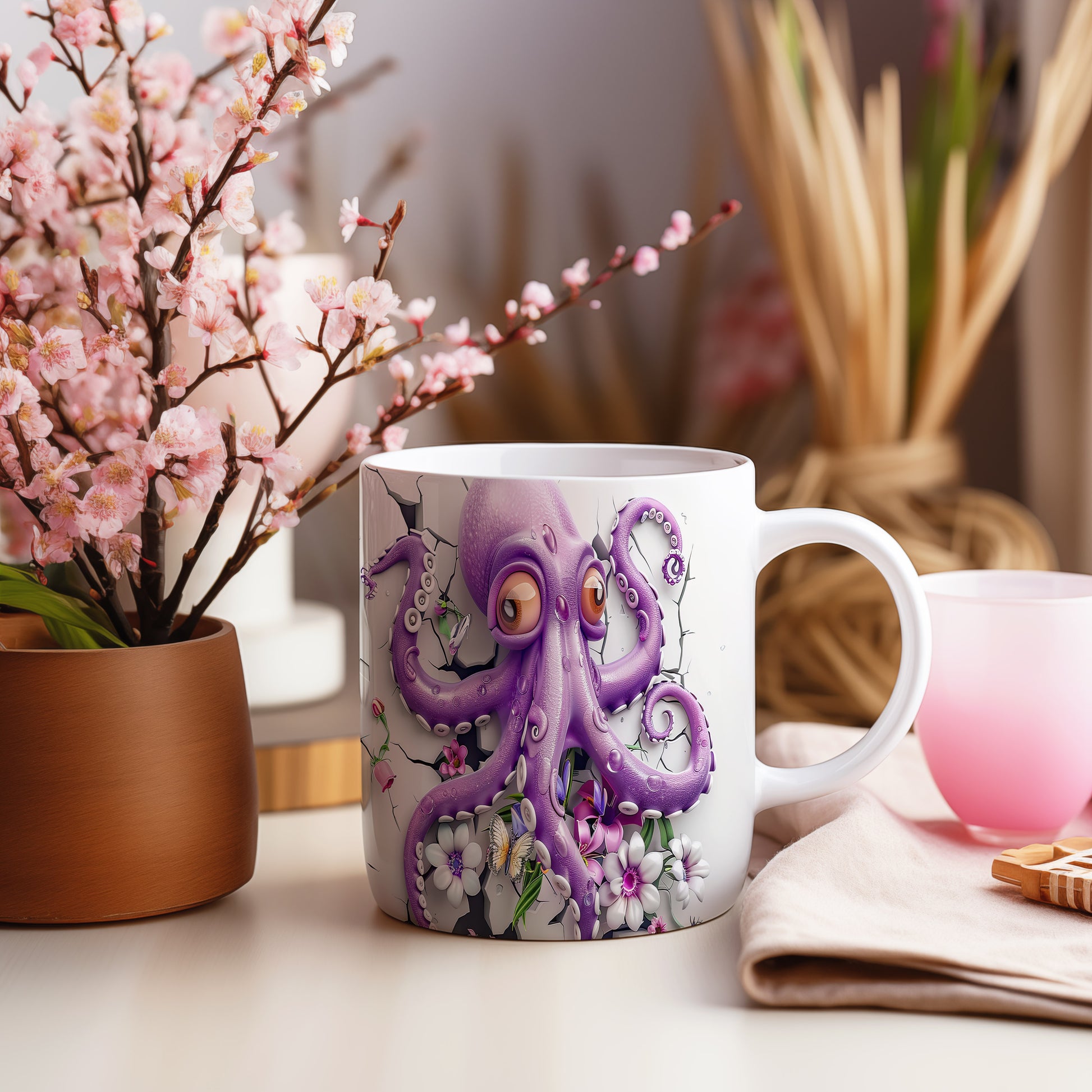 Hrnek s fialovou chobotnicí a květinami