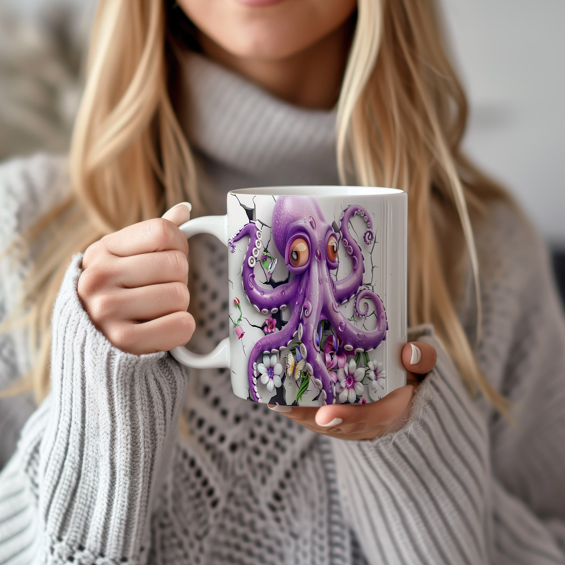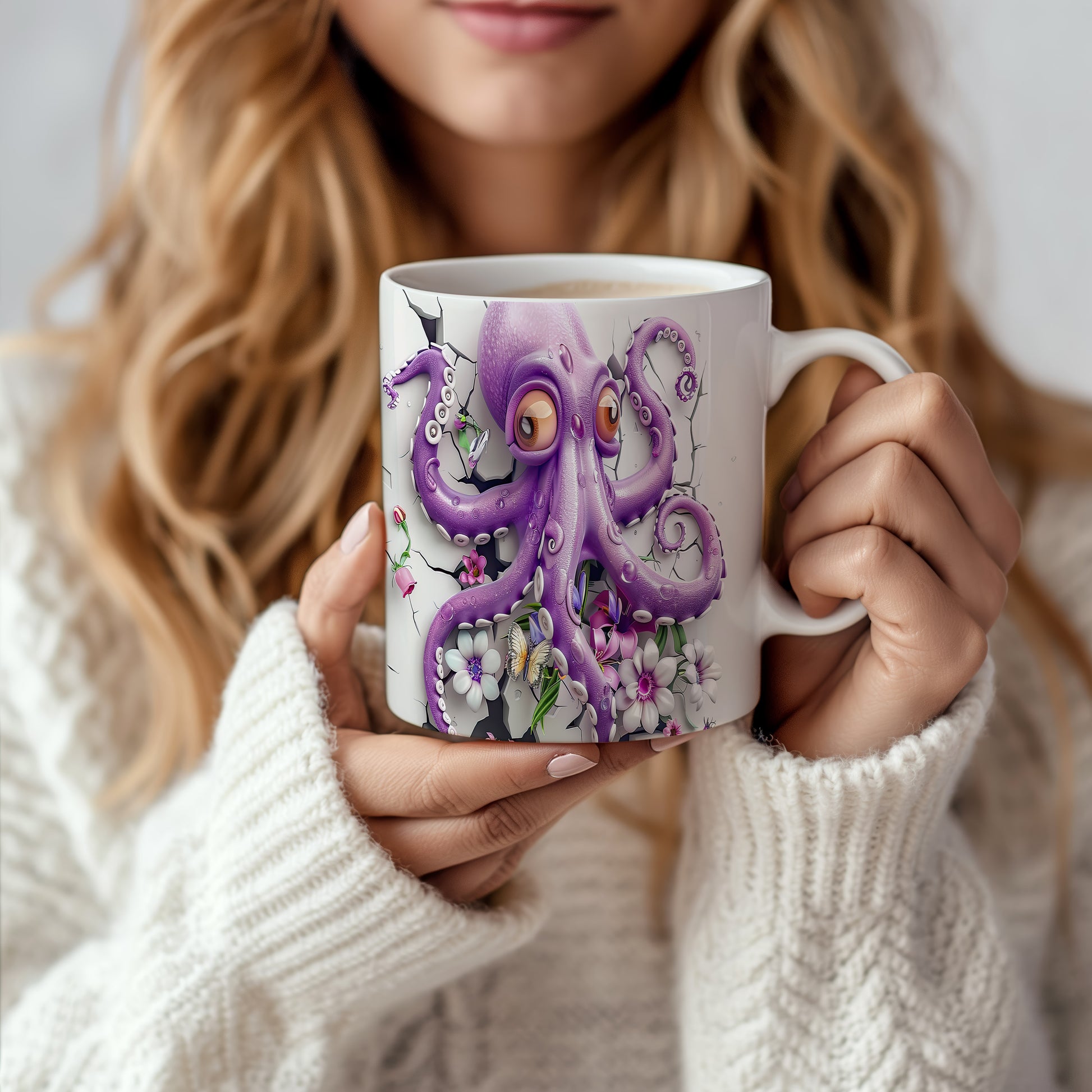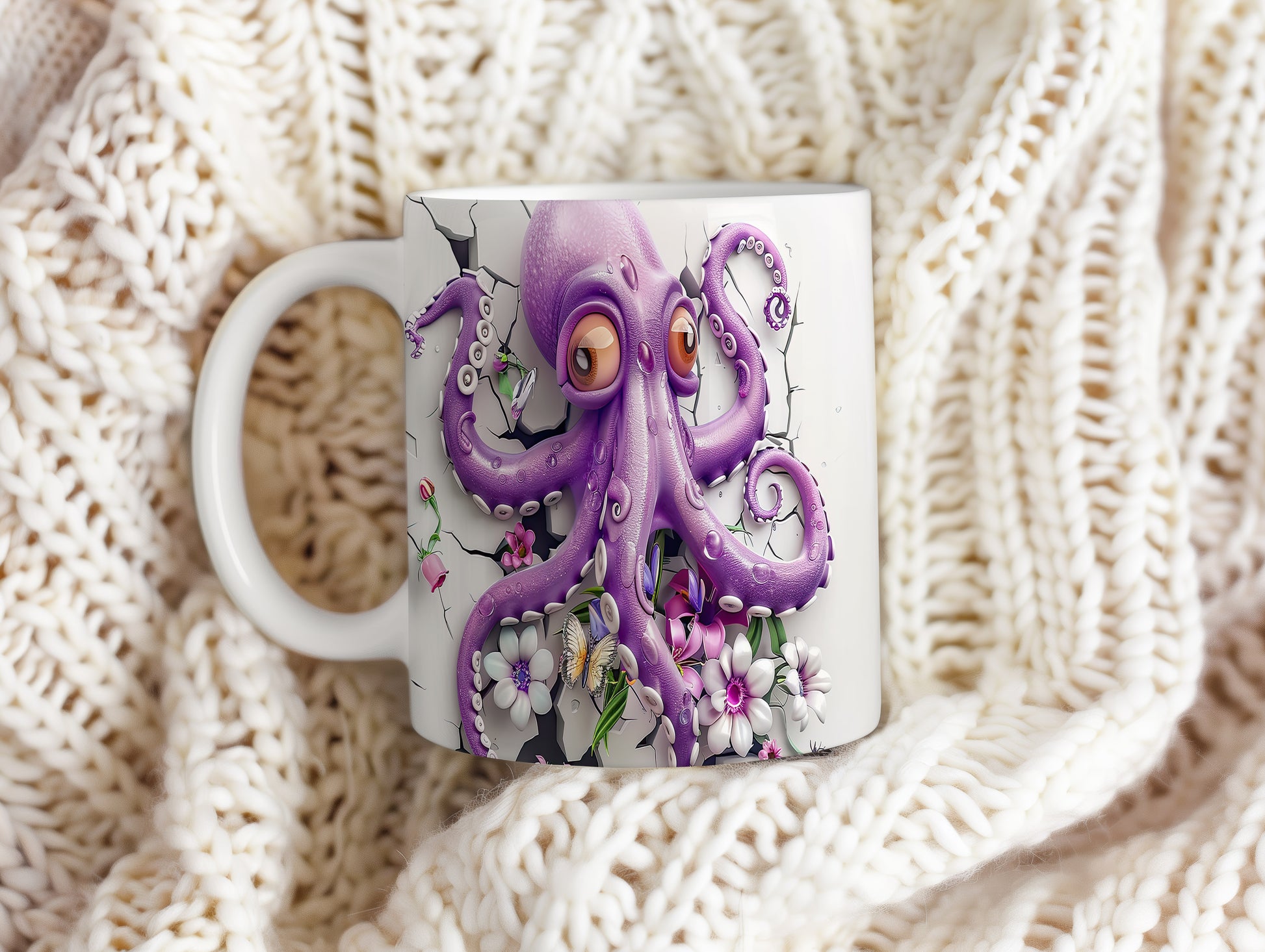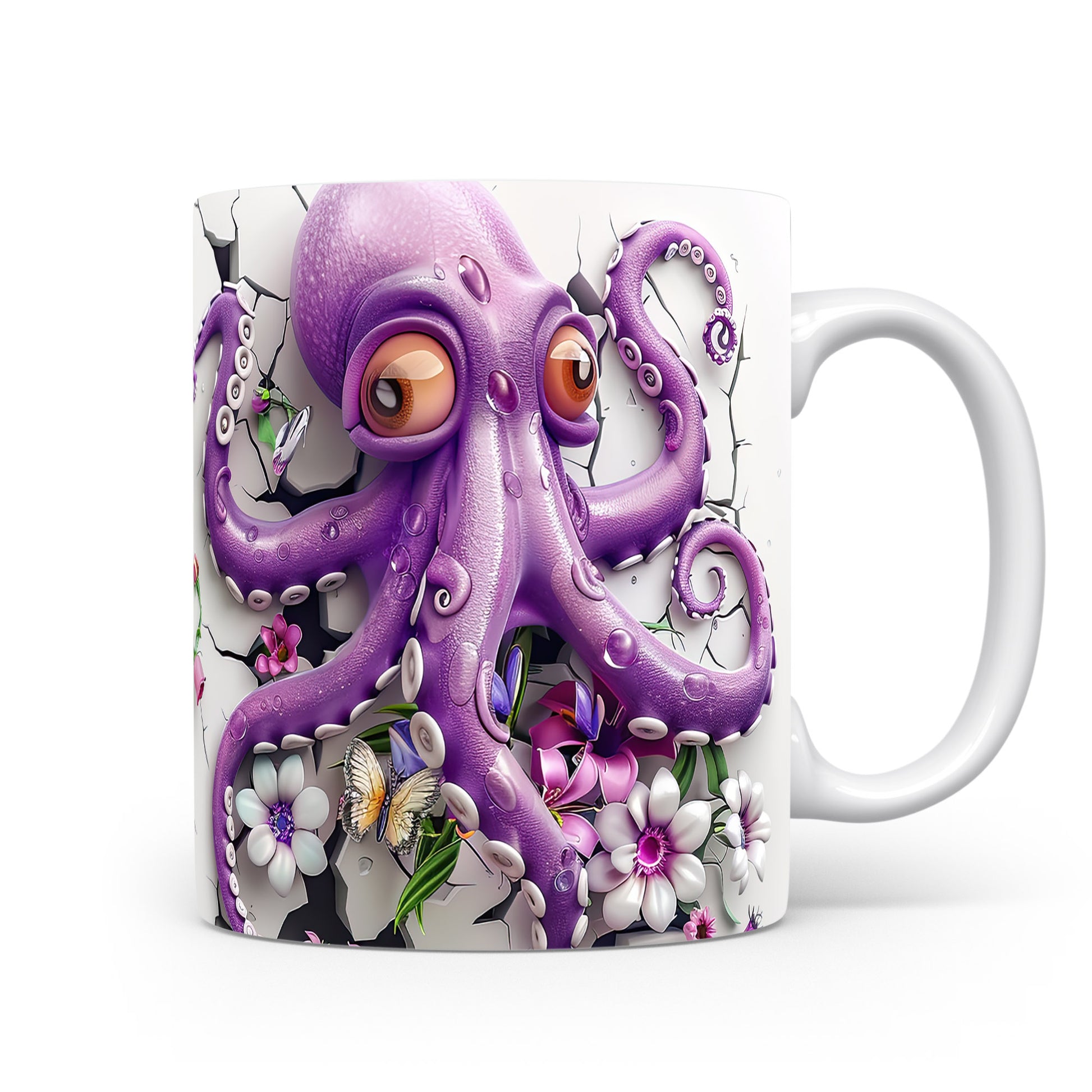 Hrnek s fialovou chobotnicí a květinami