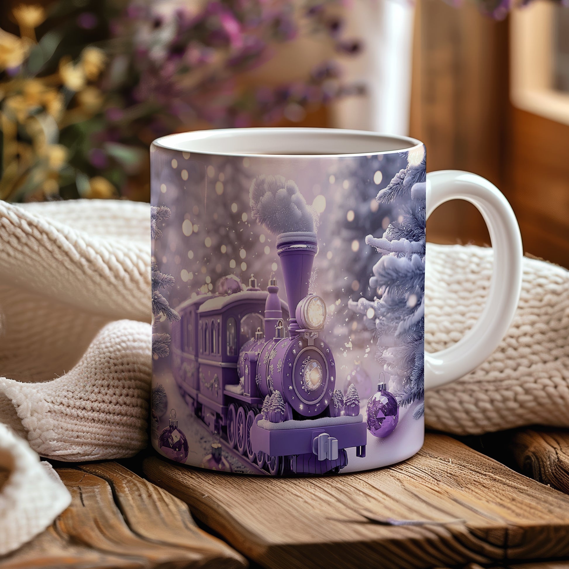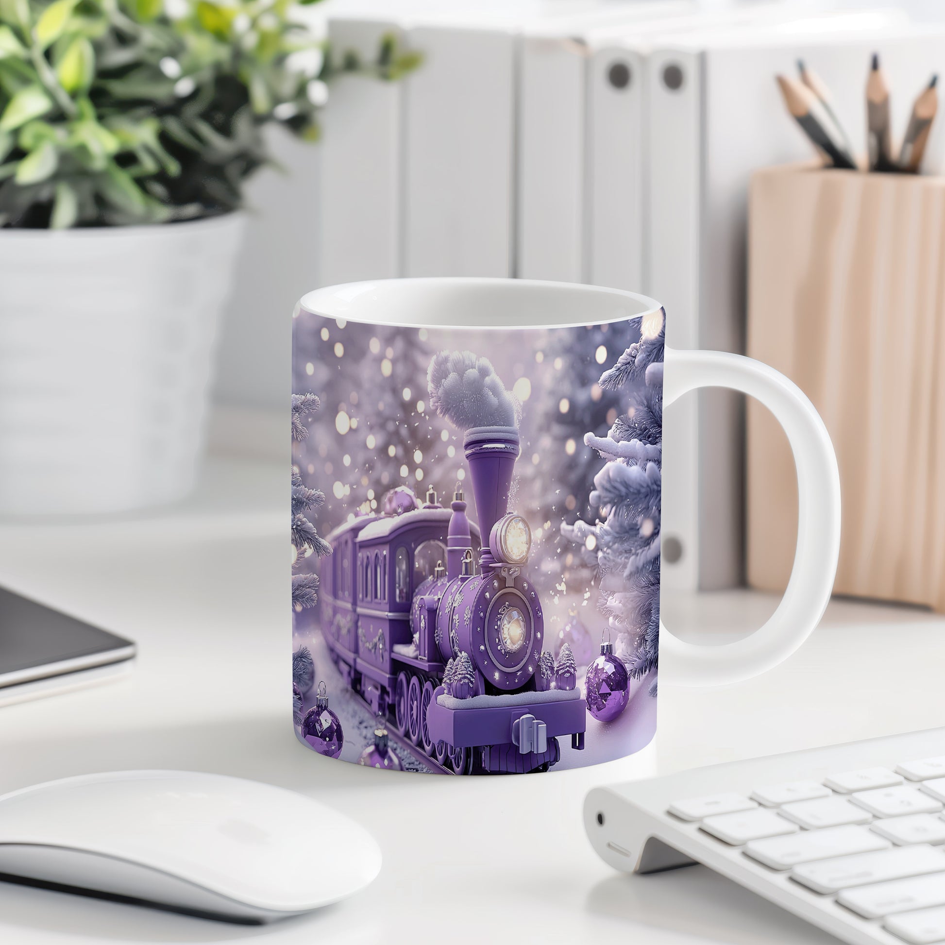 Keramický hrnek s motivem fialového vlaku v zasněžené krajině. Tento hrnek je ideální pro milovníky vlaků a zimní atmosféry, skvělý tip na dárek pro přátele nebo rodinu. Materiál: keramika. Objem: 330 ml. Vhodné do myčky i mikrovlnky. Příjemné používání a originální design přinesou radost do každodenního pití.
