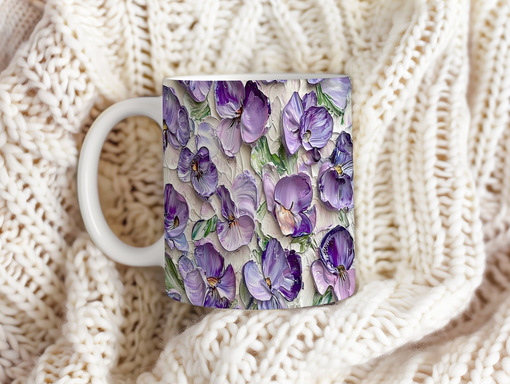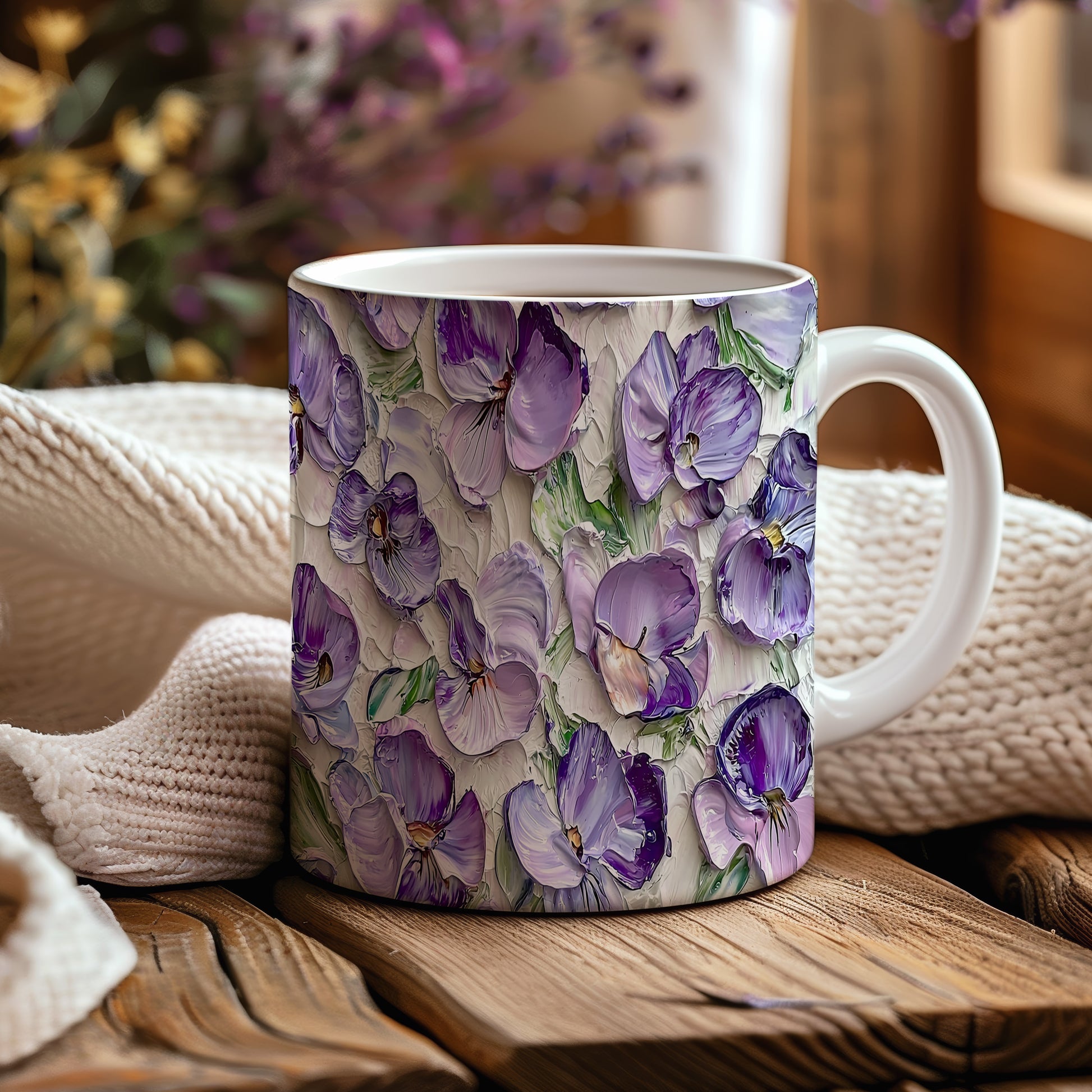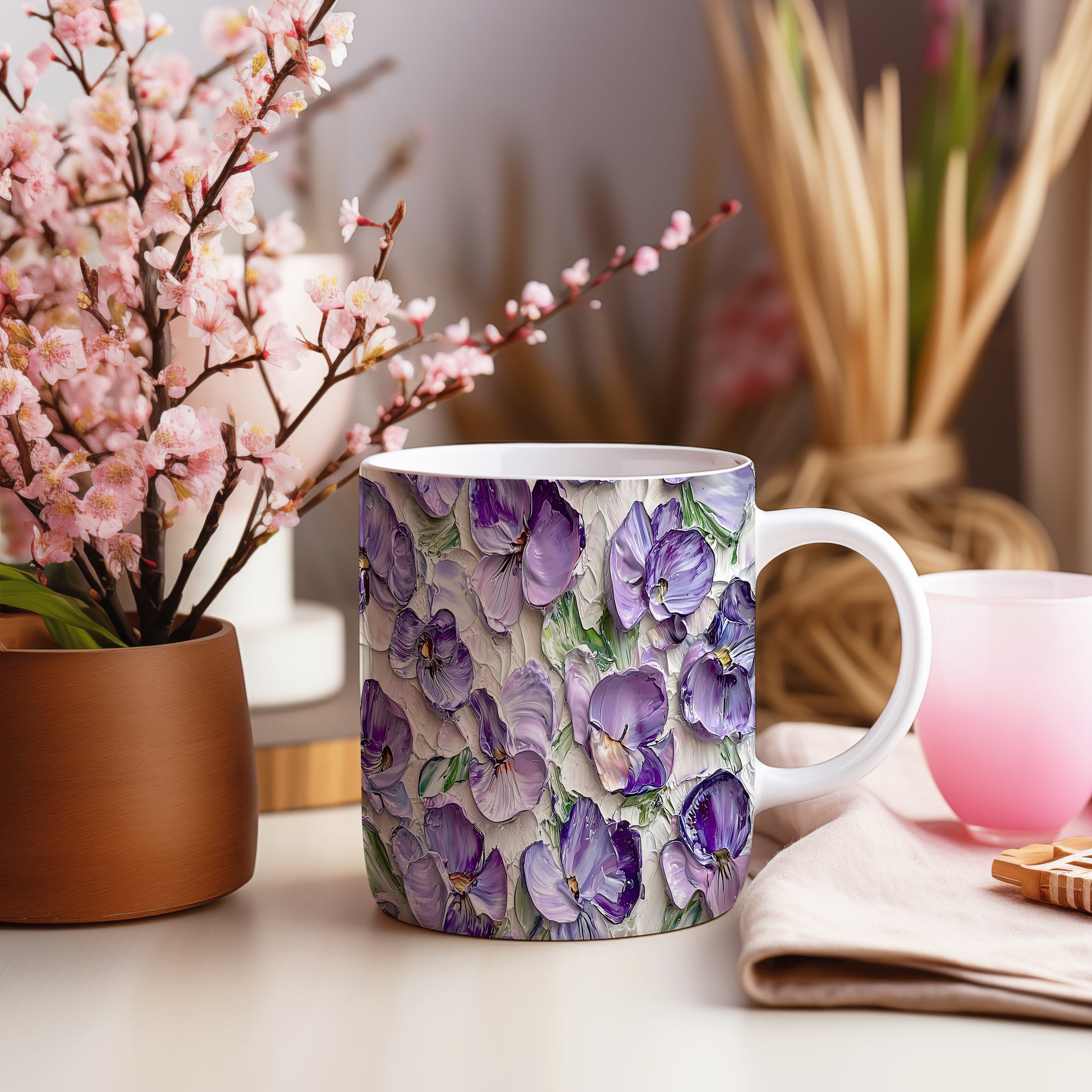 Hrnek s fialovými květinami – bílým provedením