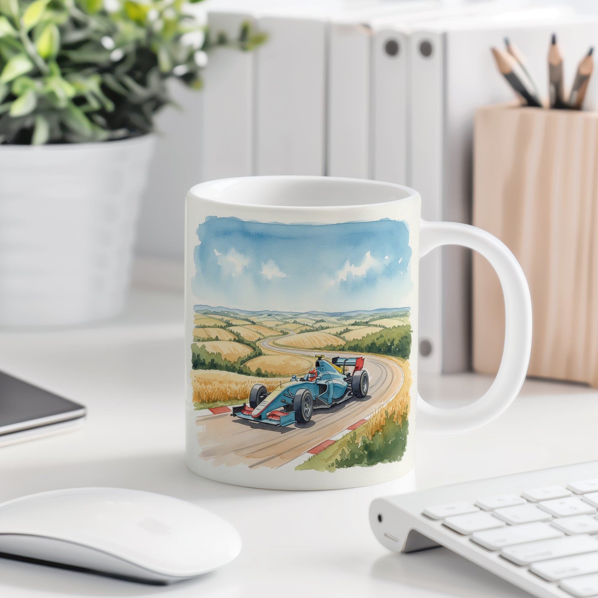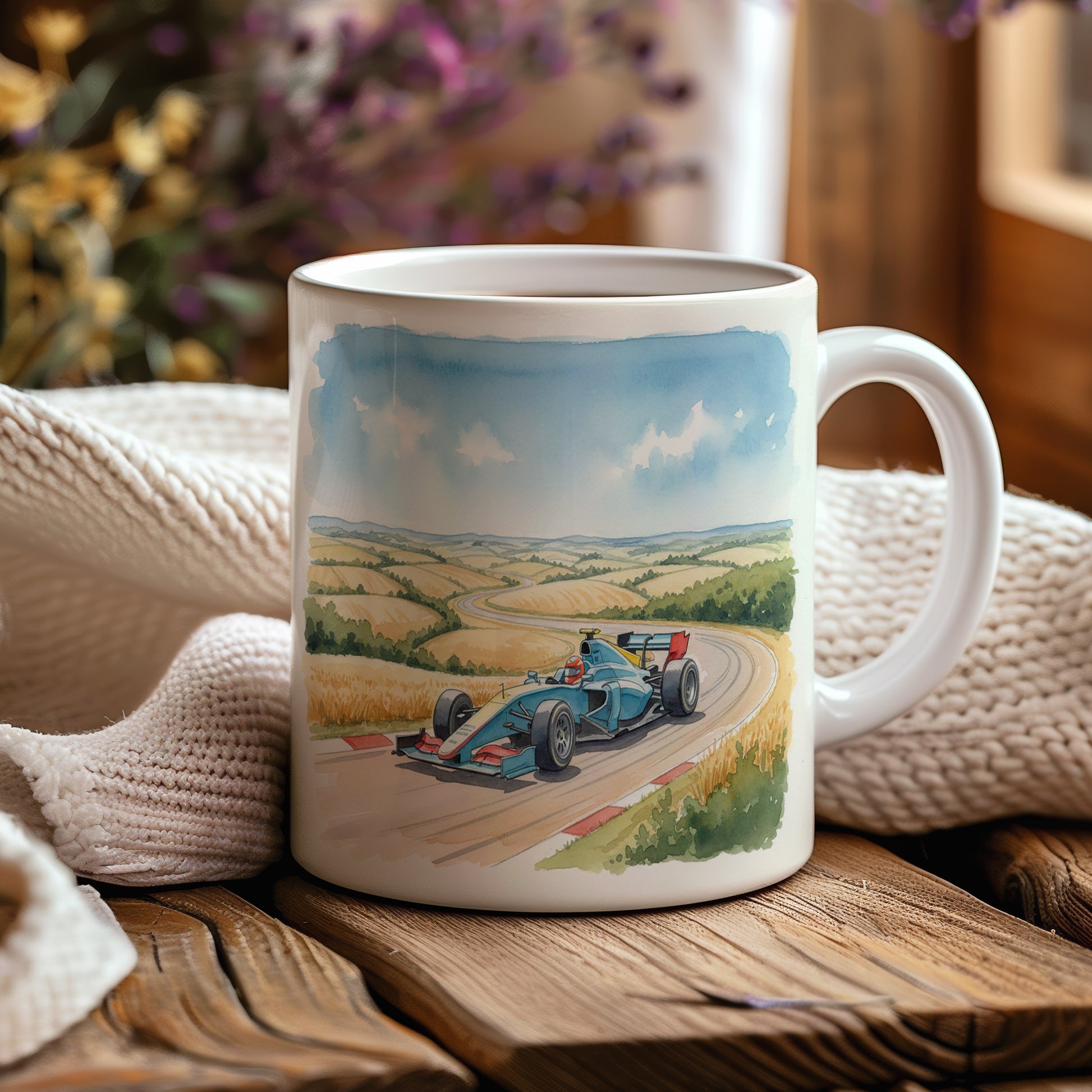 Užijte si rychlost a volnost s hrnkem, na kterém je akvarelově zachycena formule projíždějící malebnou venkovskou krajinou. Hrnek 330 ml – vhodný do myčky i mikrovlnky.