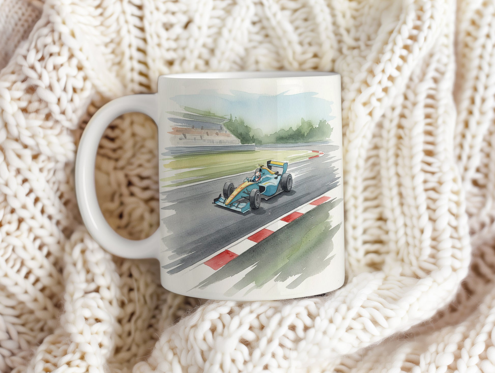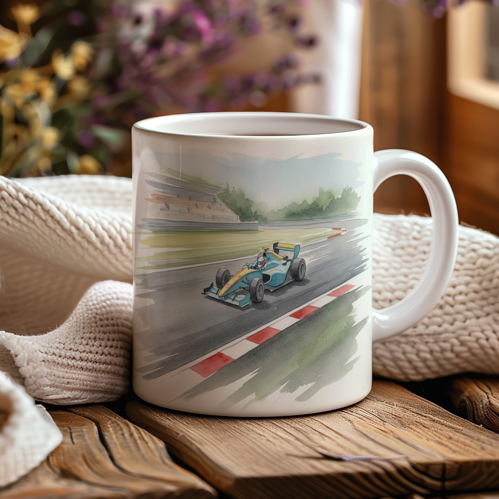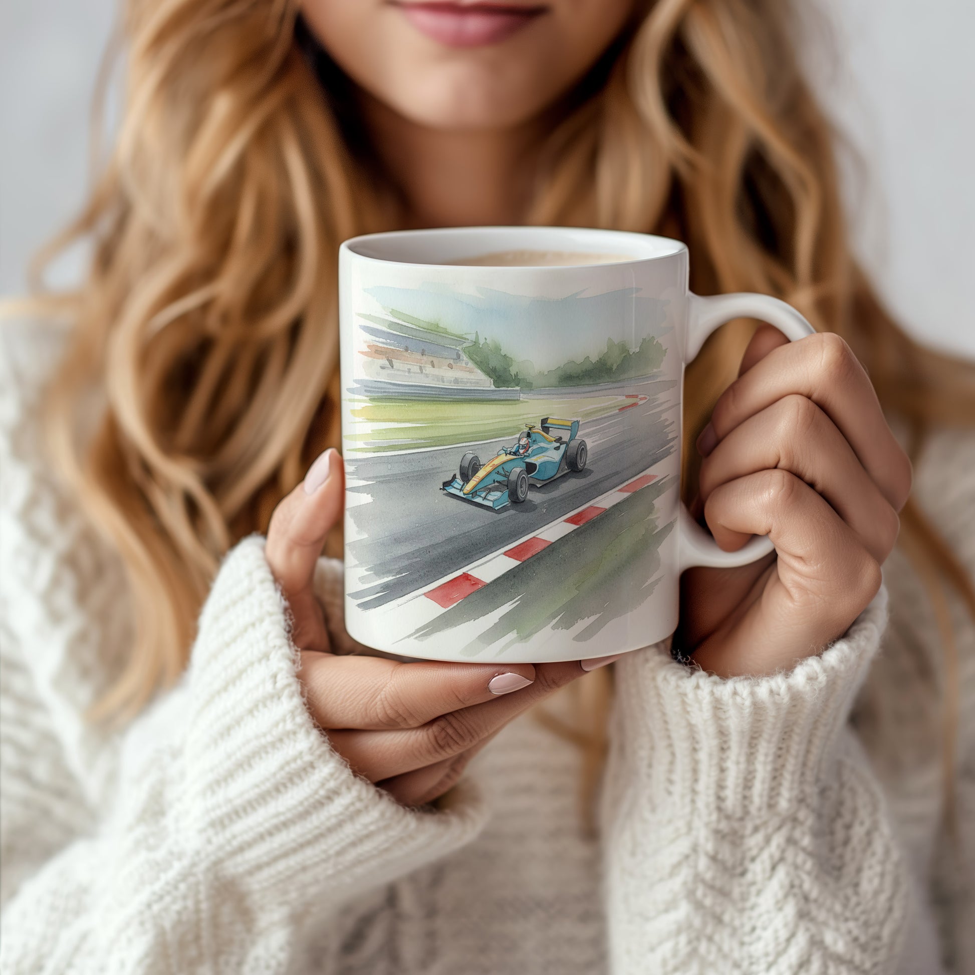 Objevte rychlost a adrenalin s hrnkem, který zobrazuje akvarelovou formuli na závodní dráze. Skvělý společník na každé ráno.
