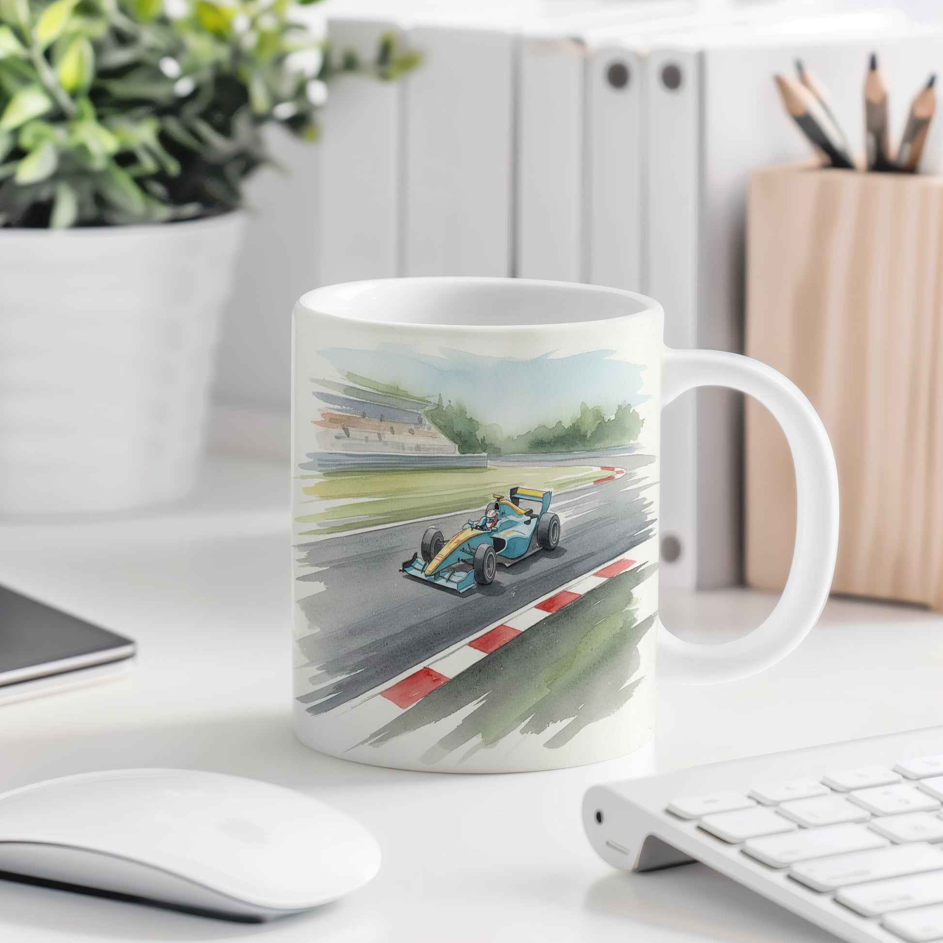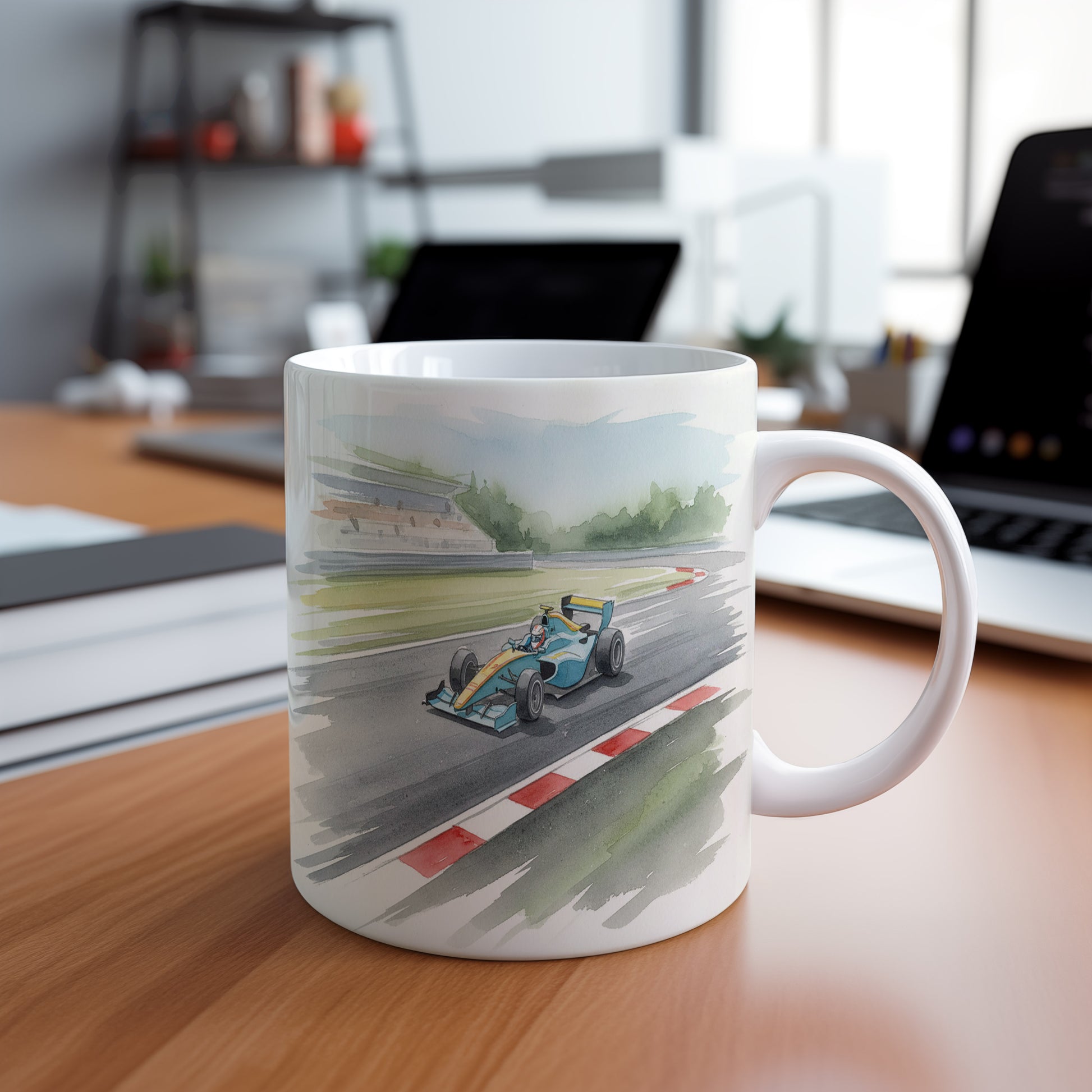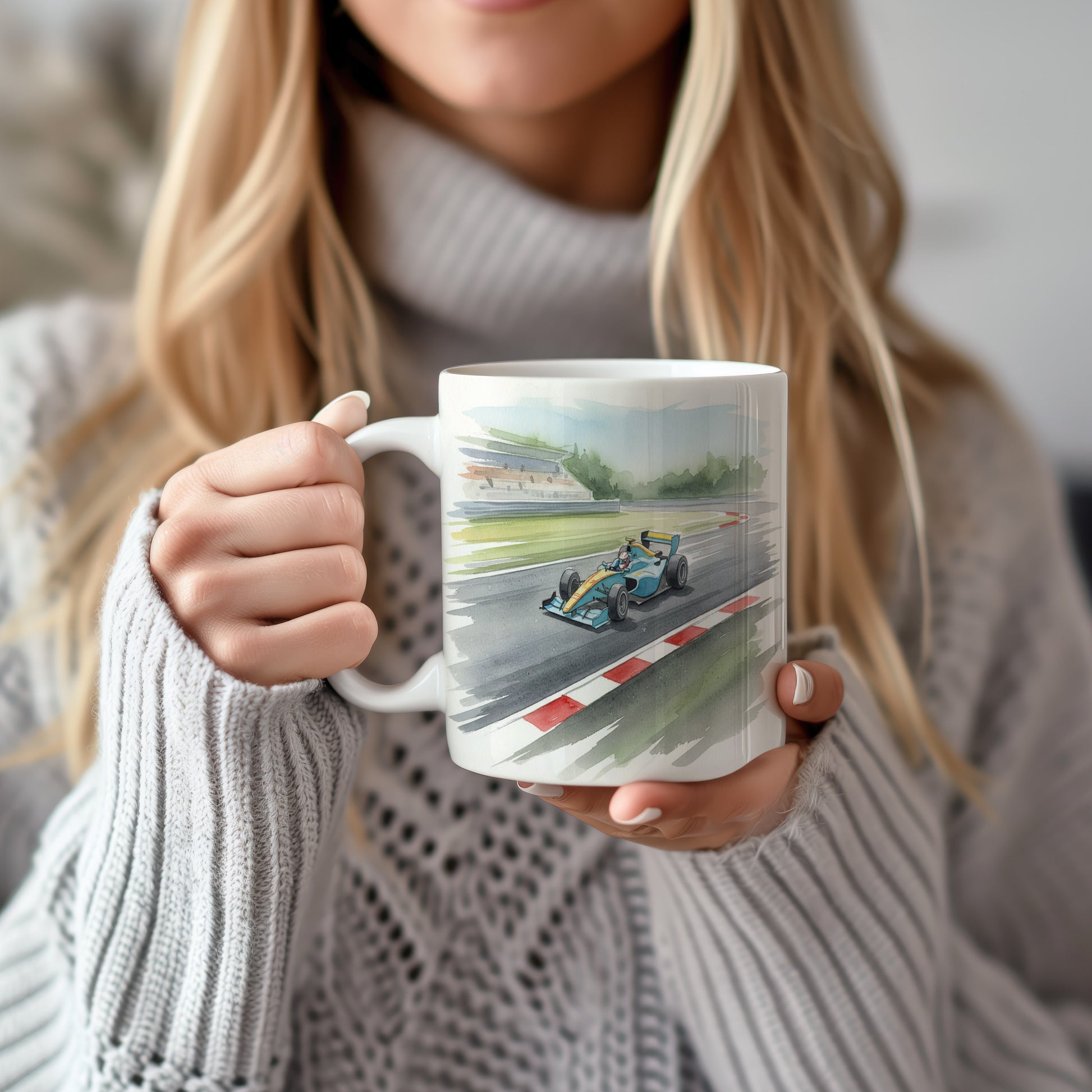 Objevte rychlost a adrenalin s hrnkem, který zobrazuje akvarelovou formuli na závodní dráze. Skvělý společník na každé ráno.
