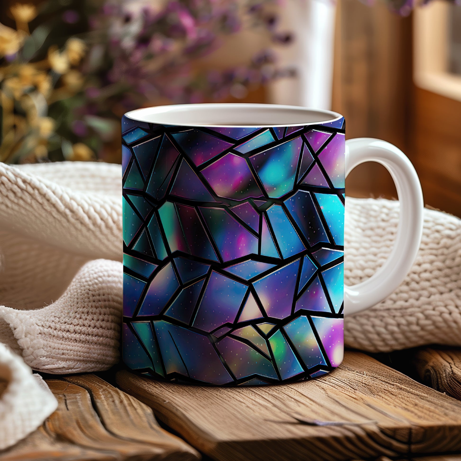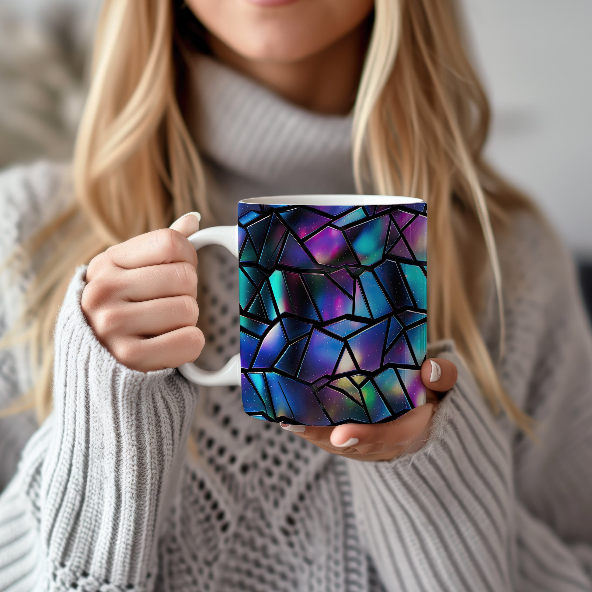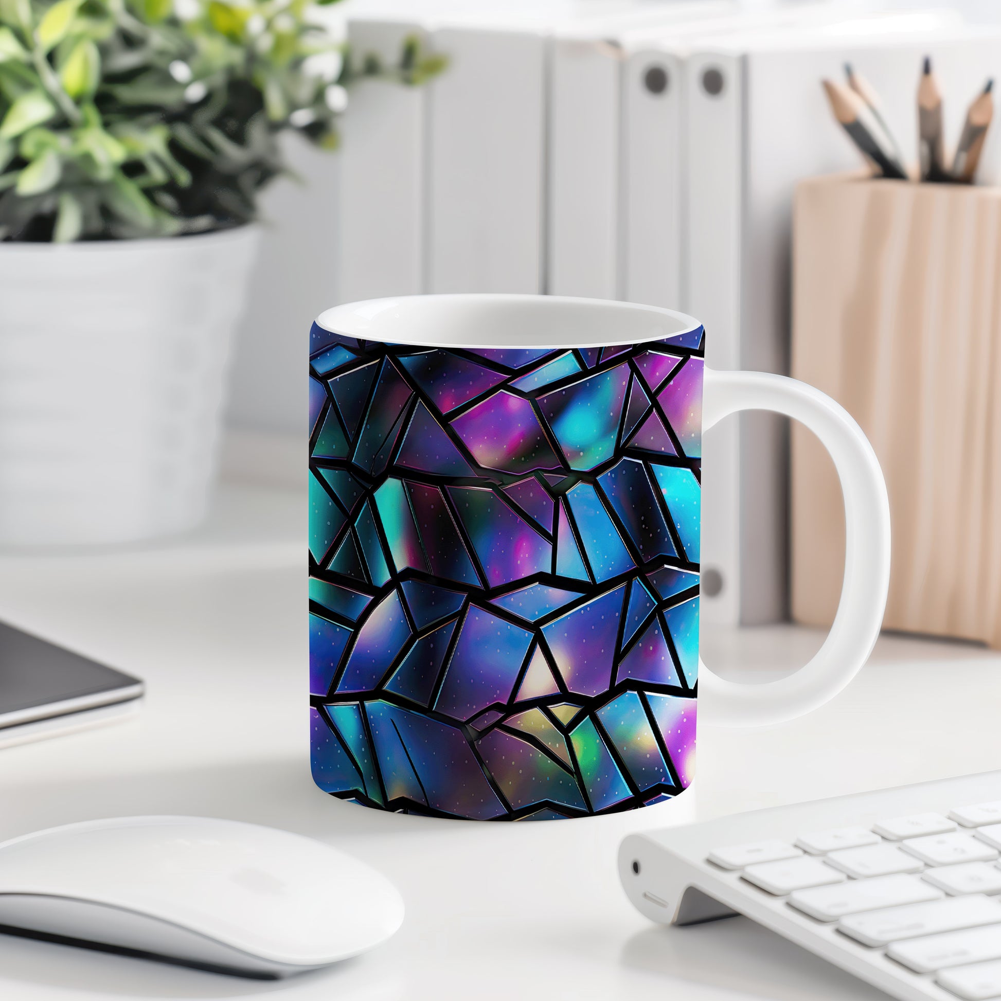 Hrnek s geometrickou mozaikou v modrých a fialových tónech