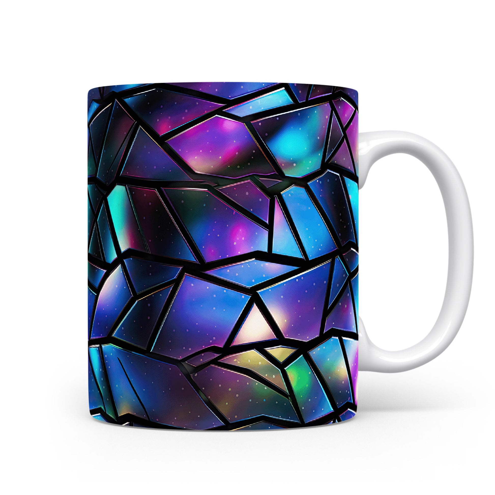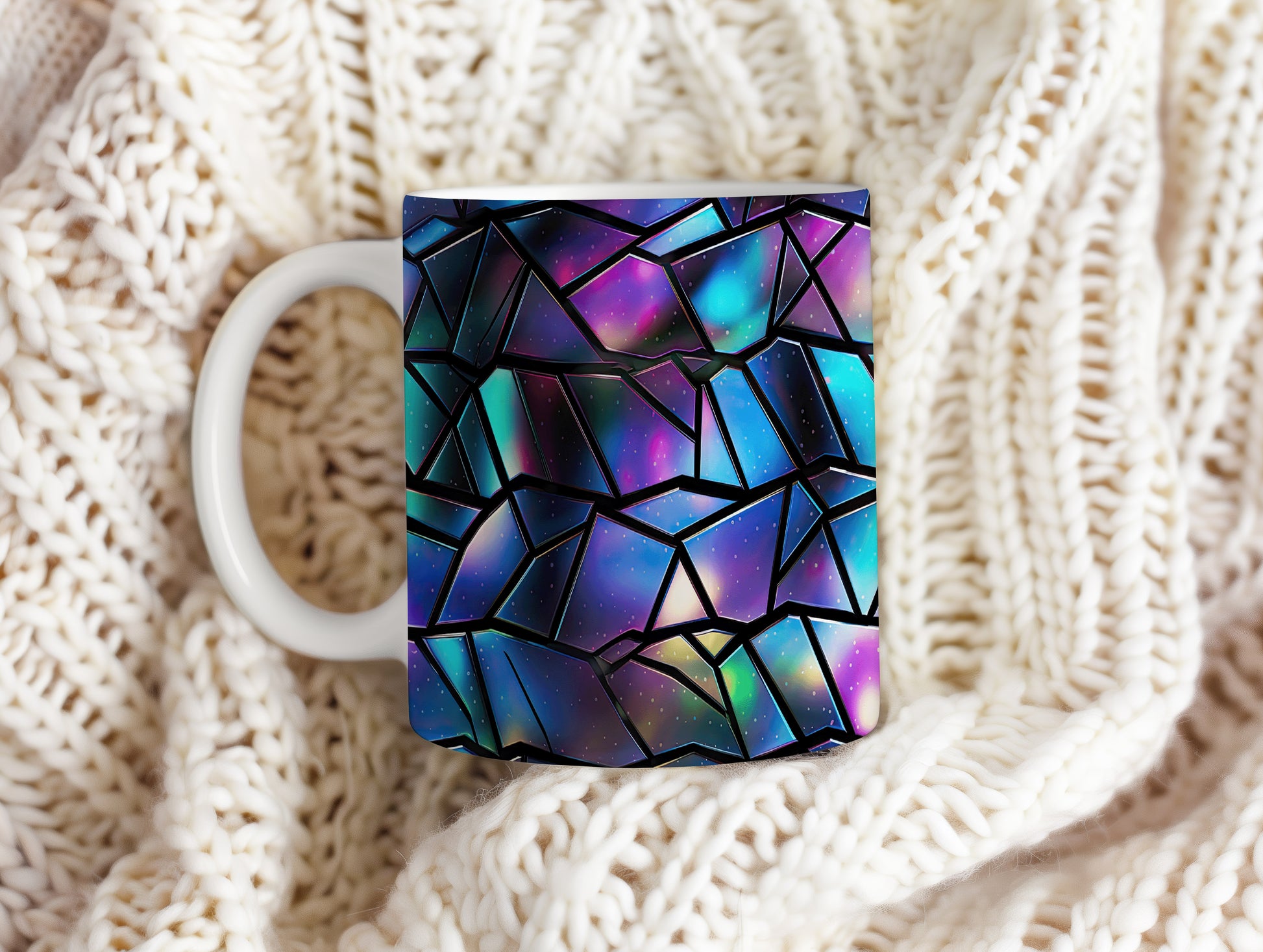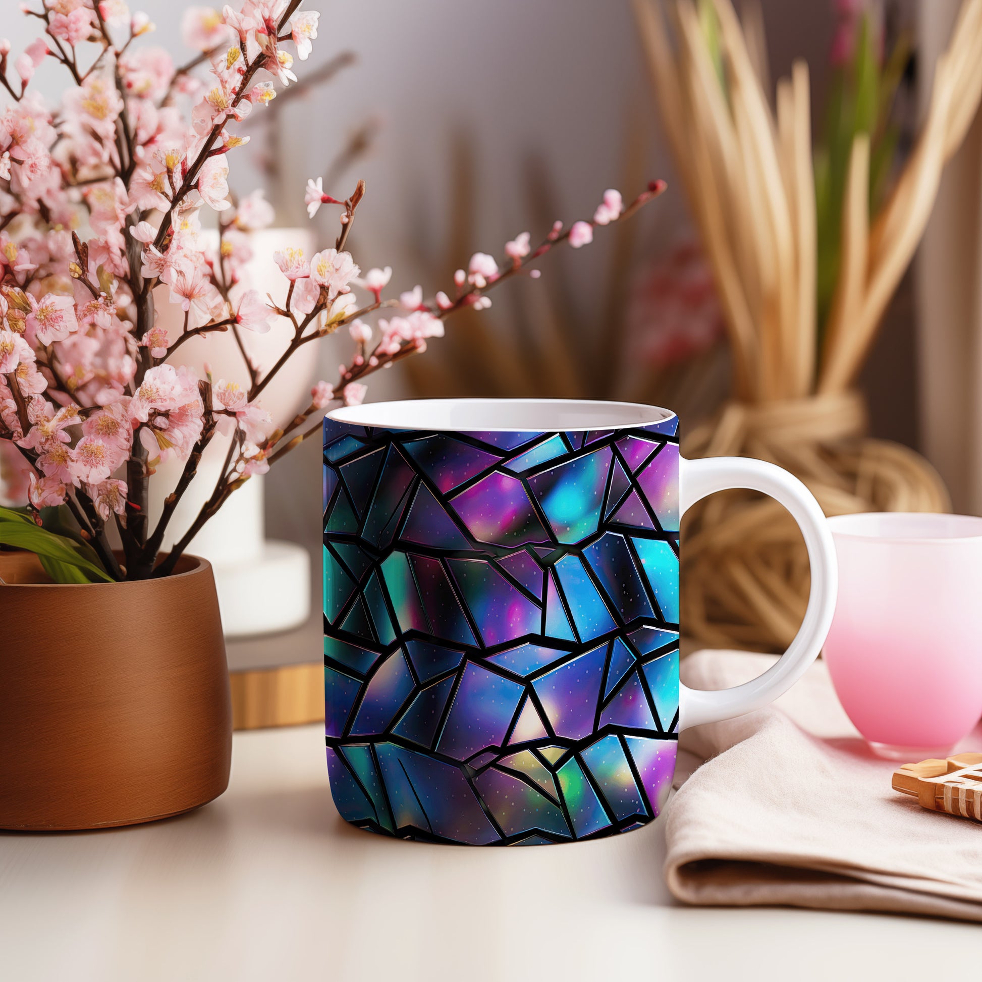 Hrnek s geometrickou mozaikou v modrých a fialových tónech