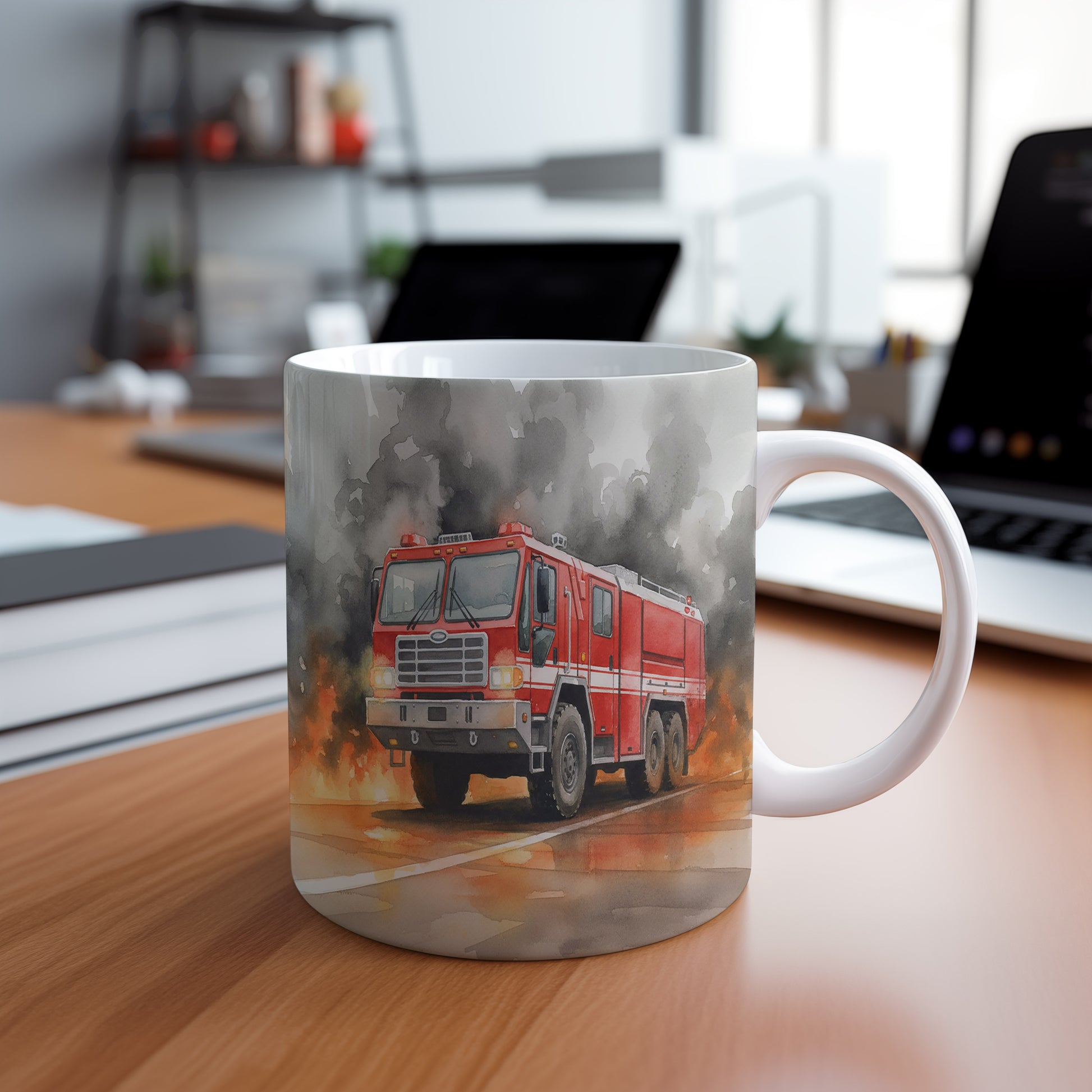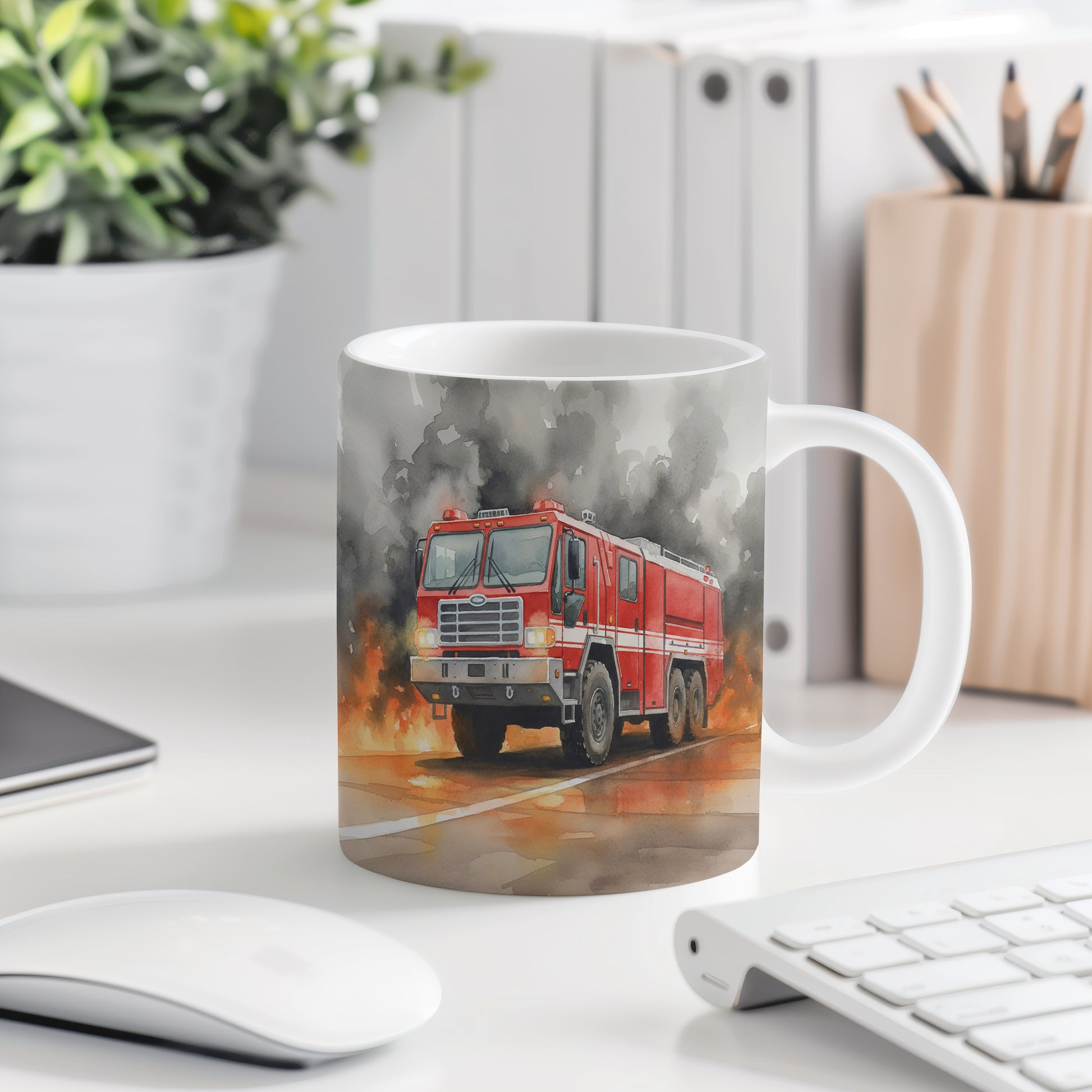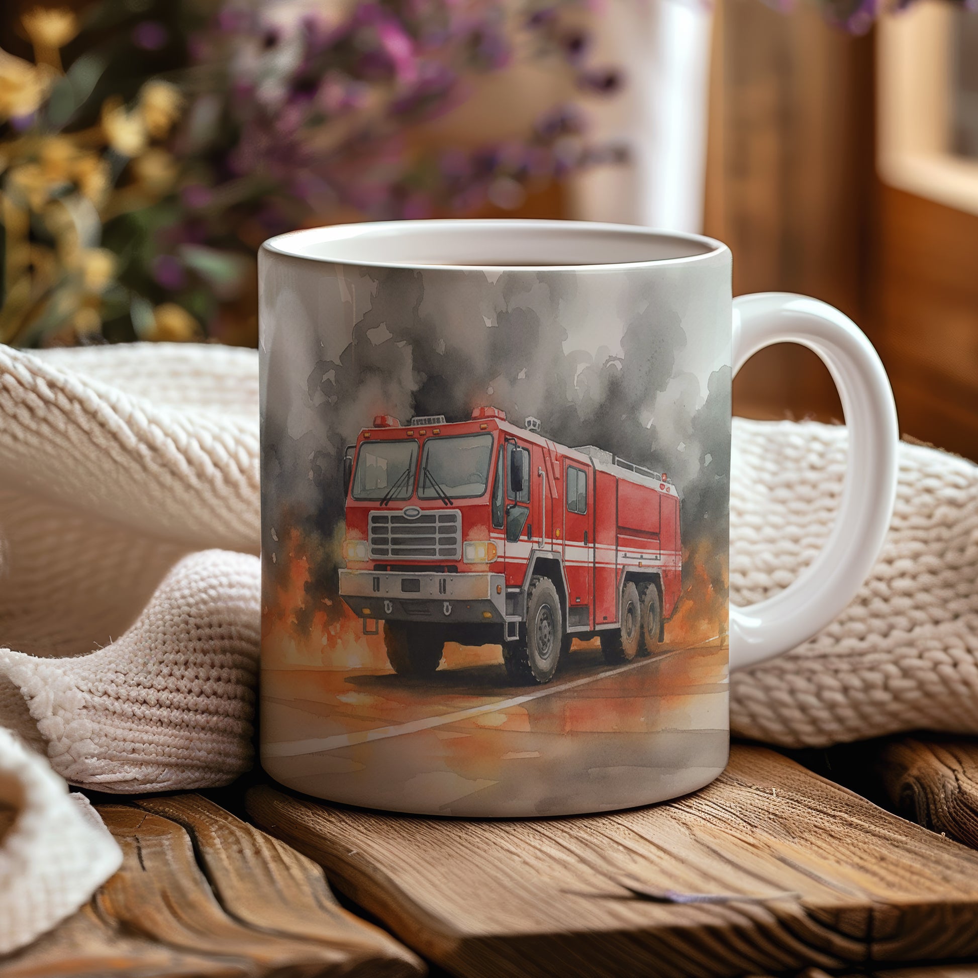 Tento hrnek zobrazuje dramatickou scénu s hasičským vozem v akvarelu, který bojuje s plameny. Skvělý pro milovníky hrdinských příběhů. Hrnek 330 ml – vhodný do myčky i mikrovlnky.