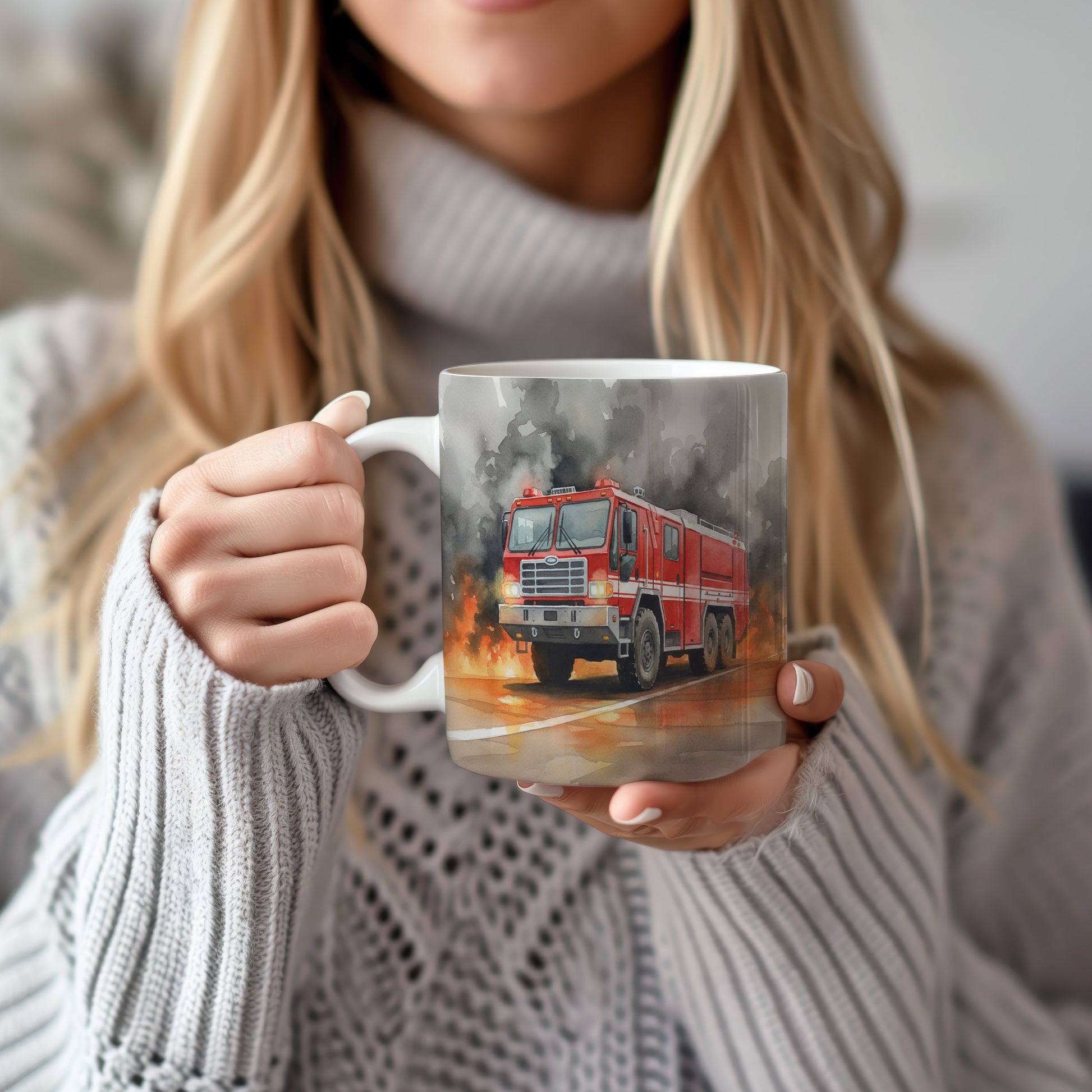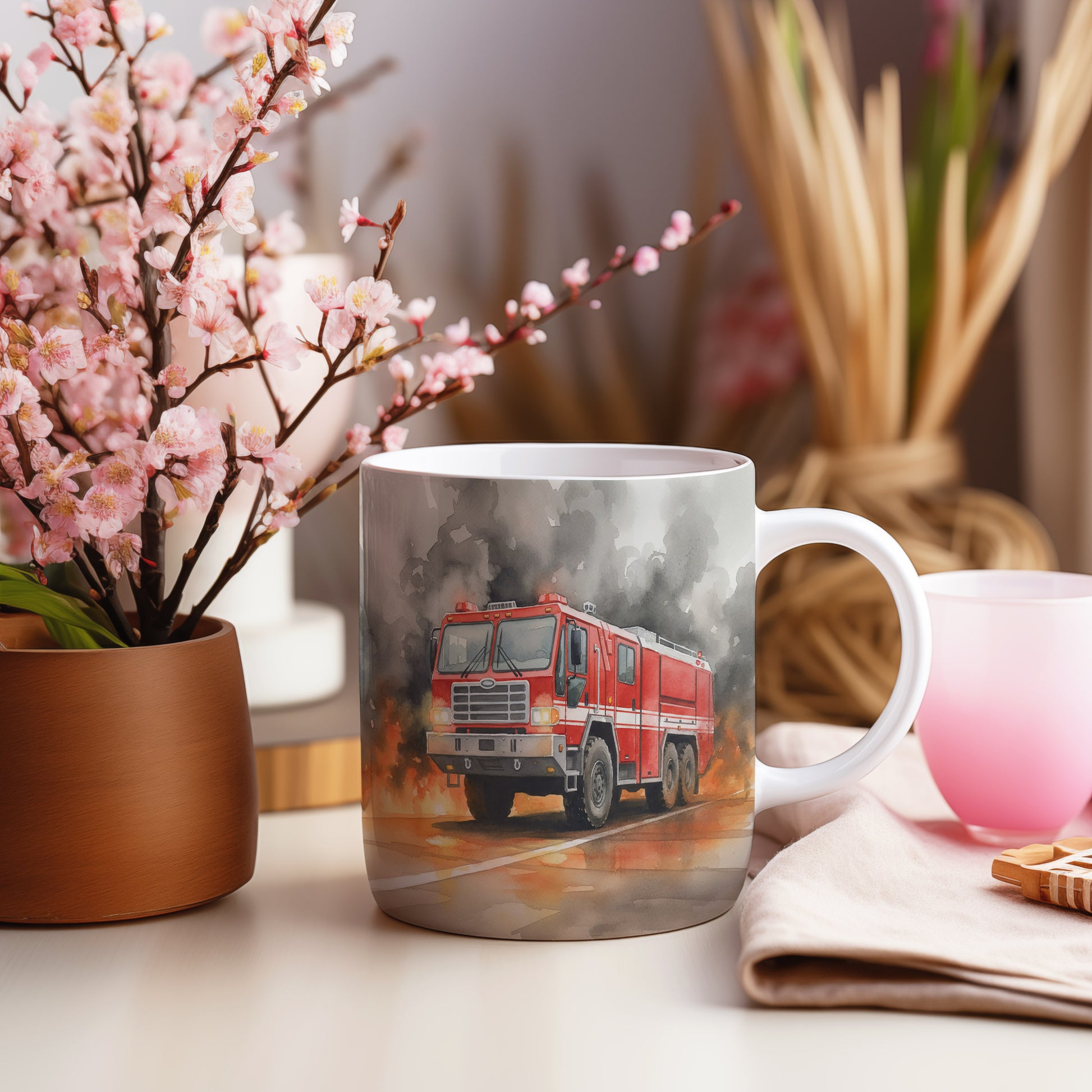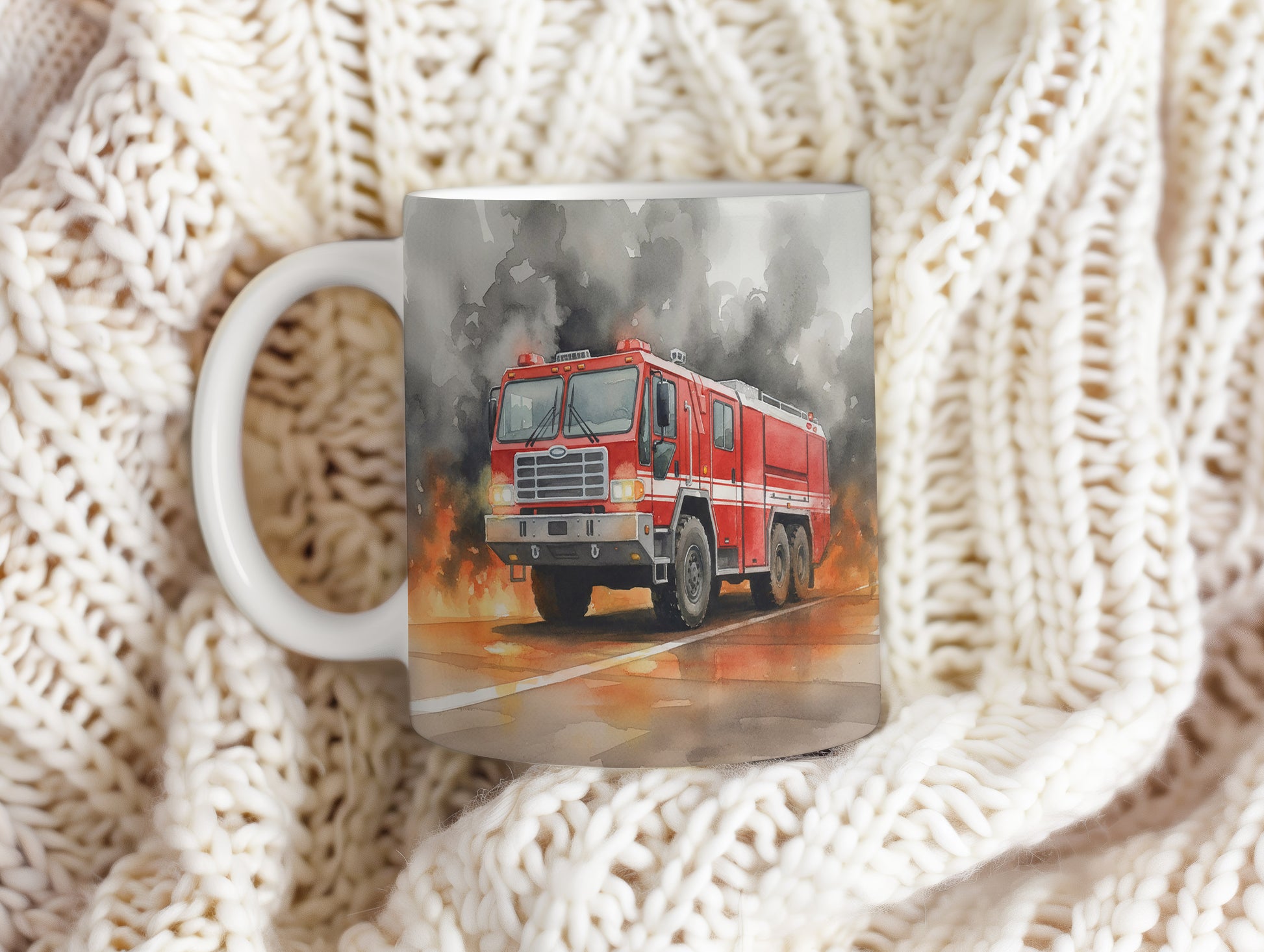 Tento hrnek zobrazuje dramatickou scénu s hasičským vozem v akvarelu, který bojuje s plameny. Skvělý pro milovníky hrdinských příběhů. Hrnek 330 ml – vhodný do myčky i mikrovlnky.