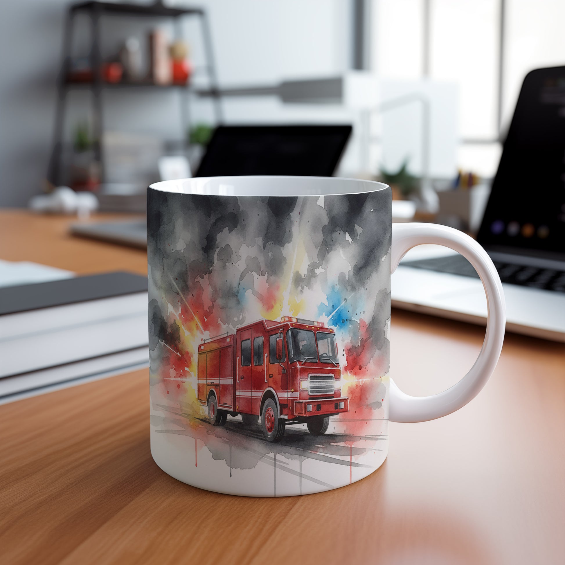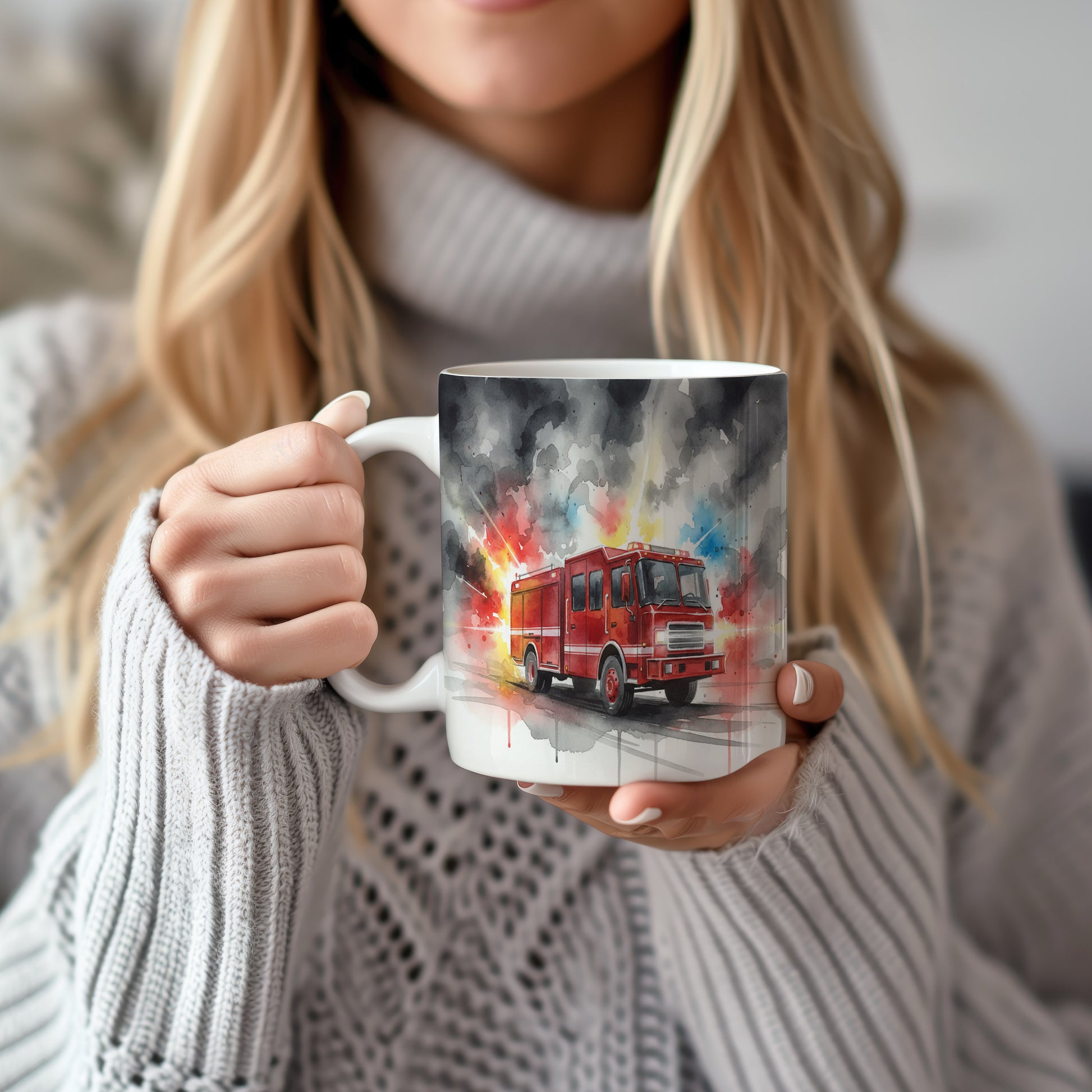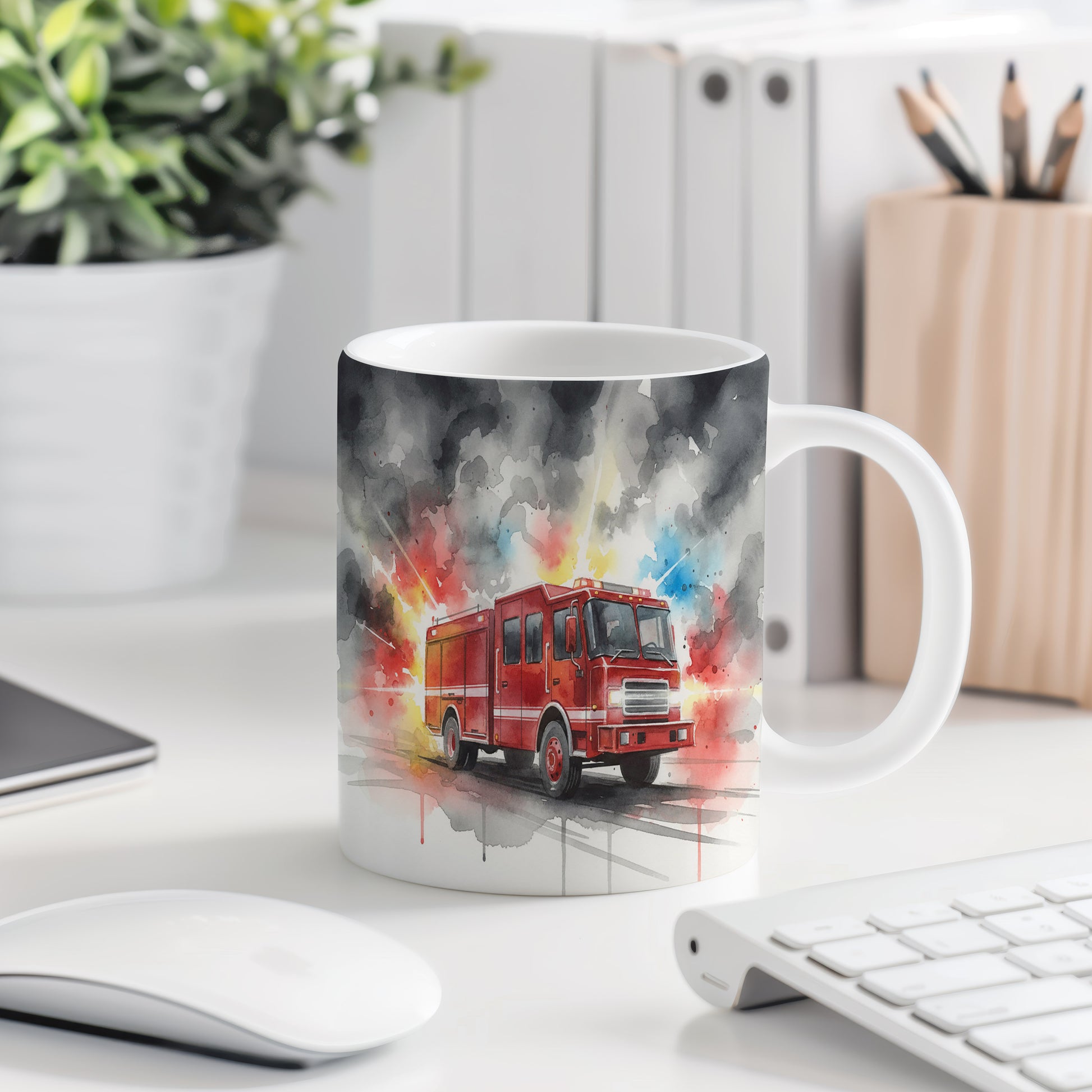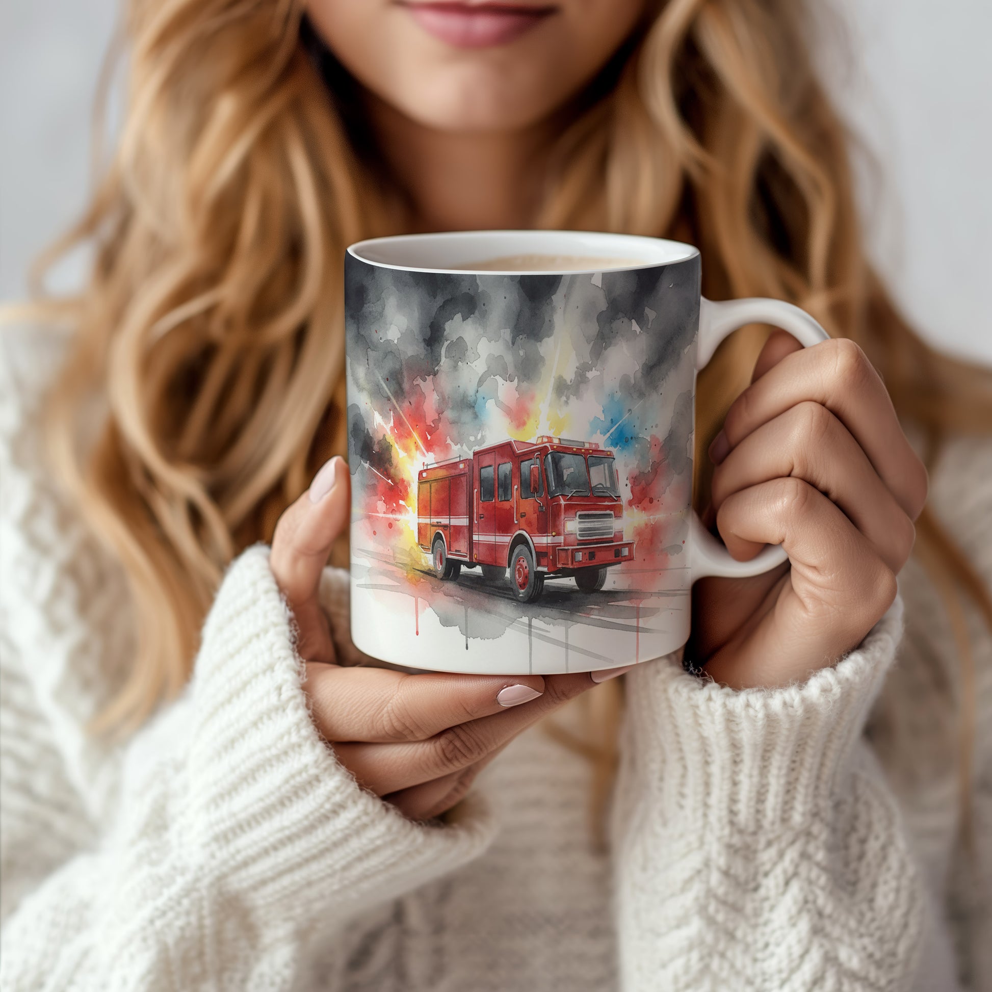 Užijte si pohled na dramatickou scénu s hasičským vozem v akvarelovém stylu. Ideální pro milovníky adrenalinu. Hrnek 330 ml – vhodný do myčky i mikrovlnky.